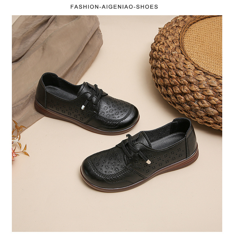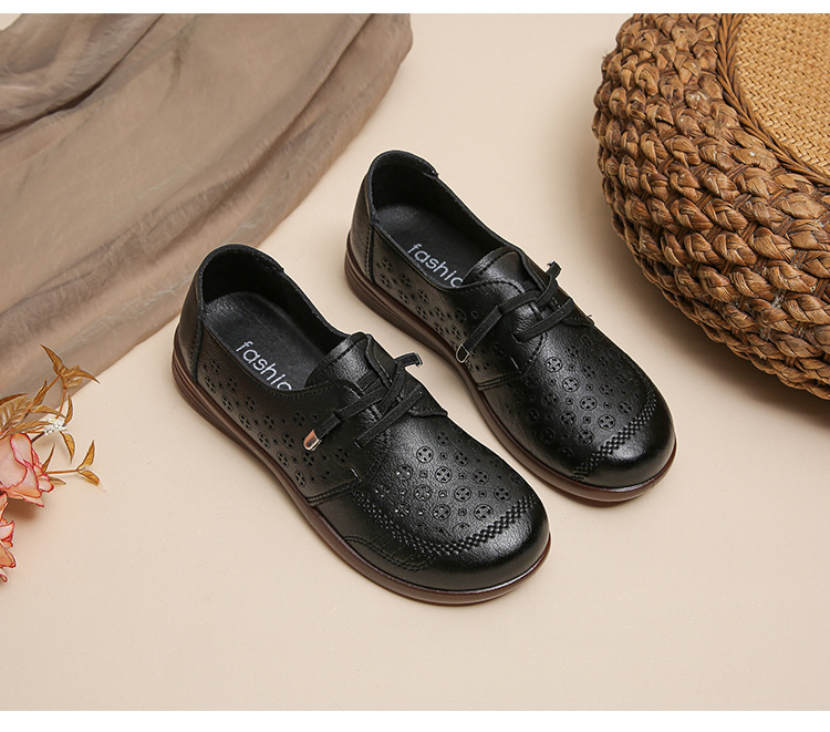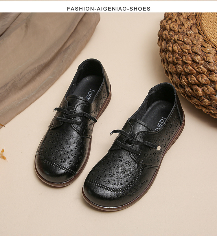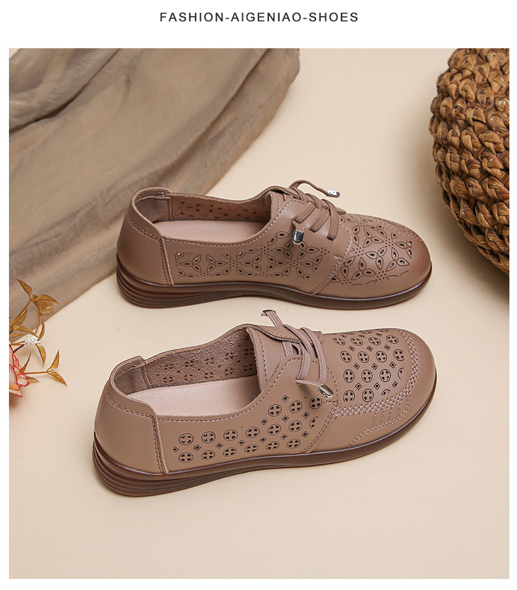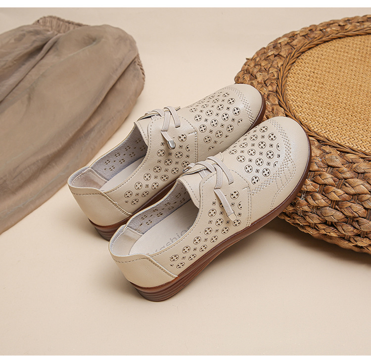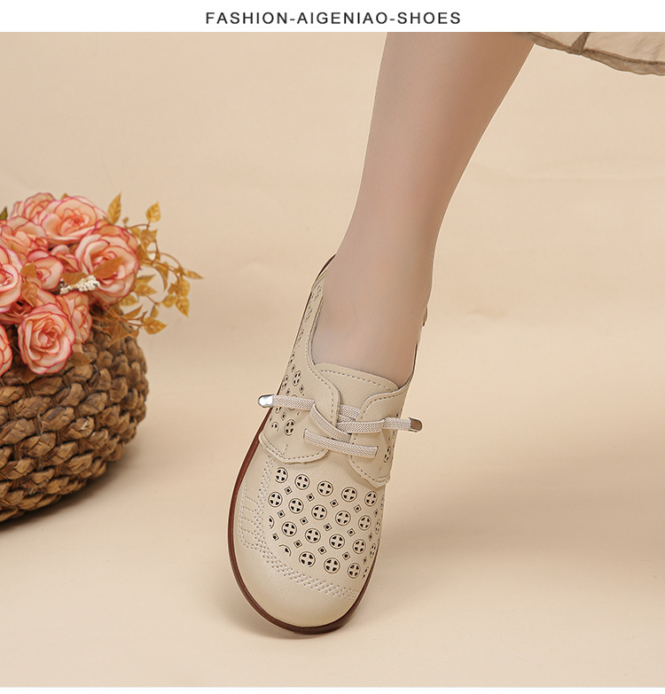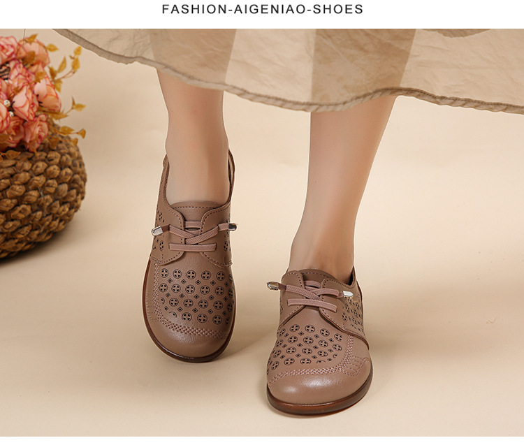 2025 새로운 중공 구멍 단층 신발 둥근 발가락 편안한 부드러운 바닥 평면 통기성 다용도 가죽 신발 편안한 어머니 여성 신발스토어 가기