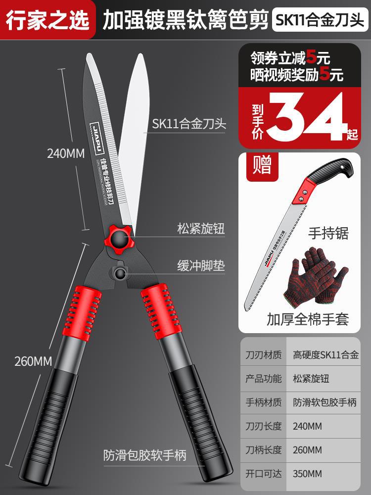 • [전문가 선택] 강화된 흑색 도금 티타늄 울타리 가위(SK11 합금 칼날) + 무료 수제 톱