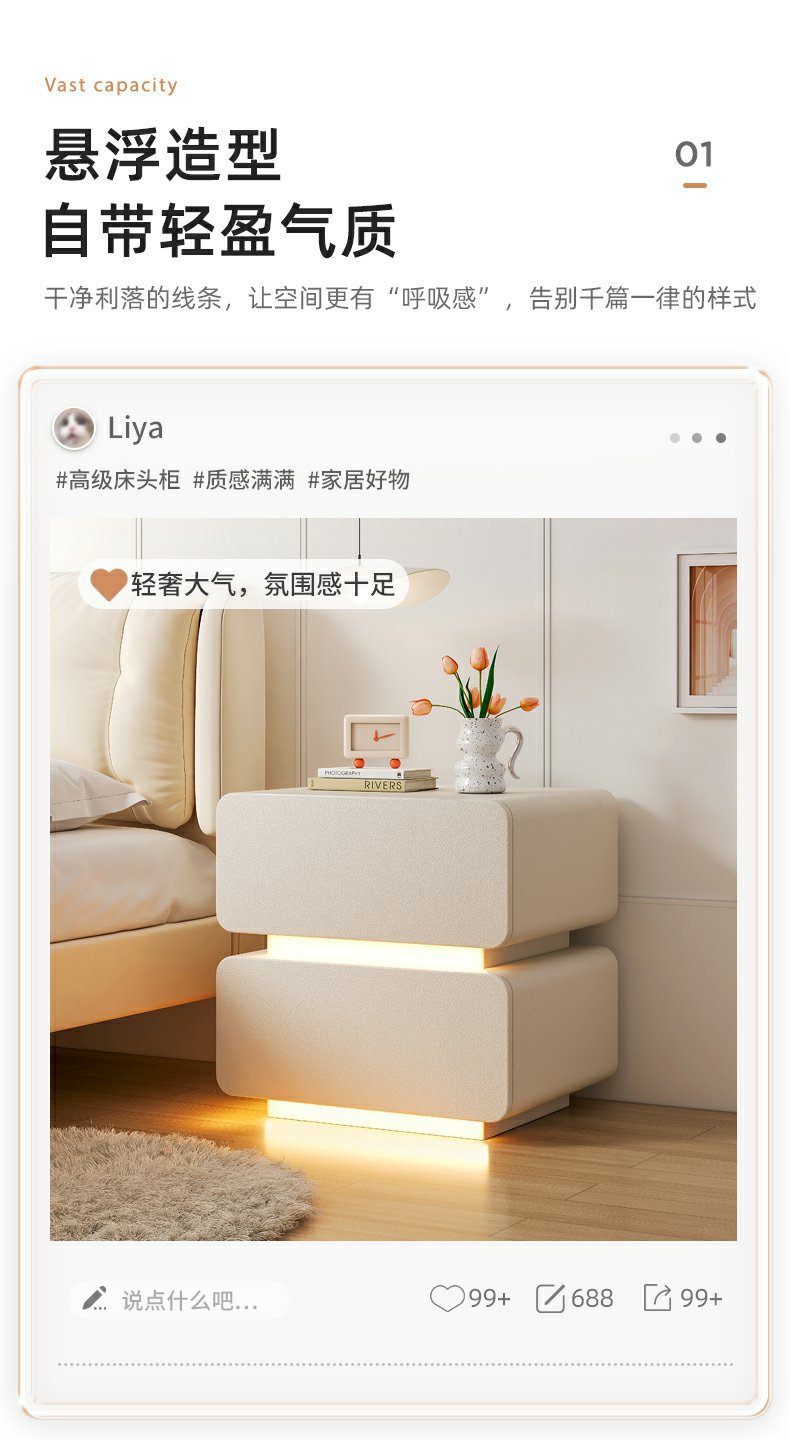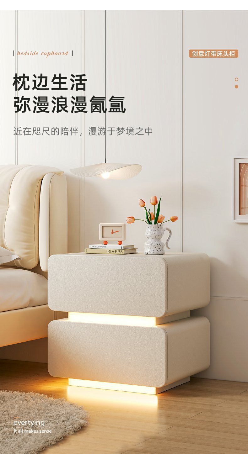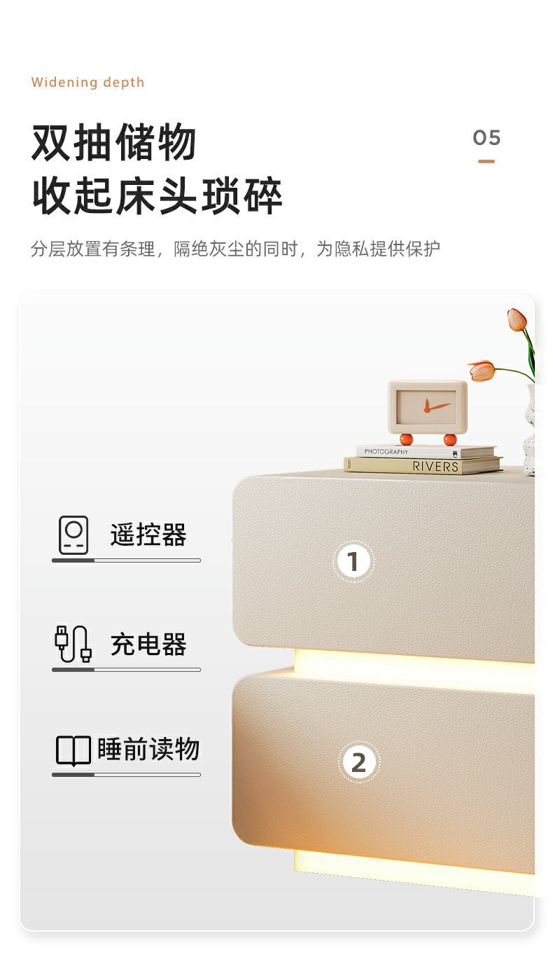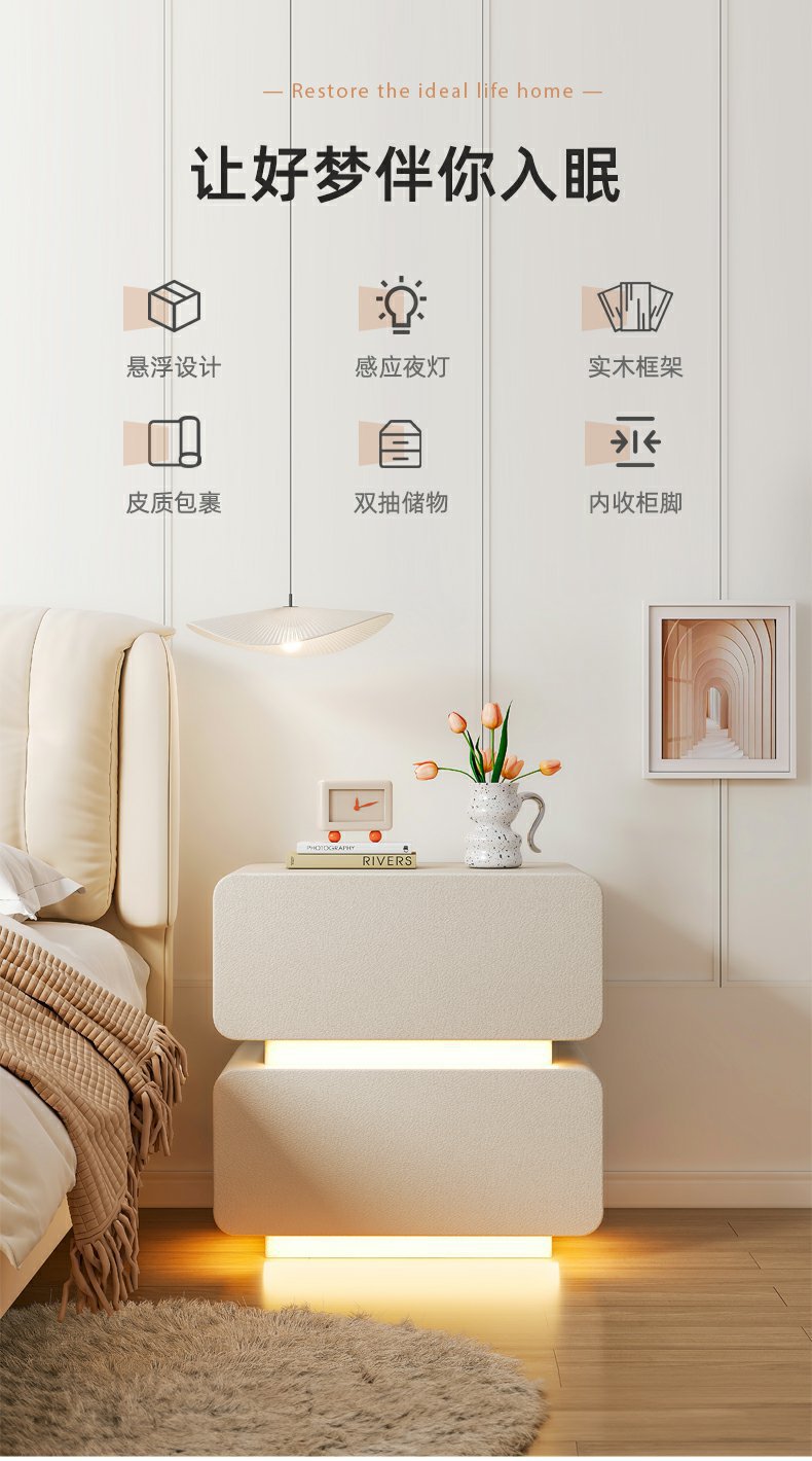 悬浮床头柜奶油风实木带灯极简家用卧室高级感床边储物柜简约现代