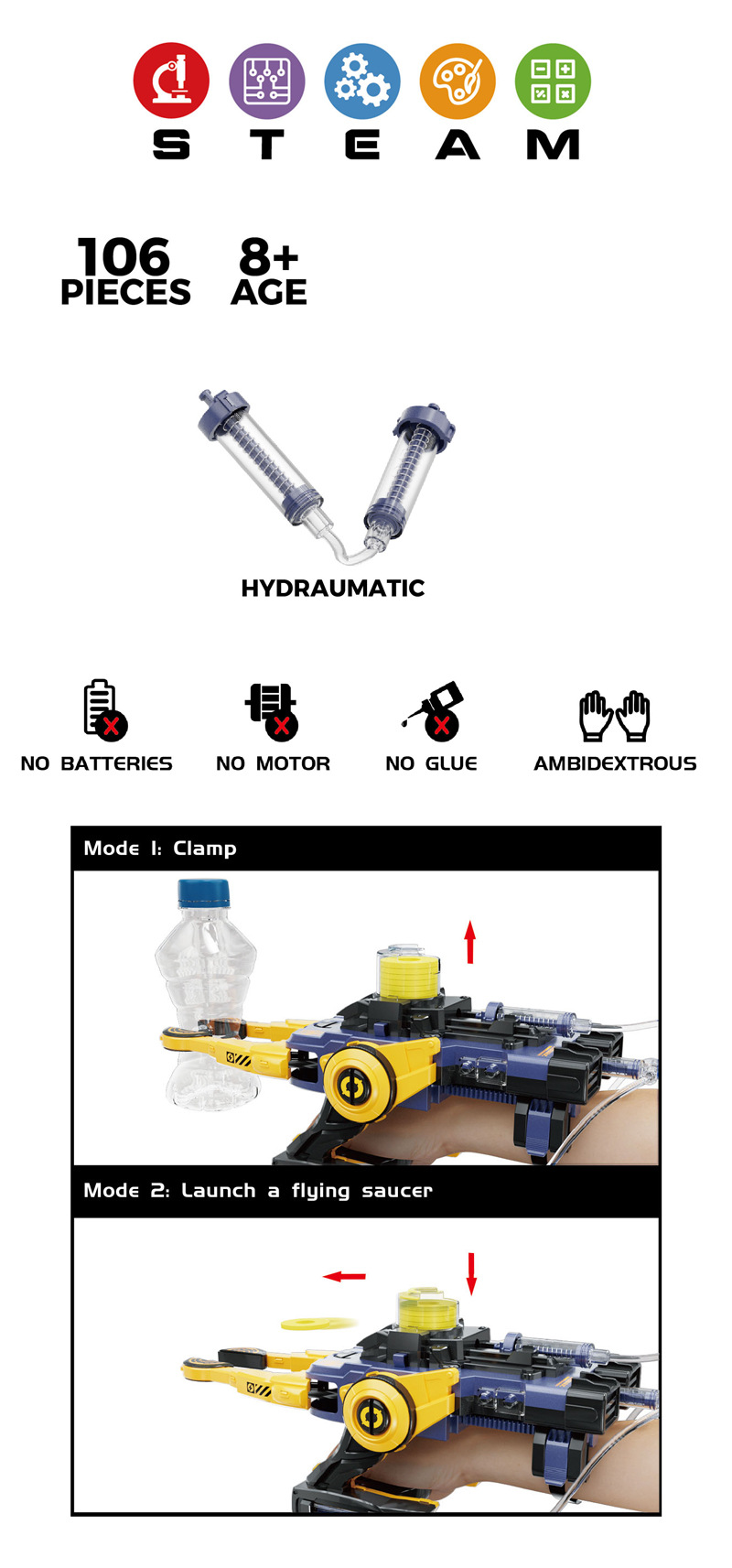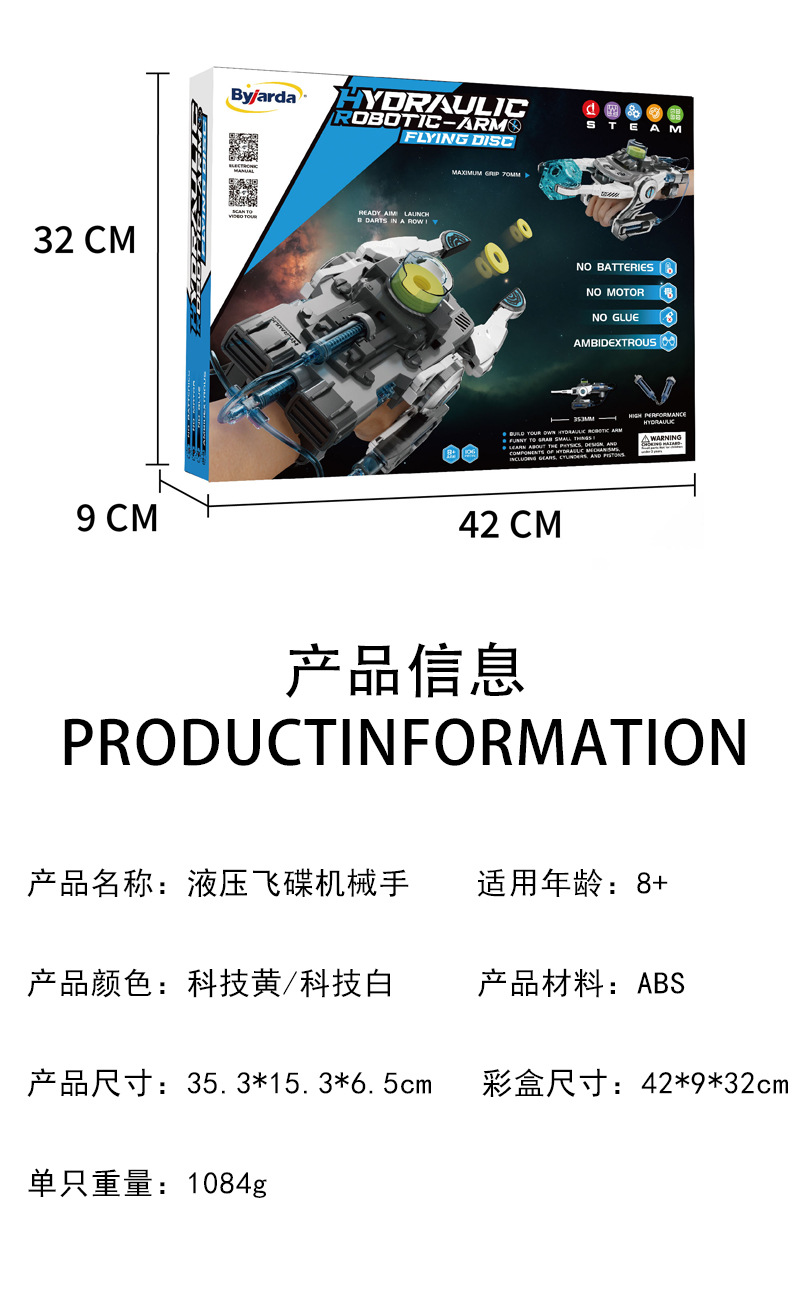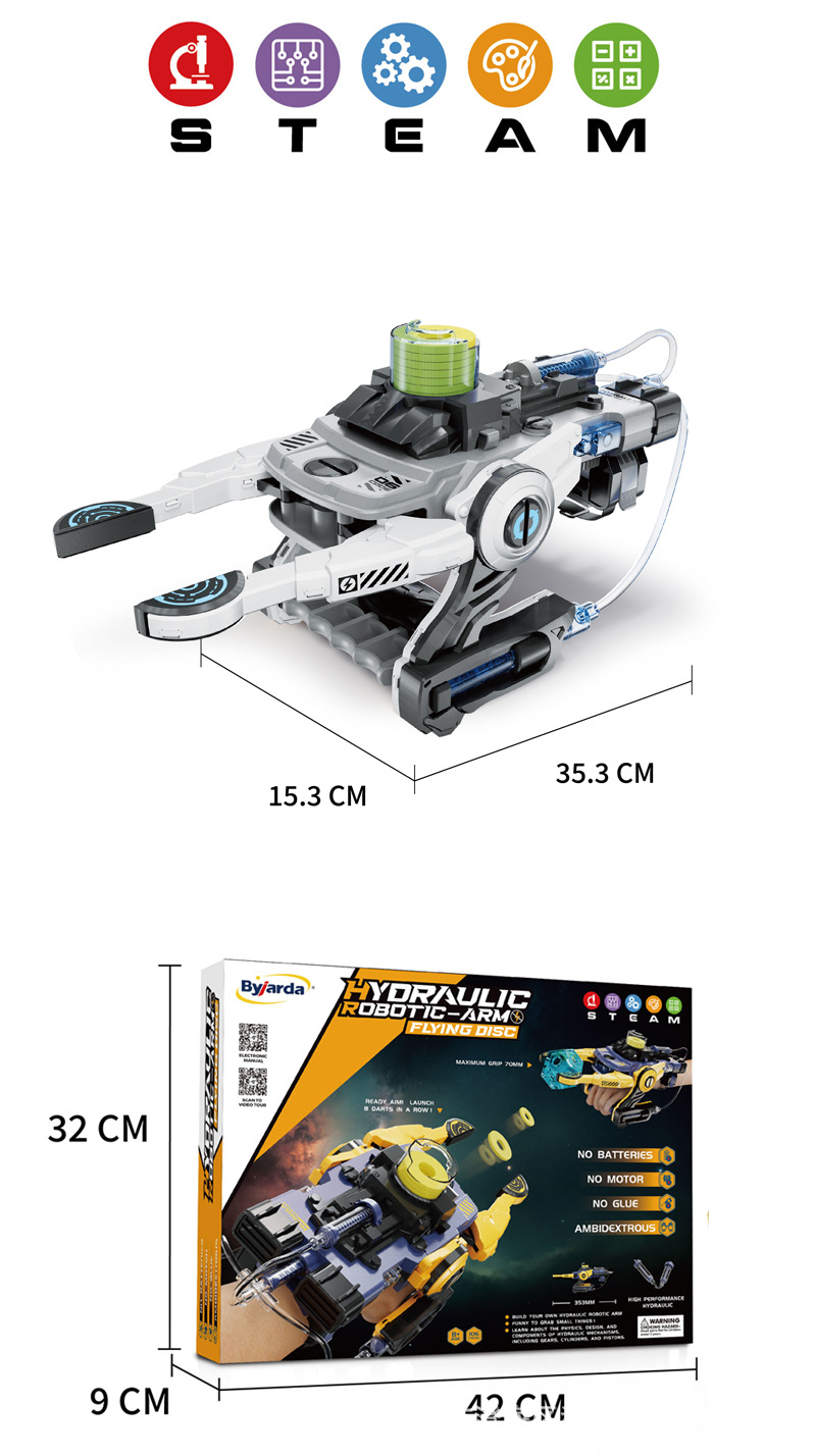 炫酷的概念机械手造型,两种可玩模式,模式1发射EVA安全飞碟,模式2抓钳夹取物品;