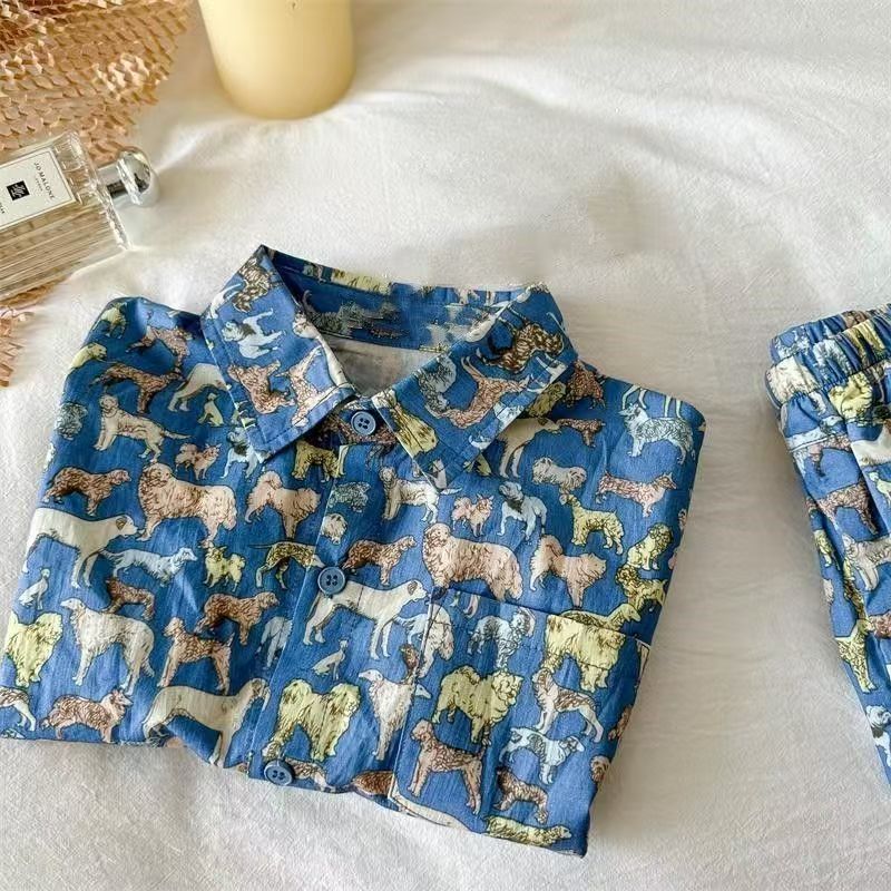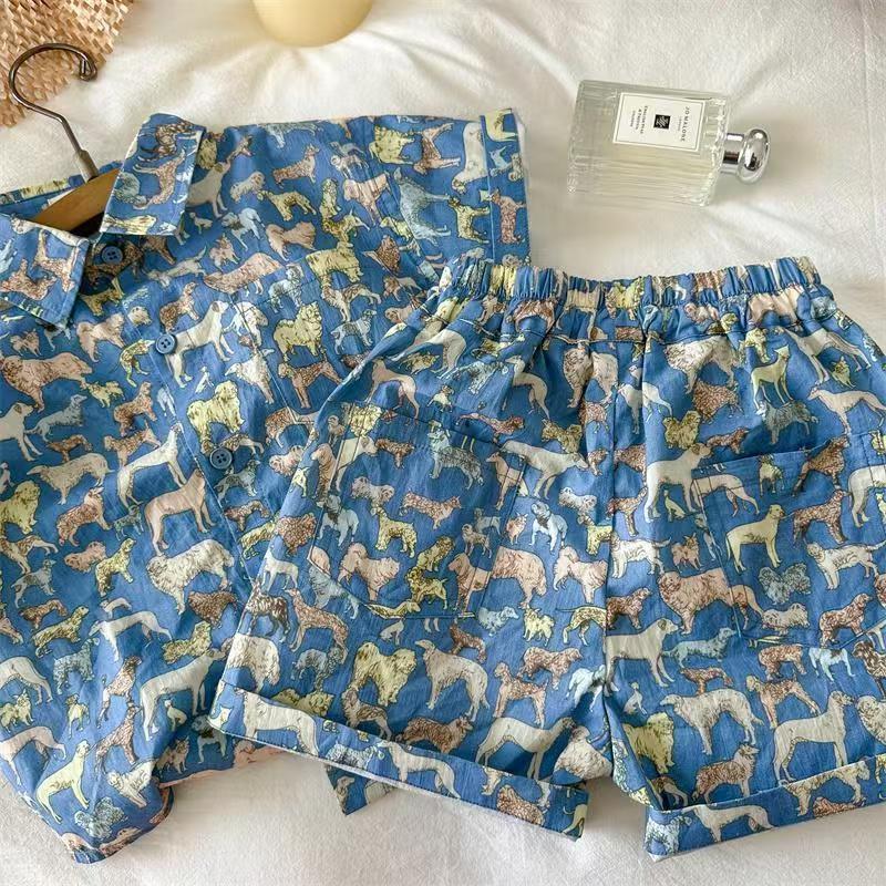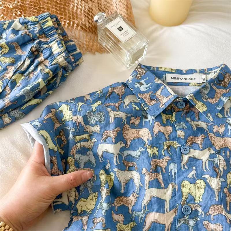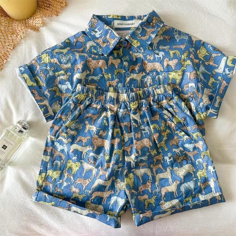 2025 여름 새로운 어린이 반팔 세트 소년과 소년의 전체 인쇄 만화 꽃 셔츠 아기의 반바지 투피스 유행 세트스토어 가기