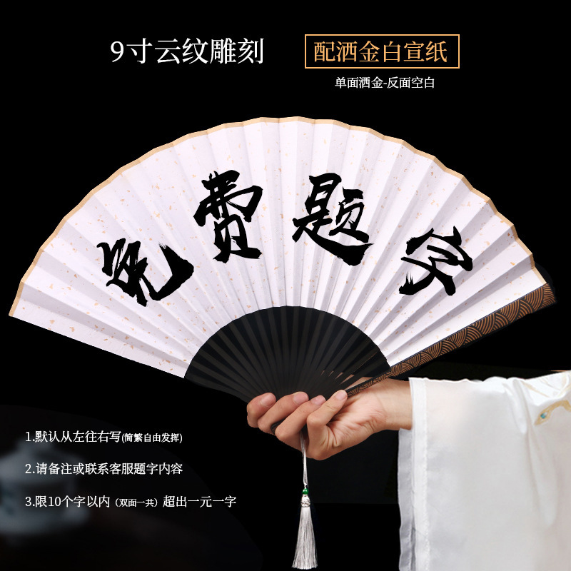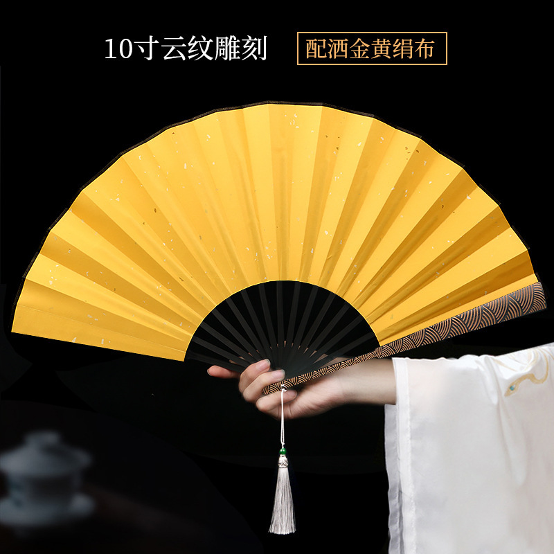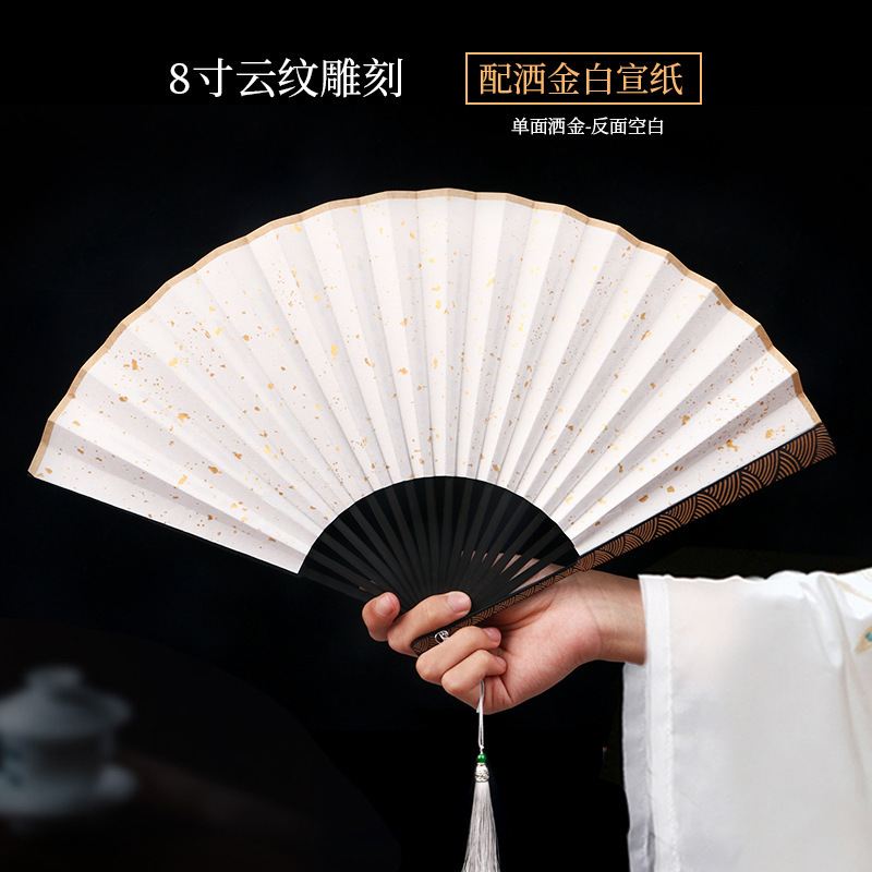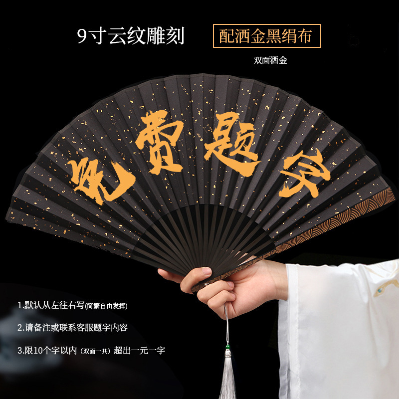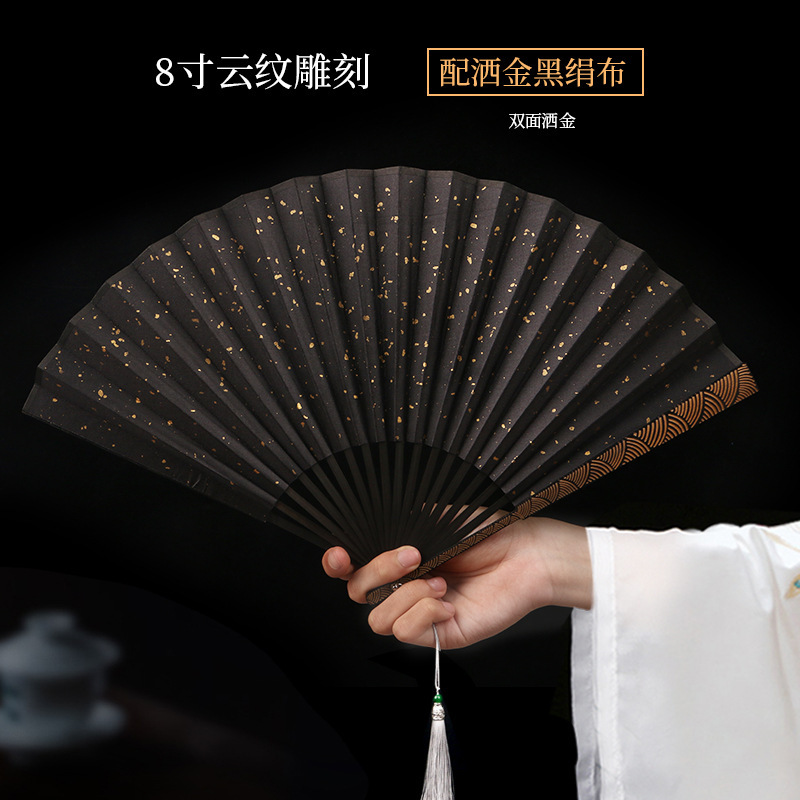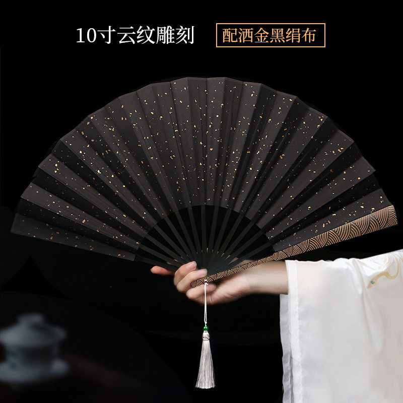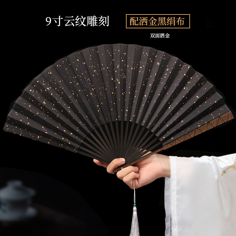 Moire 파인 새겨진 Xuan 종이 접는 팬 블랙 뿌리기 골드 실크 천 골동품 웨이브 패턴 전국 패션 팬 남성과 여성의 바람 Xichen스토어 가기