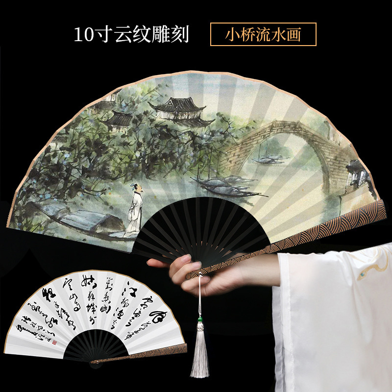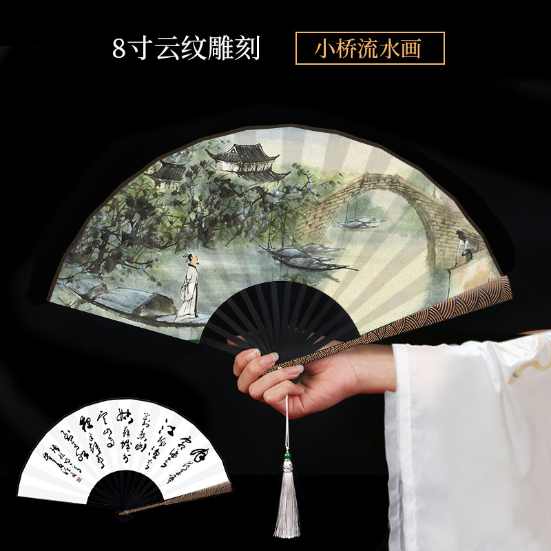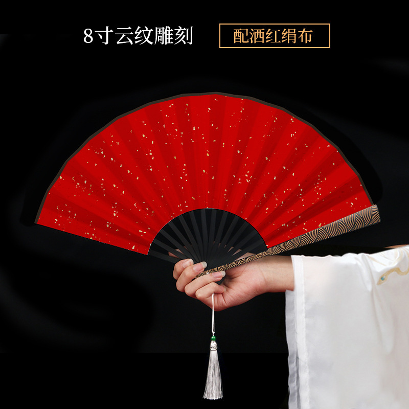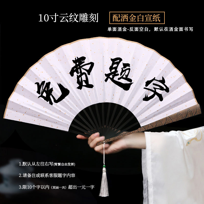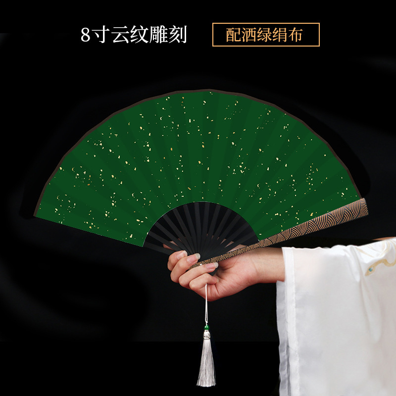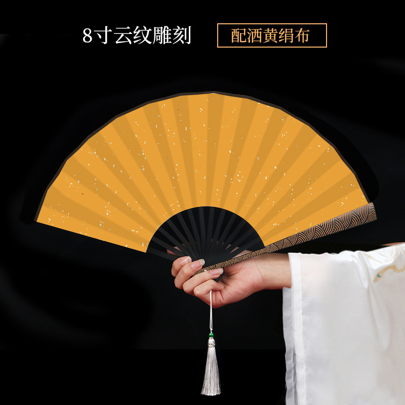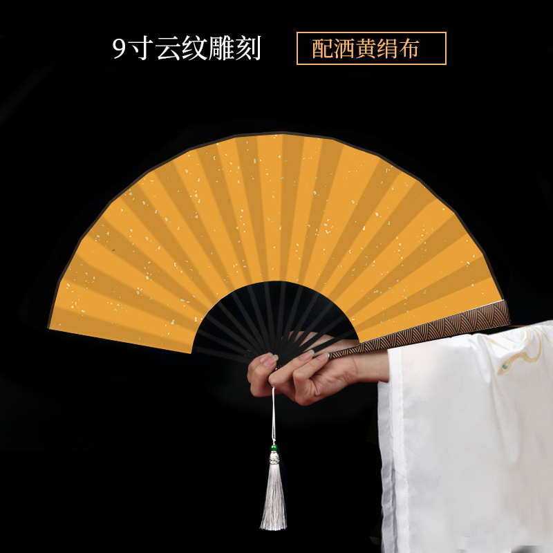 Moire 파인 새겨진 Xuan 종이 접는 팬 블랙 뿌리기 골드 실크 천 골동품 웨이브 패턴 전국 패션 팬 남성과 여성의 바람 Xichen스토어 가기