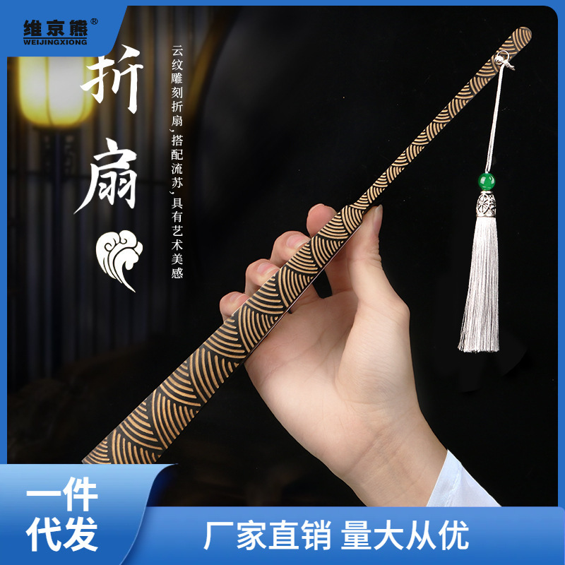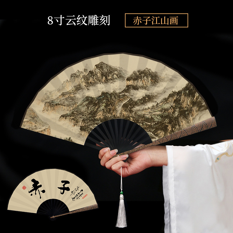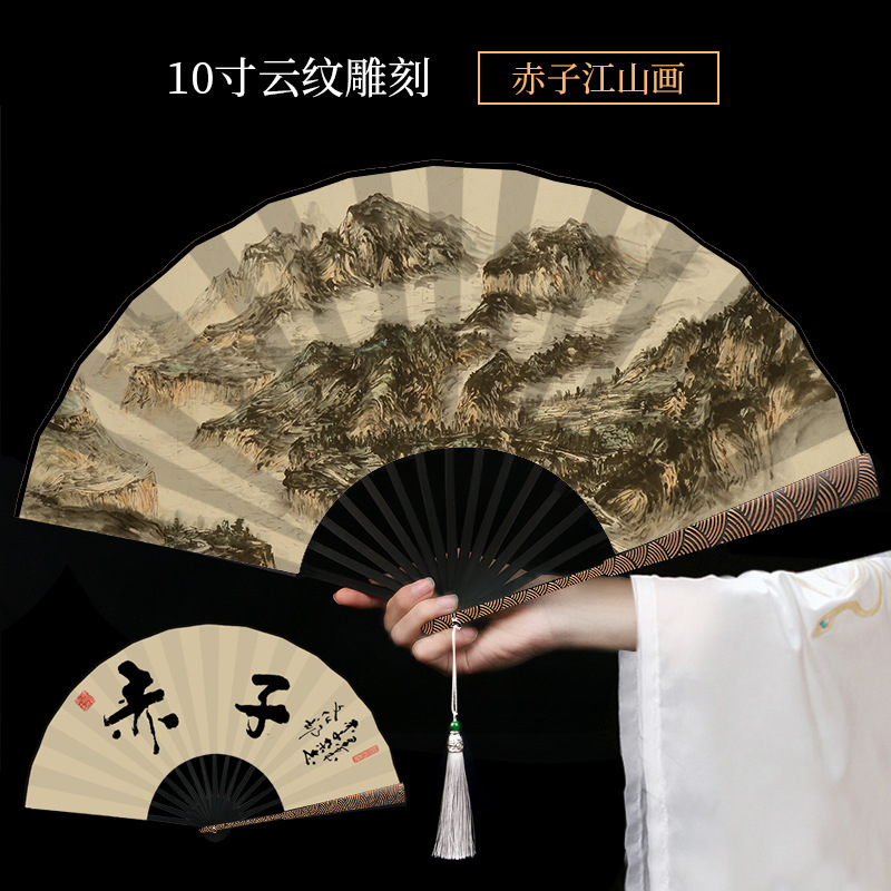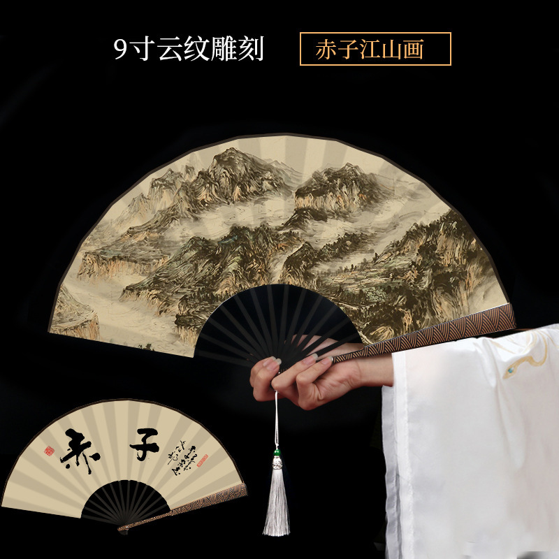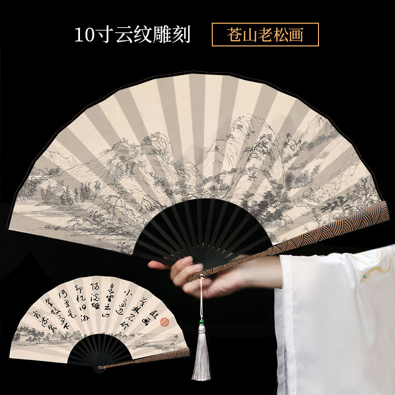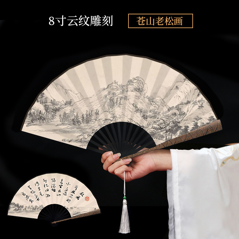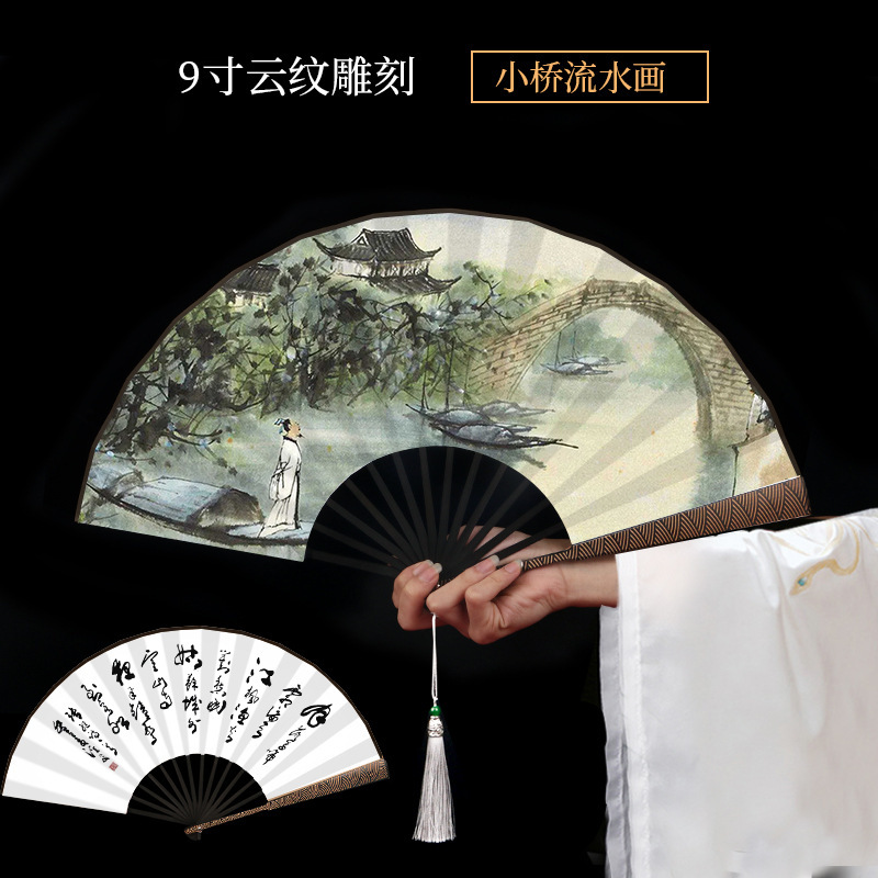 Moire 파인 새겨진 Xuan 종이 접는 팬 블랙 뿌리기 골드 실크 천 골동품 웨이브 패턴 전국 패션 팬 남성과 여성의 바람 Xichen스토어 가기