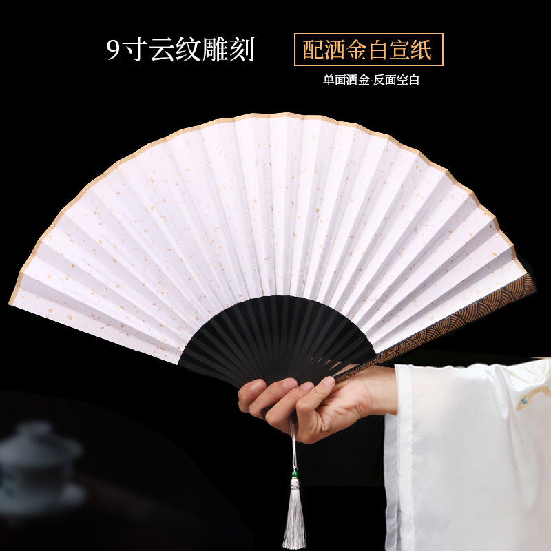 Moire 파인 새겨진 Xuan 종이 접는 팬 블랙 뿌리기 골드 실크 천 골동품 웨이브 패턴 전국 패션 팬 남성과 여성의 바람 Xichen