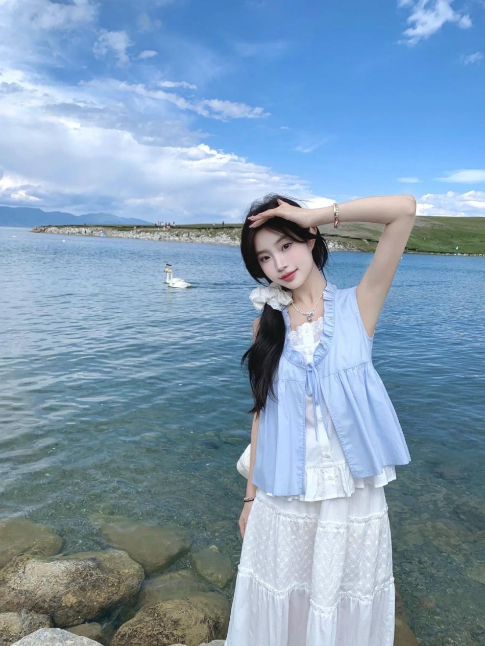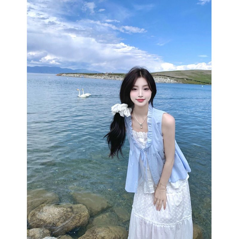 세트 여성 2025 년 여름 새로운 달콤하고 부드러운 스타일 디자인 Ruffled 가짜 투피스 탑 하이 허리 스커트스토어 가기