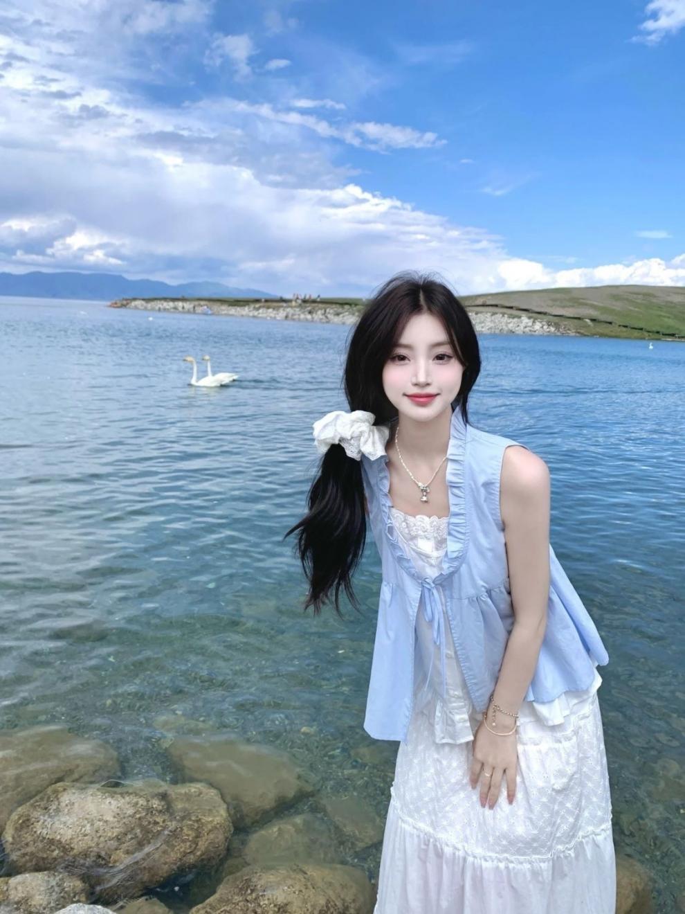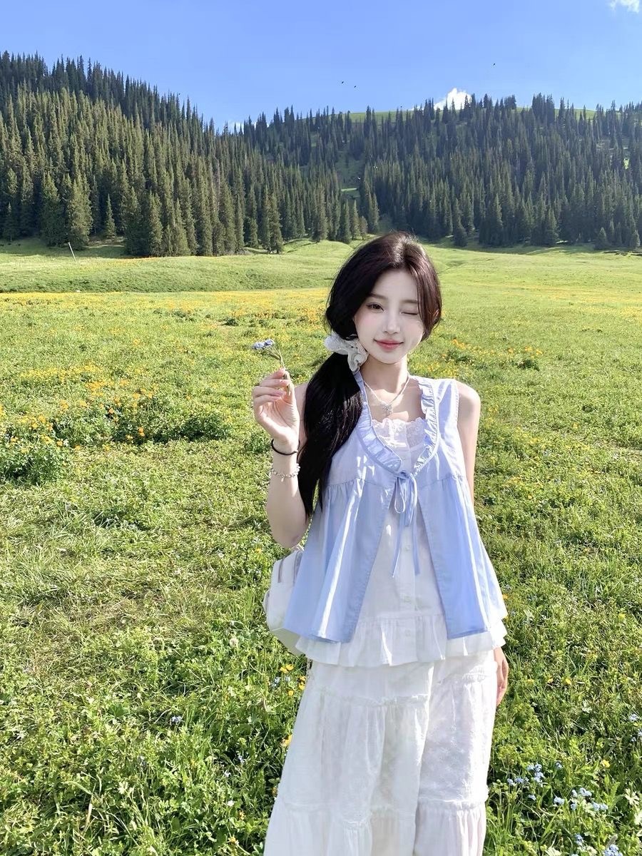 세트 여성 2025 년 여름 새로운 달콤하고 부드러운 스타일 디자인 Ruffled 가짜 투피스 탑 하이 허리 스커트