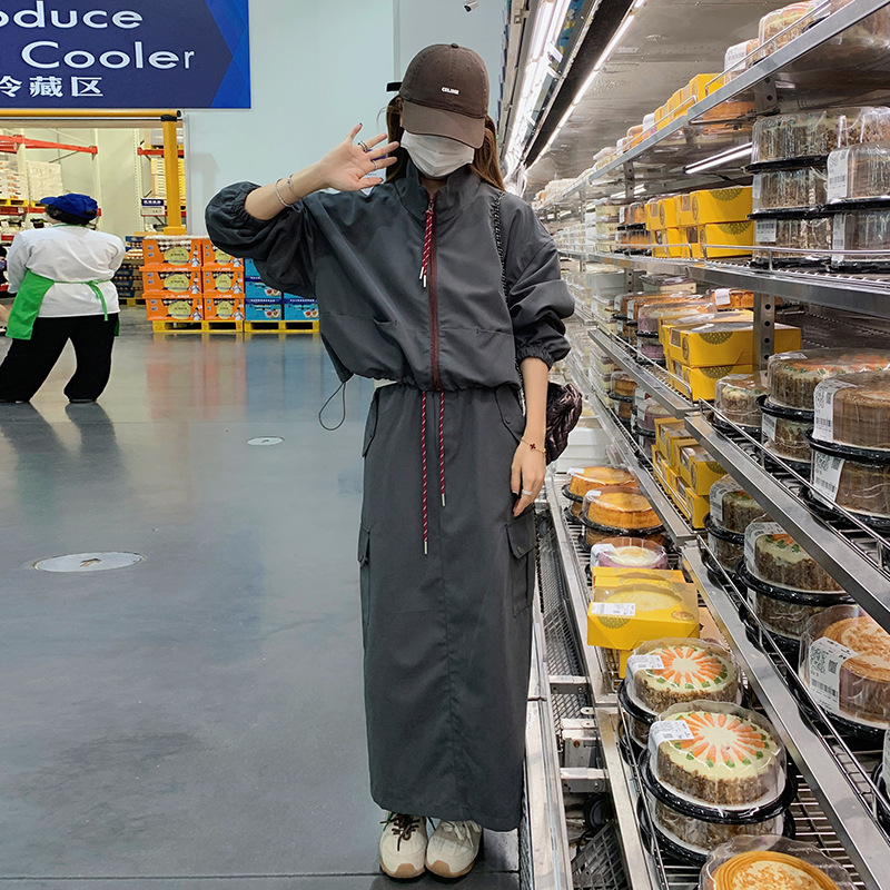 리얼 샷 2025 새로운 한국판 칼라 느슨한 조커 패션 캐주얼 허리 드로 스트링 슬리밍 기질 오버 스커트 세트스토어 가기
