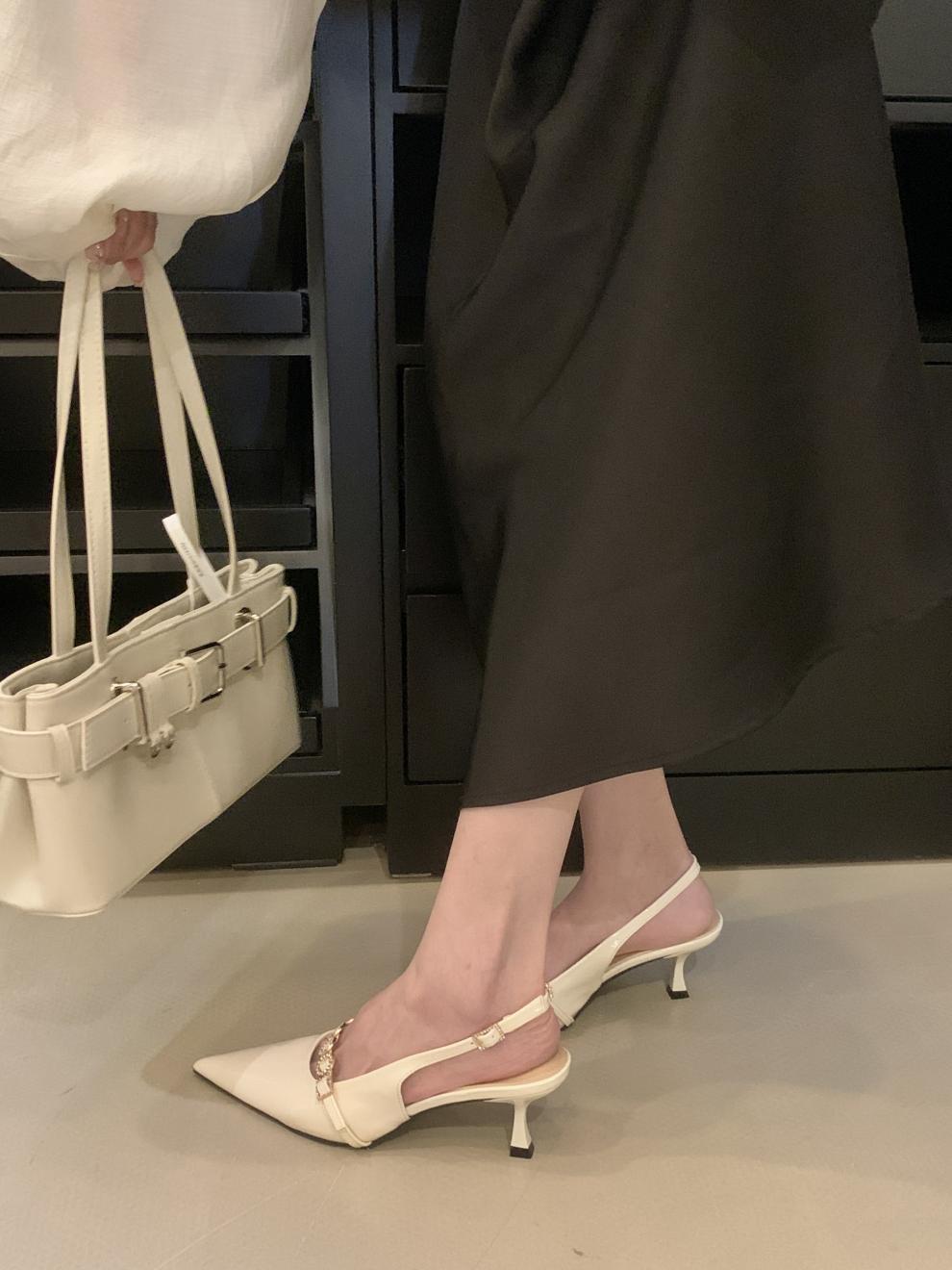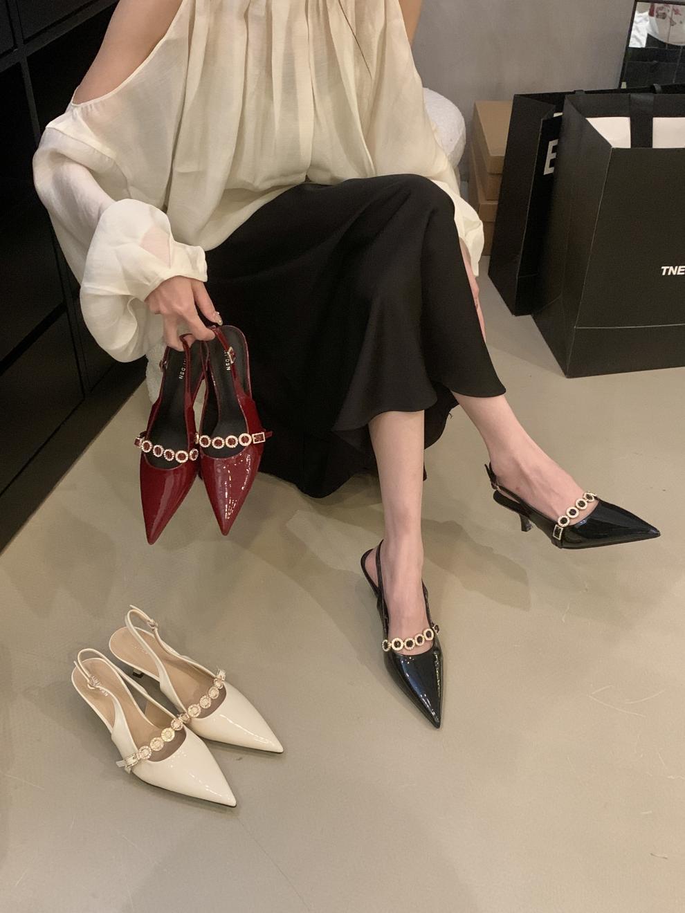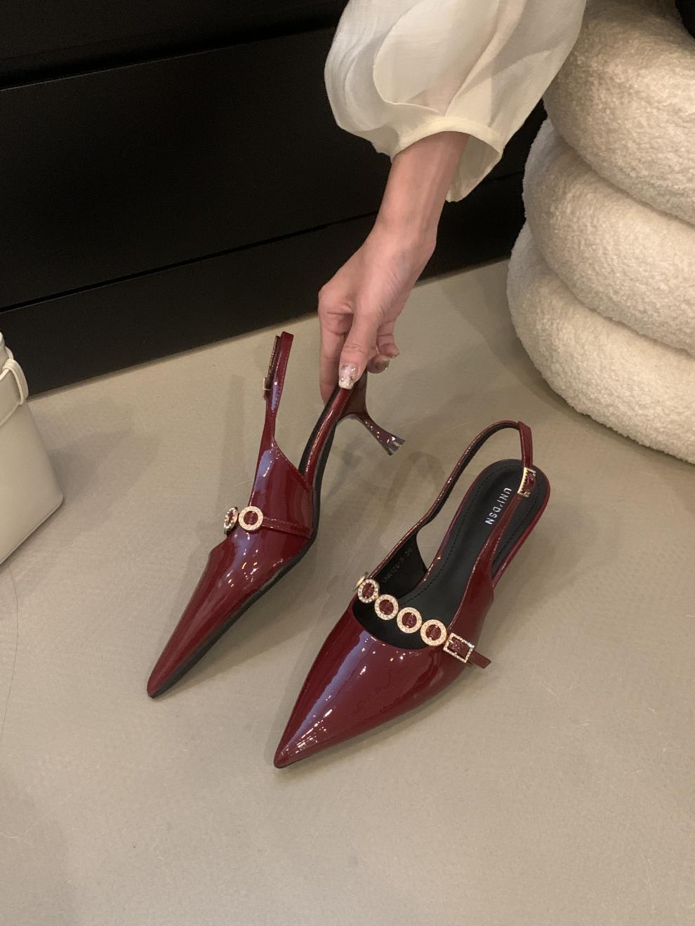 프랑스 고급 체인 레드 얇은 싱글 레이어 신발 여성 신발 2025 봄/여름 우아한 뾰족한 발가락 늦은 통근 빈 샌들스토어 가기