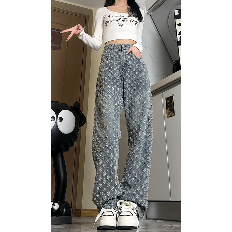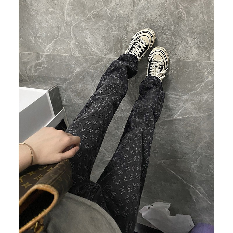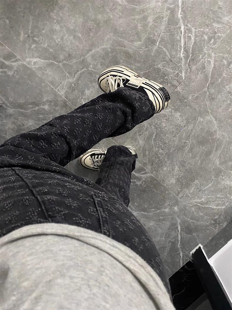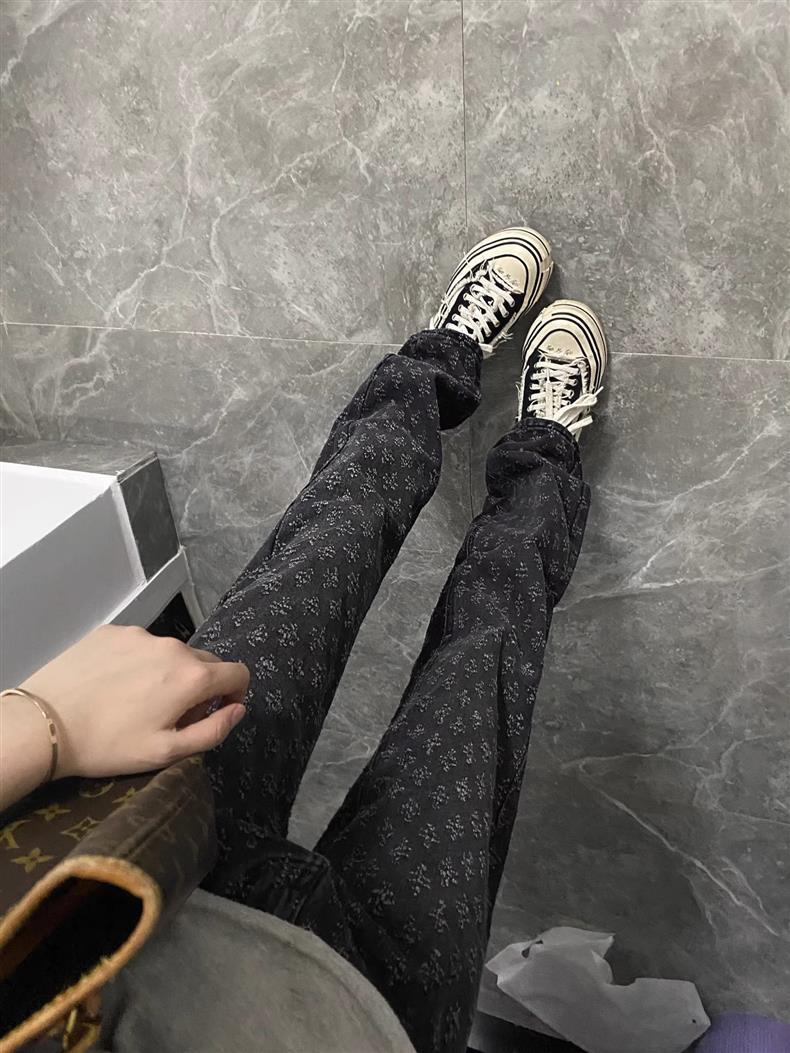 아메리칸 스타일 하이 스트리트 리핑 청바지 남성 가을 자카드 디자인 센스 파리 스타일 트렌디 브랜드 캐주얼 스트레이트 바지스토어 가기