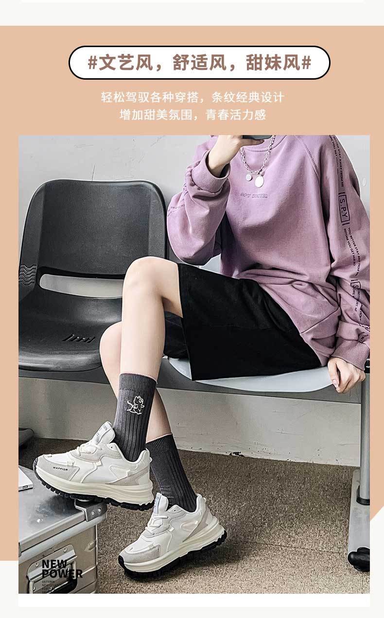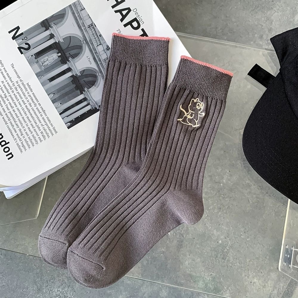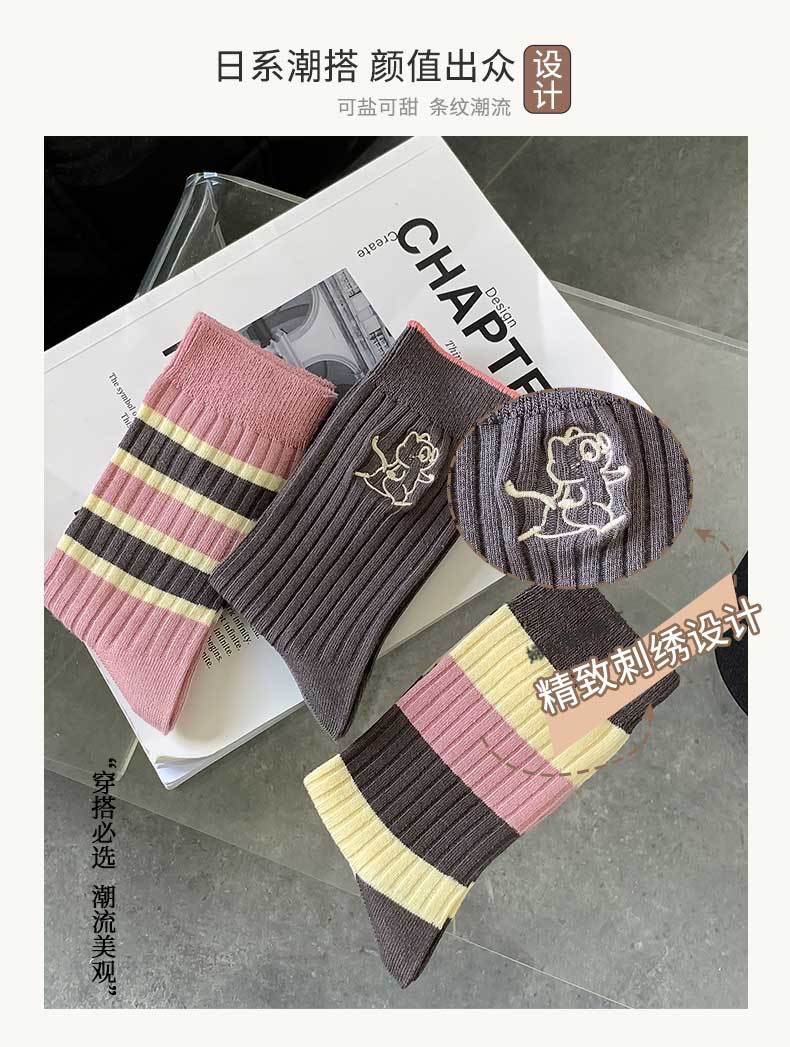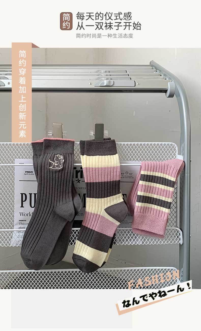 봄과 가을 줄무늬 양말 여성용 트렌디 한 순수 코튼 중간 길이 양말 일본식 올매치 스태킹 양말 한국식 자수 컬러 매칭 스타킹