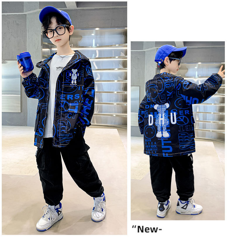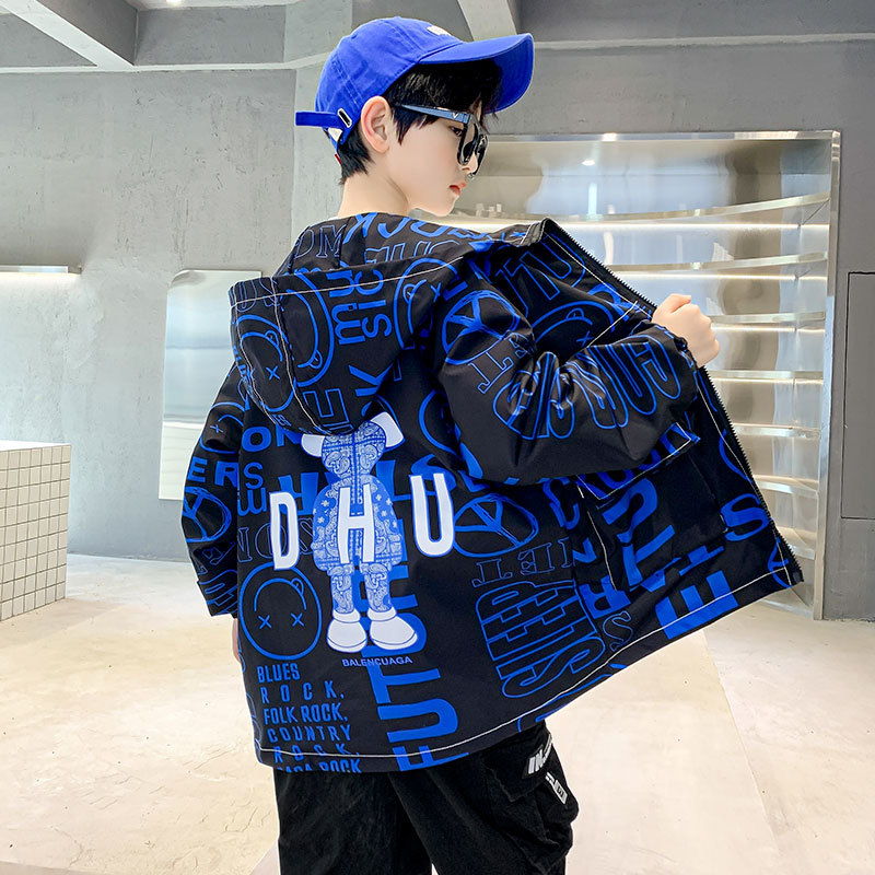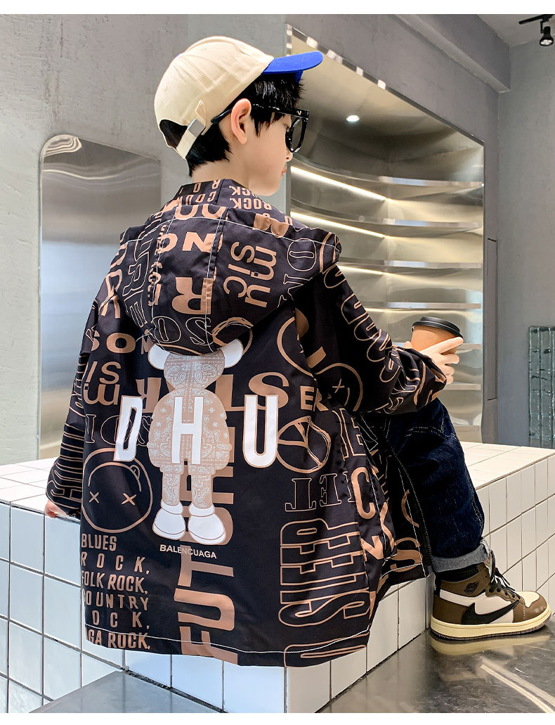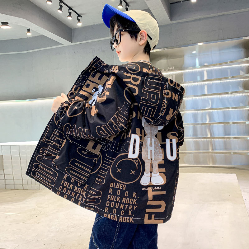 소년 가을 코트 2025 새로운 스타일 중대형 어린이 잘 생긴 소년 봄과 가을 어린이 편지 인쇄 후드 코트 트렌디