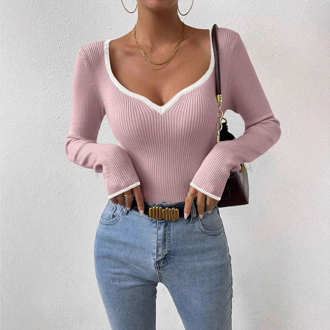 유럽과 미국의 새로운 우아한 V 넥 스트라이프 니트베이스 셔츠 슬림핏 슬리밍 섹시 솔리드 컬러 패션 여성을위한 올 매치 스웨터