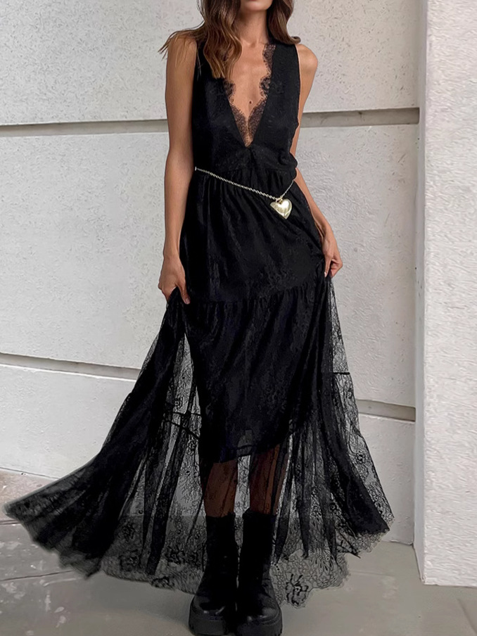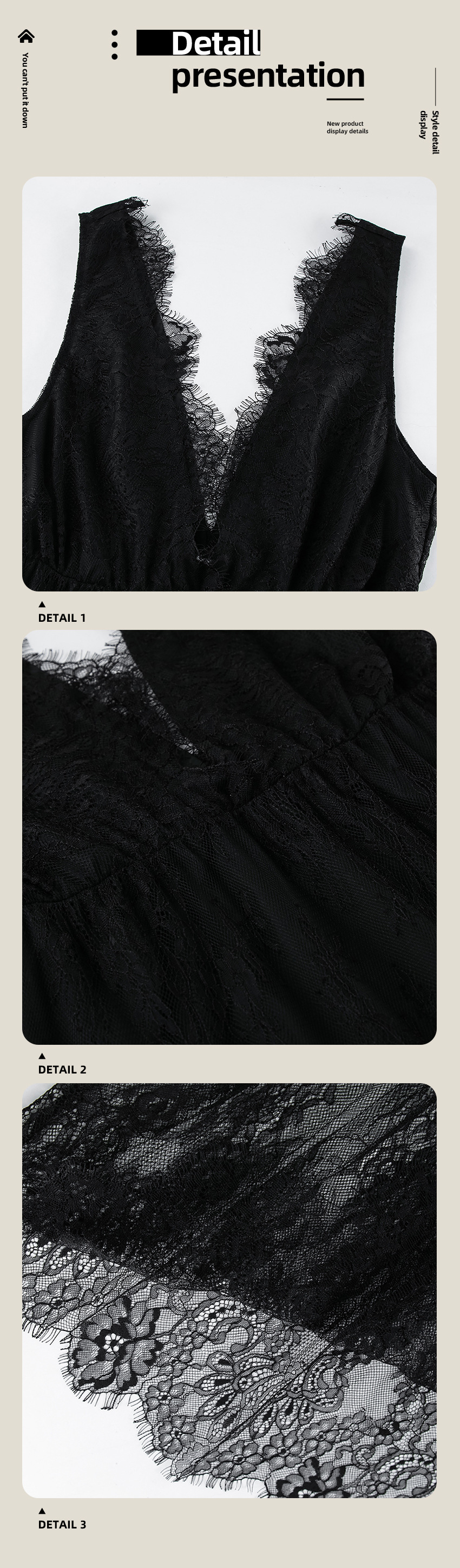 유럽과 미국의 섹시한 블랙 레이스 원피스 여성 여름 패션 Ins Backless V-neck A- line 원피스 여성 원피스스토어 가기
