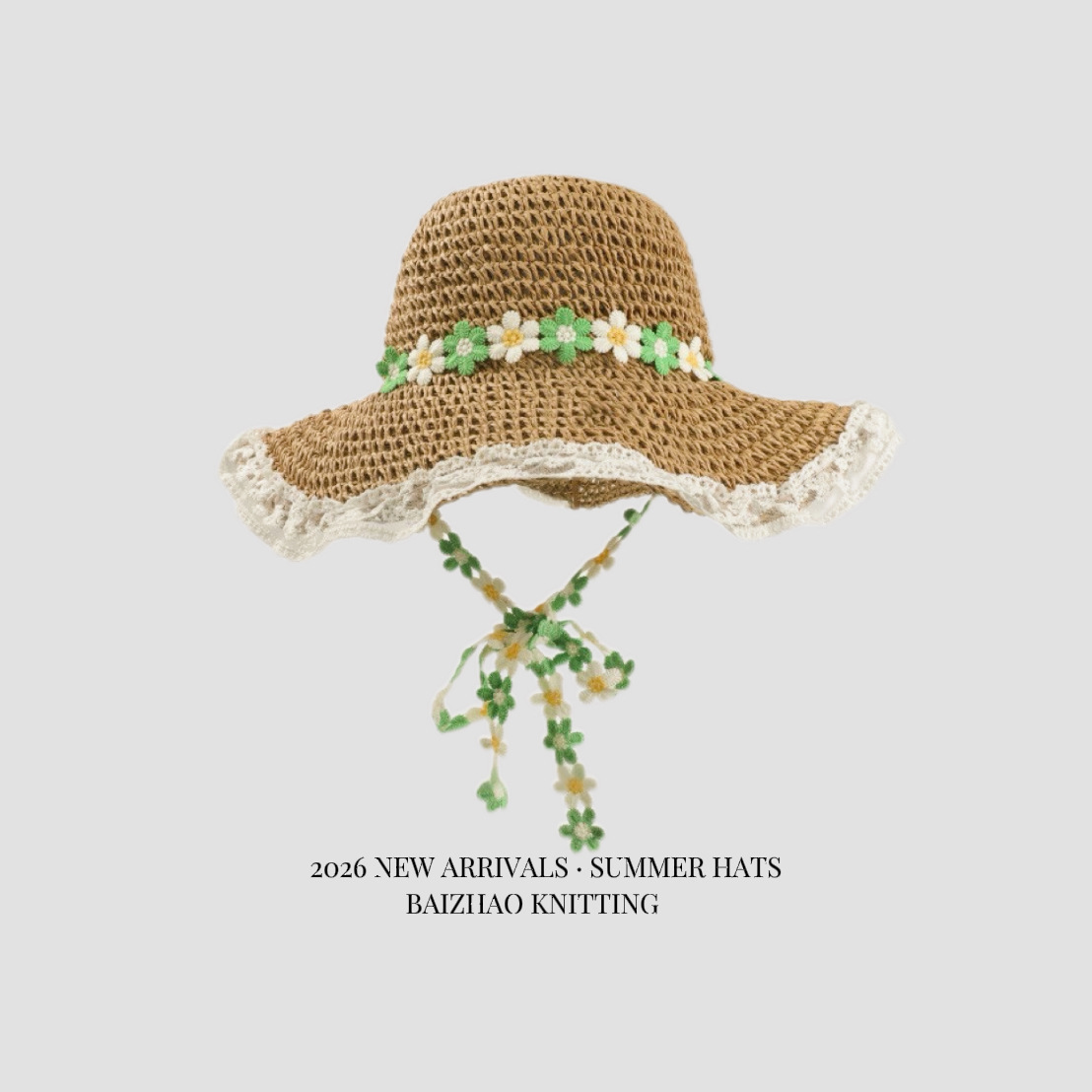 • 녹색과 흰색 꽃무늬 밀짚모자 - 카키