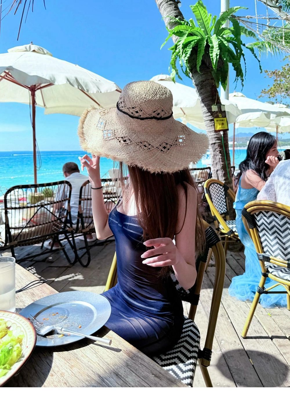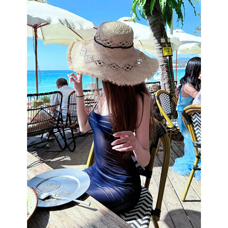 • 검은색 줄무늬 비키니 + 남색 드레스