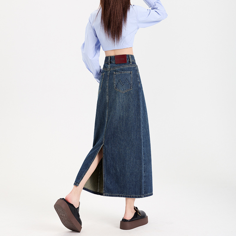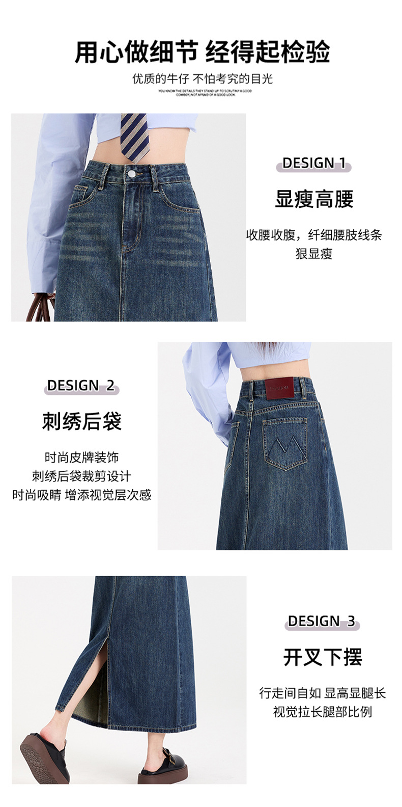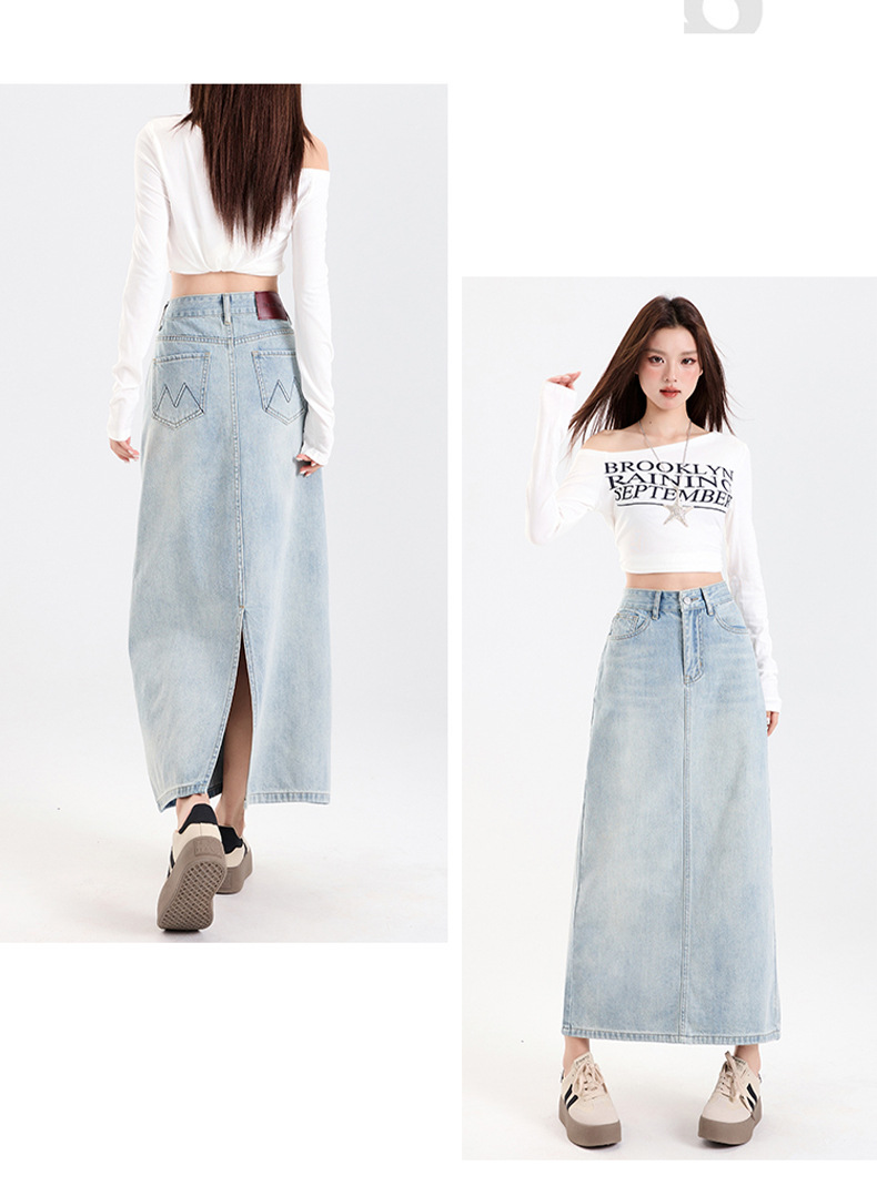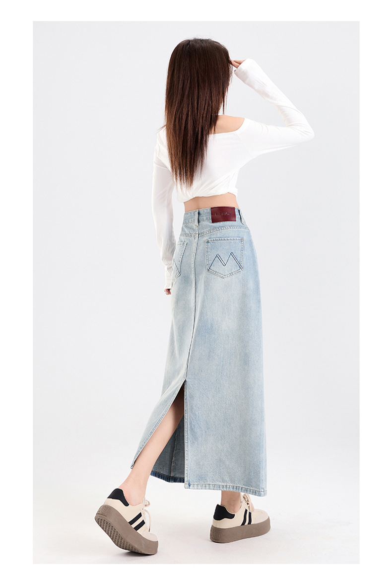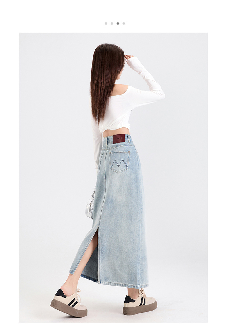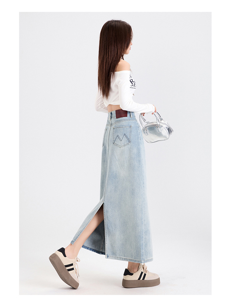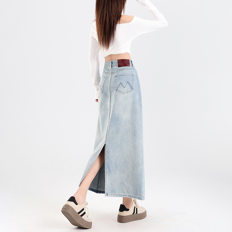 라이트 블루 수 놓은 높은 허리 데님 스커트 여성의 봄과 가을 2025 새로운 중간 길이 슬리밍 엉덩이 스커트 뜨거운 소녀 트렌디스토어 가기