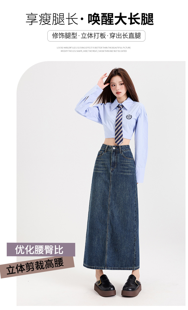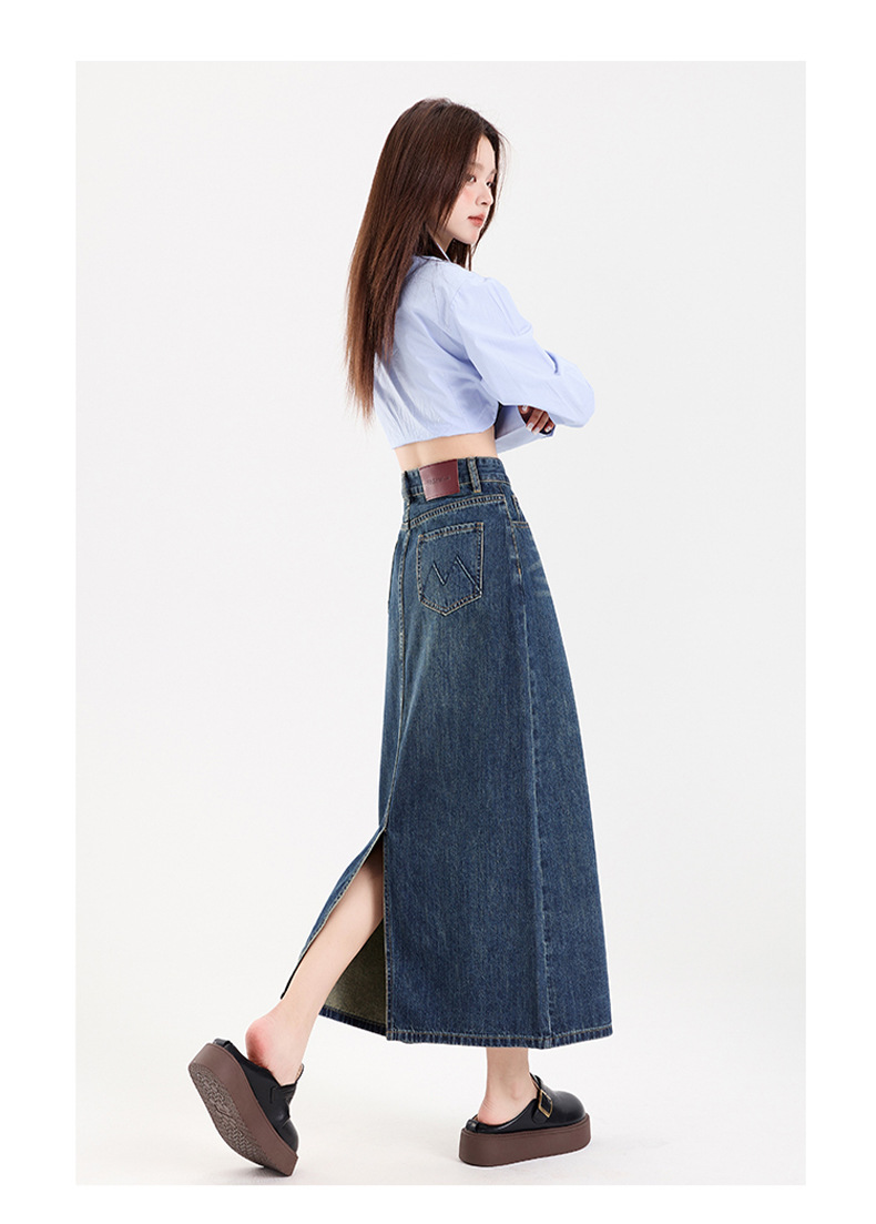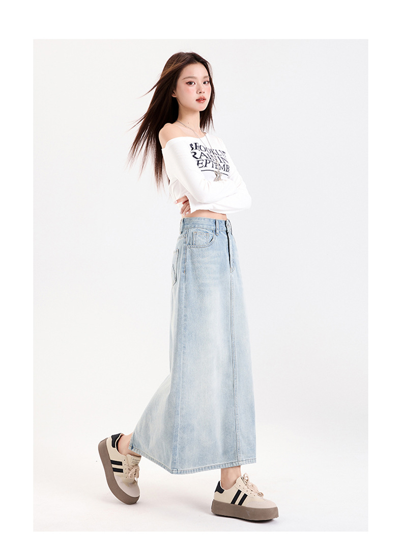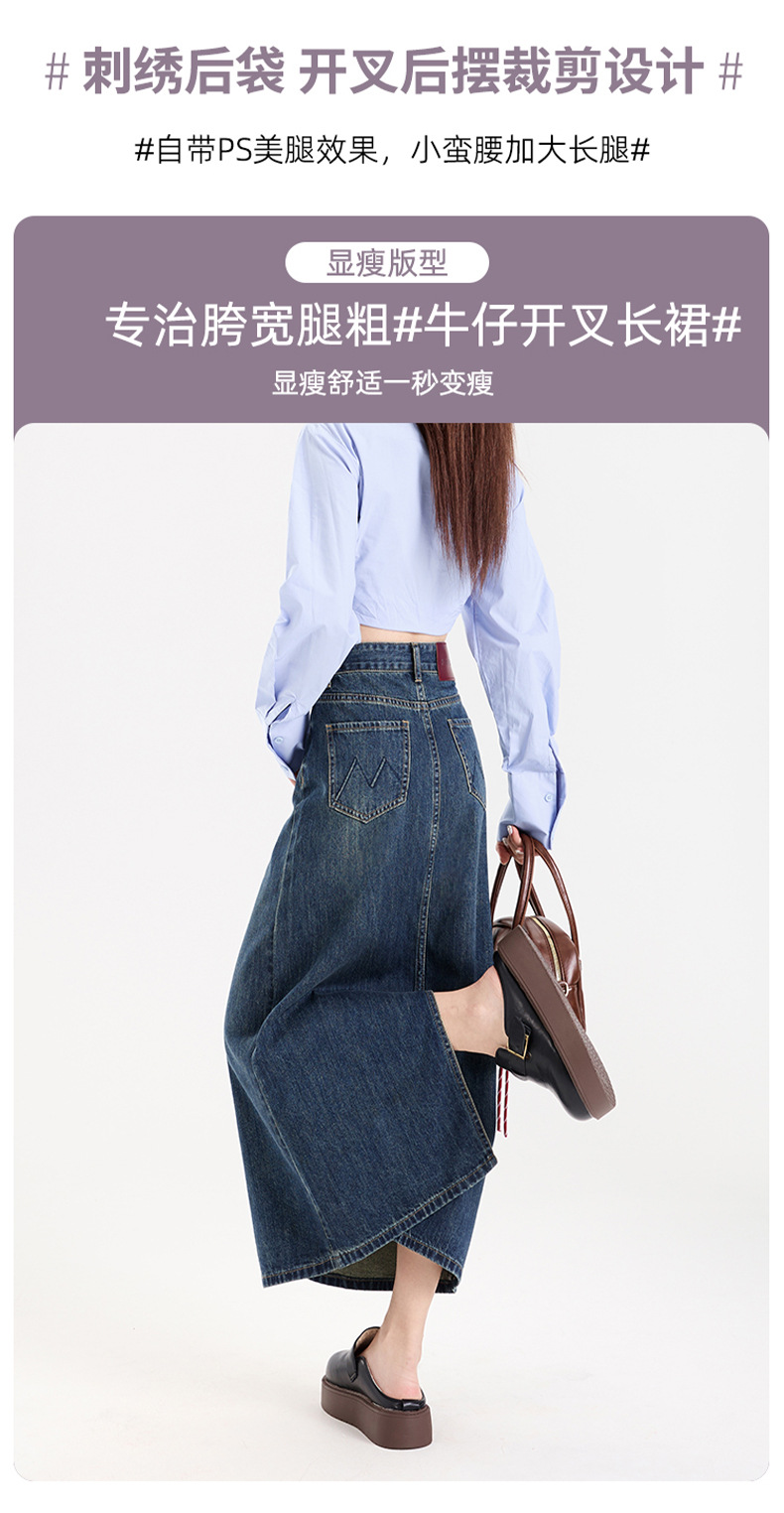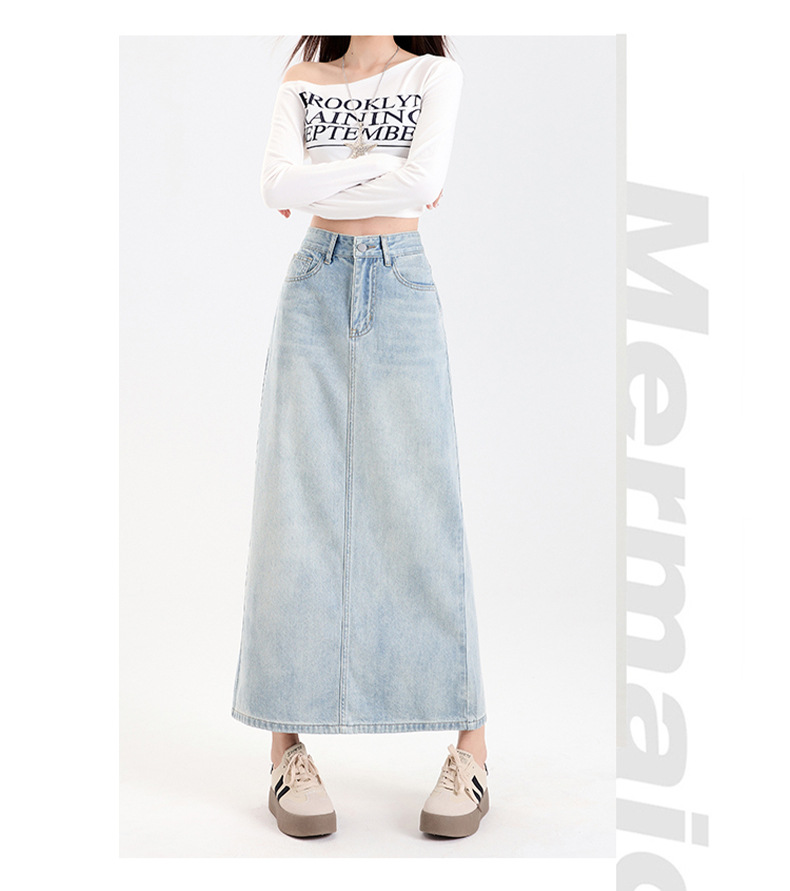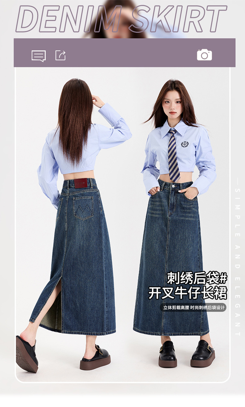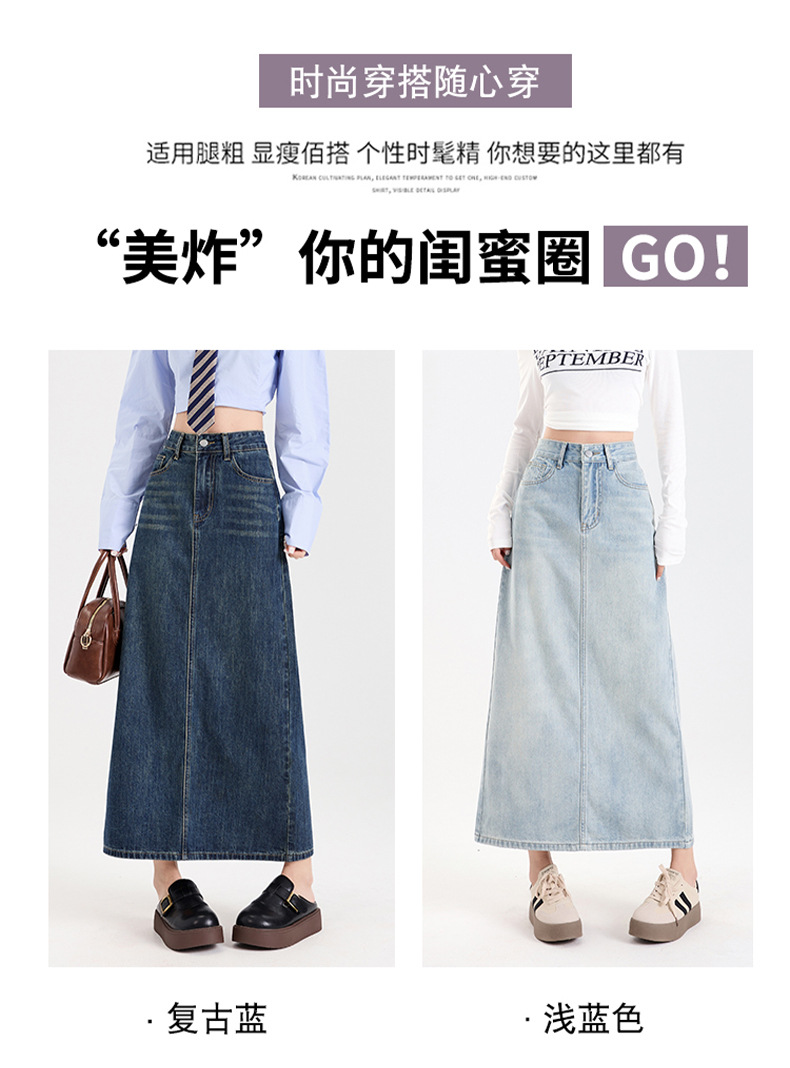 라이트 블루 수 놓은 높은 허리 데님 스커트 여성의 봄과 가을 2025 새로운 중간 길이 슬리밍 엉덩이 스커트 뜨거운 소녀 트렌디스토어 가기