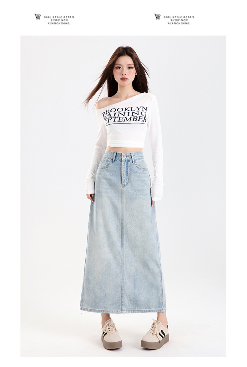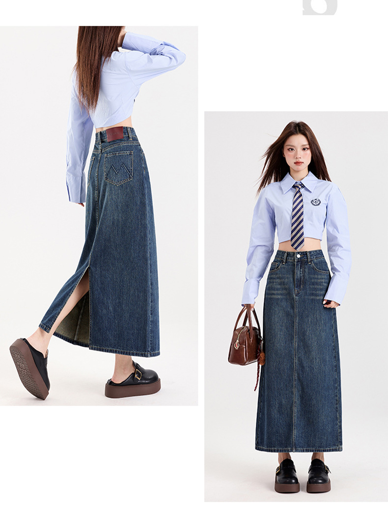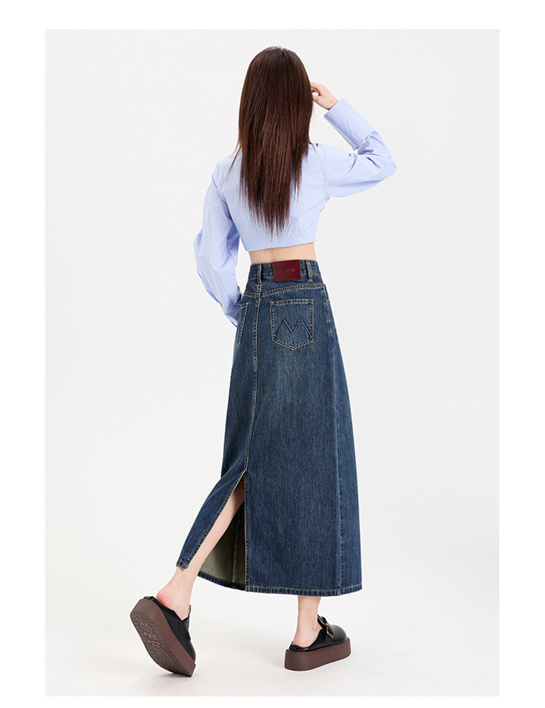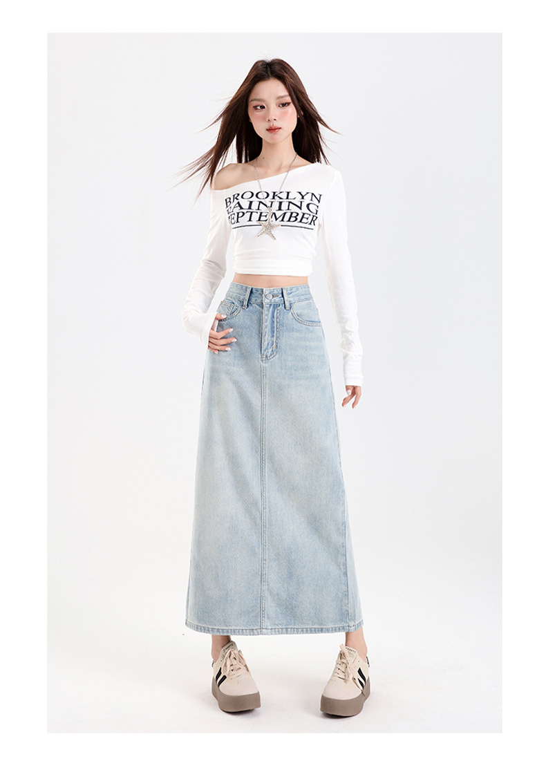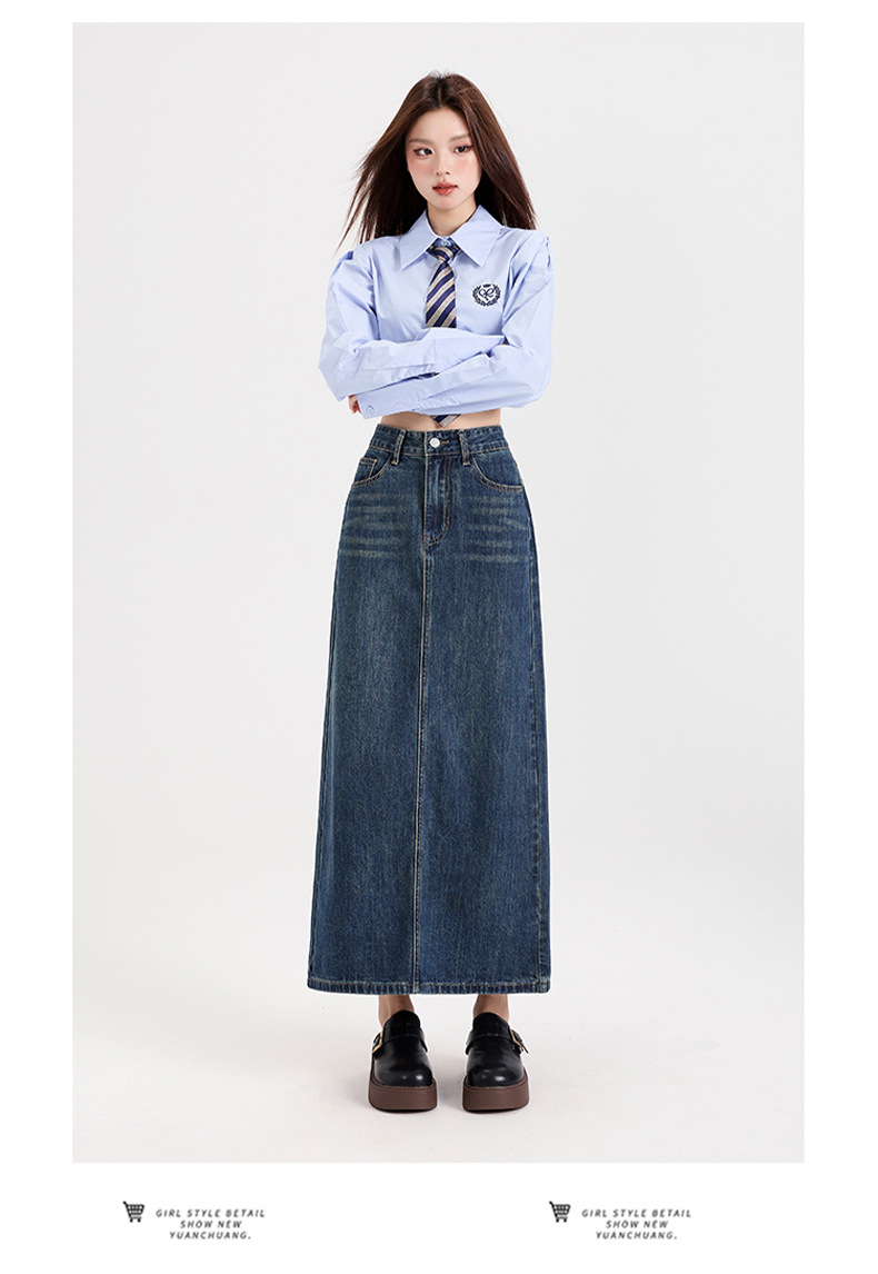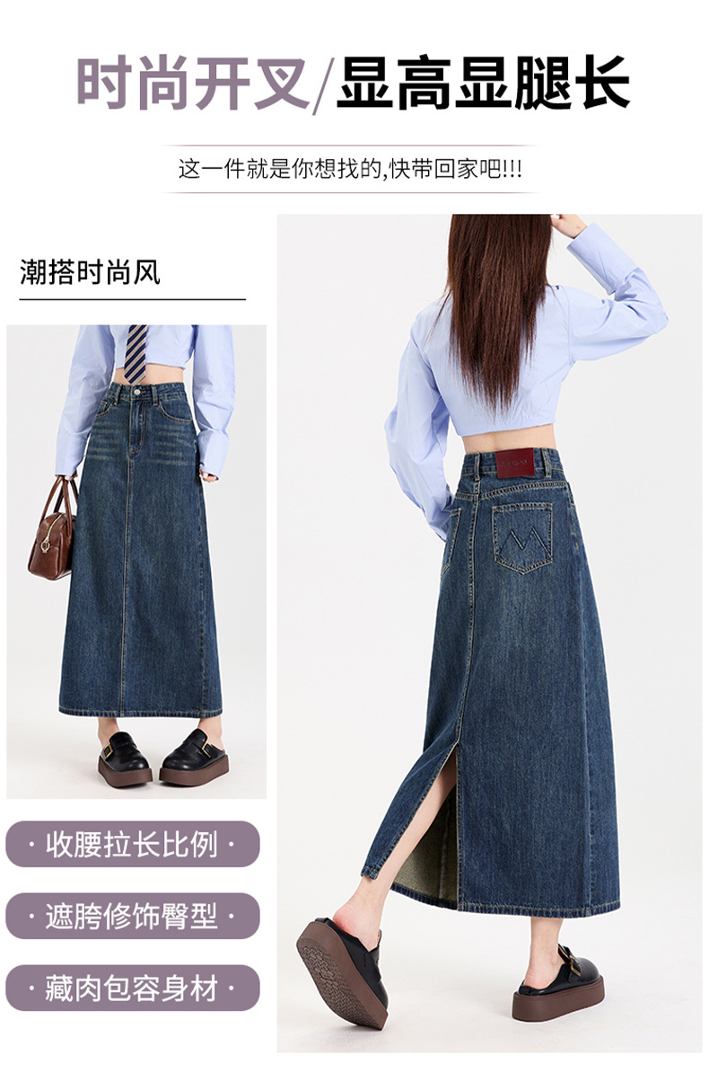 라이트 블루 수 놓은 높은 허리 데님 스커트 여성의 봄과 가을 2025 새로운 중간 길이 슬리밍 엉덩이 스커트 뜨거운 소녀 트렌디스토어 가기