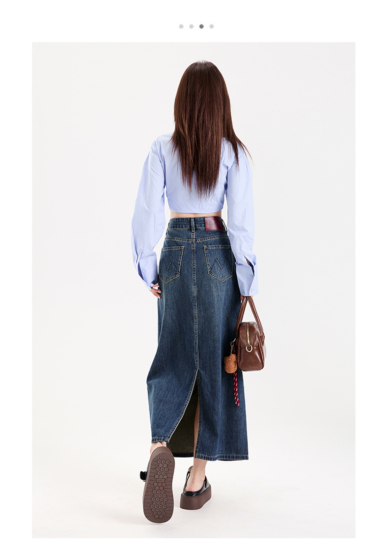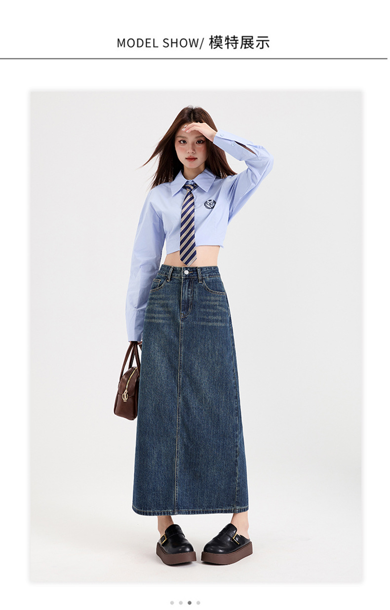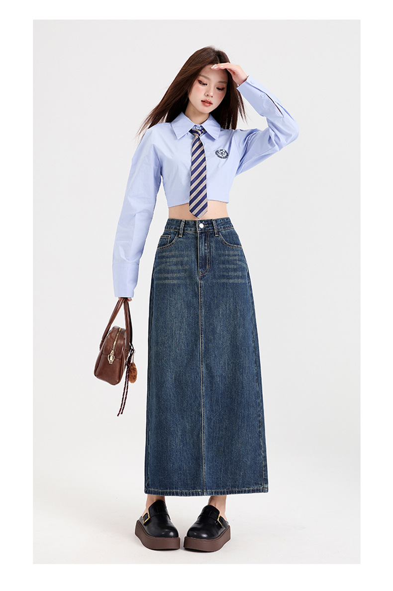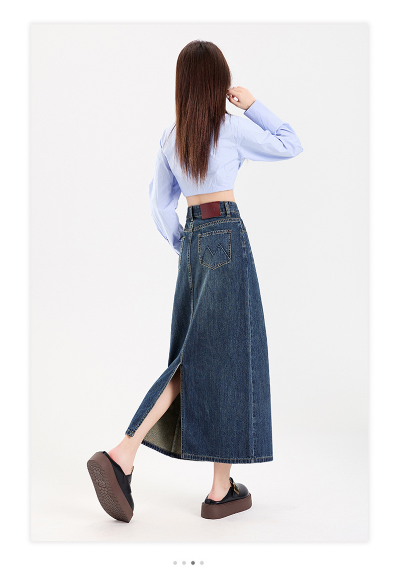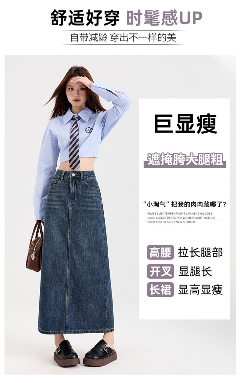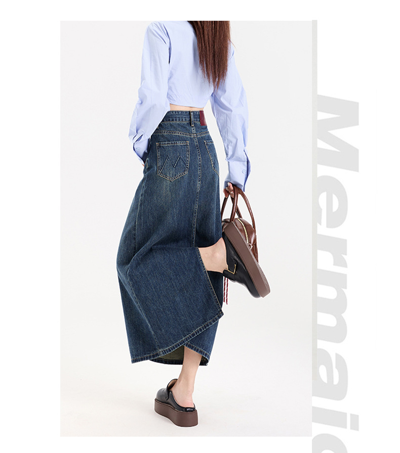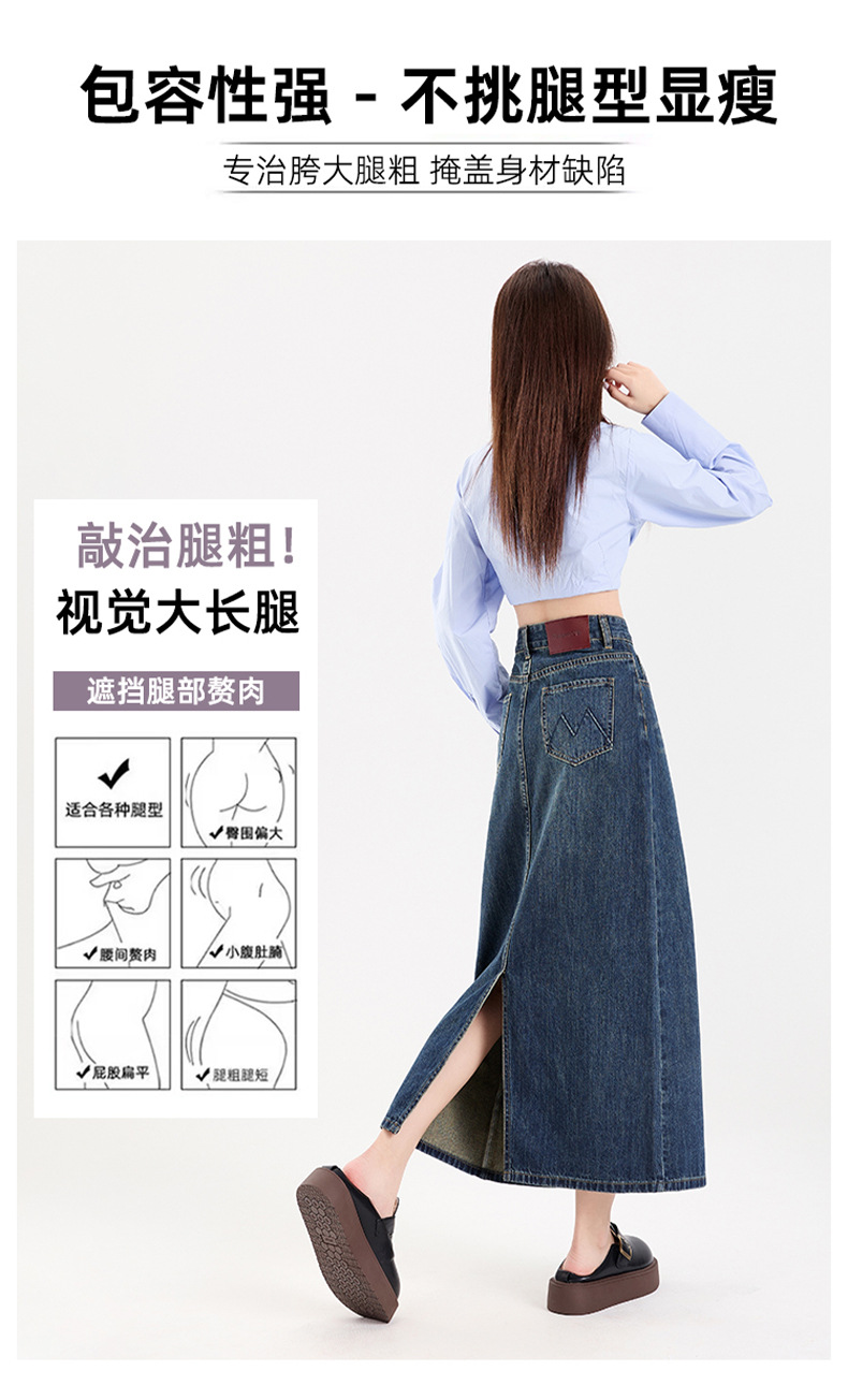 라이트 블루 수 놓은 높은 허리 데님 스커트 여성의 봄과 가을 2025 새로운 중간 길이 슬리밍 엉덩이 스커트 뜨거운 소녀 트렌디스토어 가기
