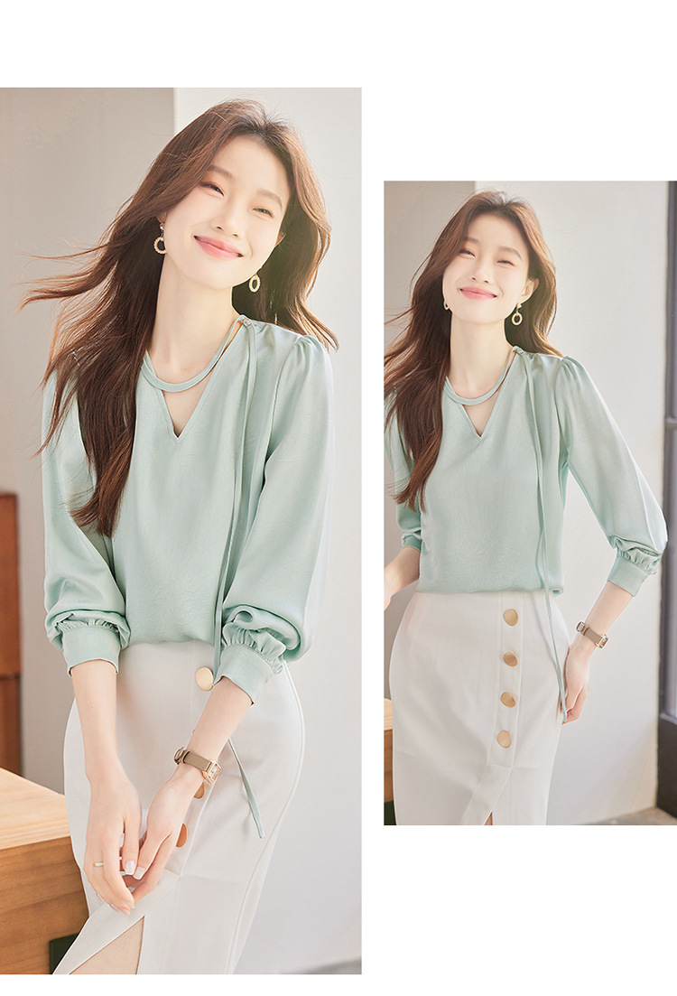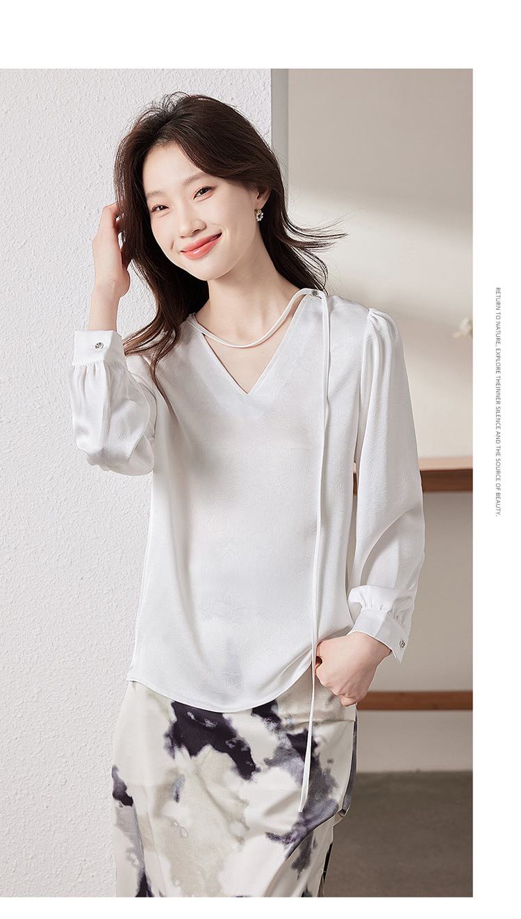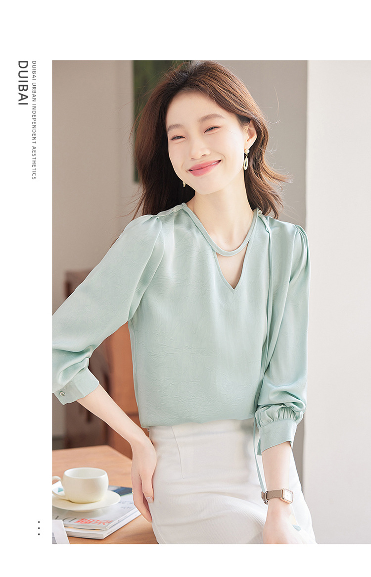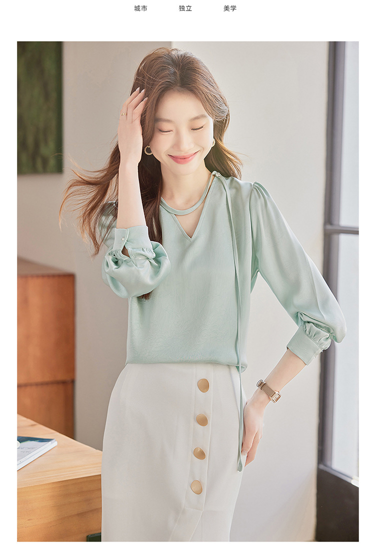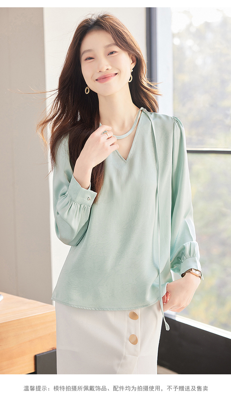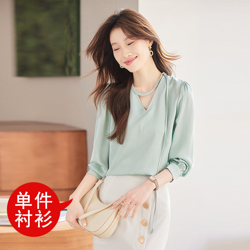 민트 그린 셔츠 여성 리본 탑 도매 봄과 여름 2025 새로운 패션 v-neck 여성용 긴 소매 쉬폰 셔츠스토어 가기