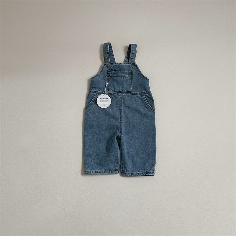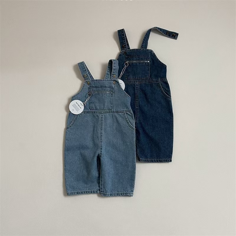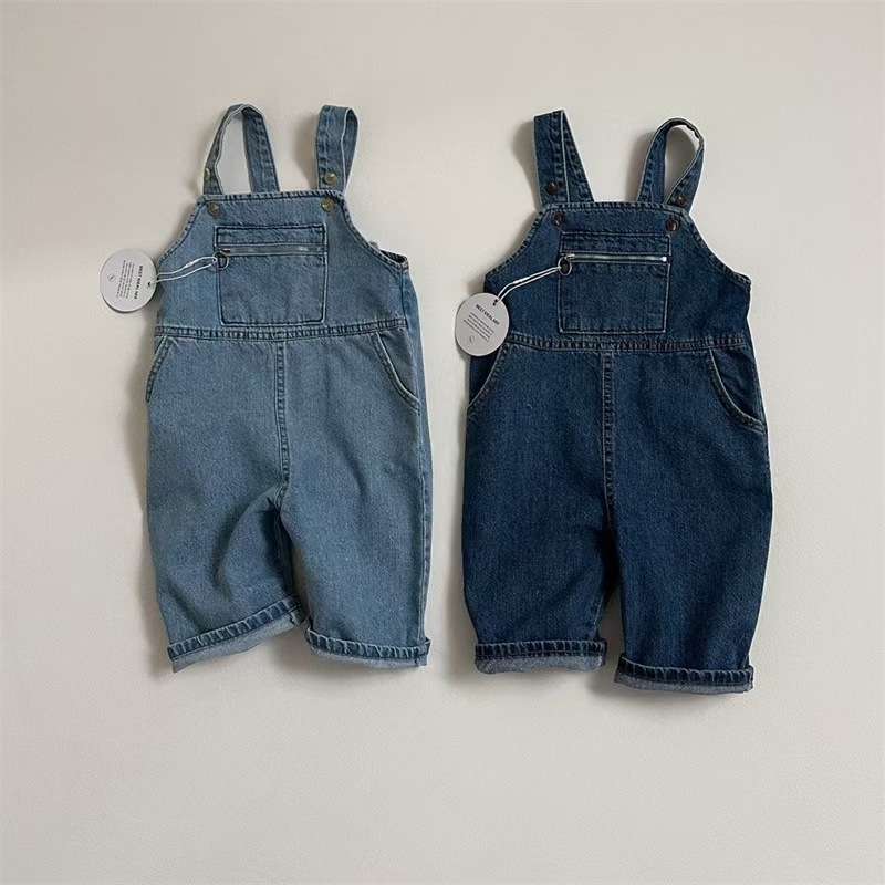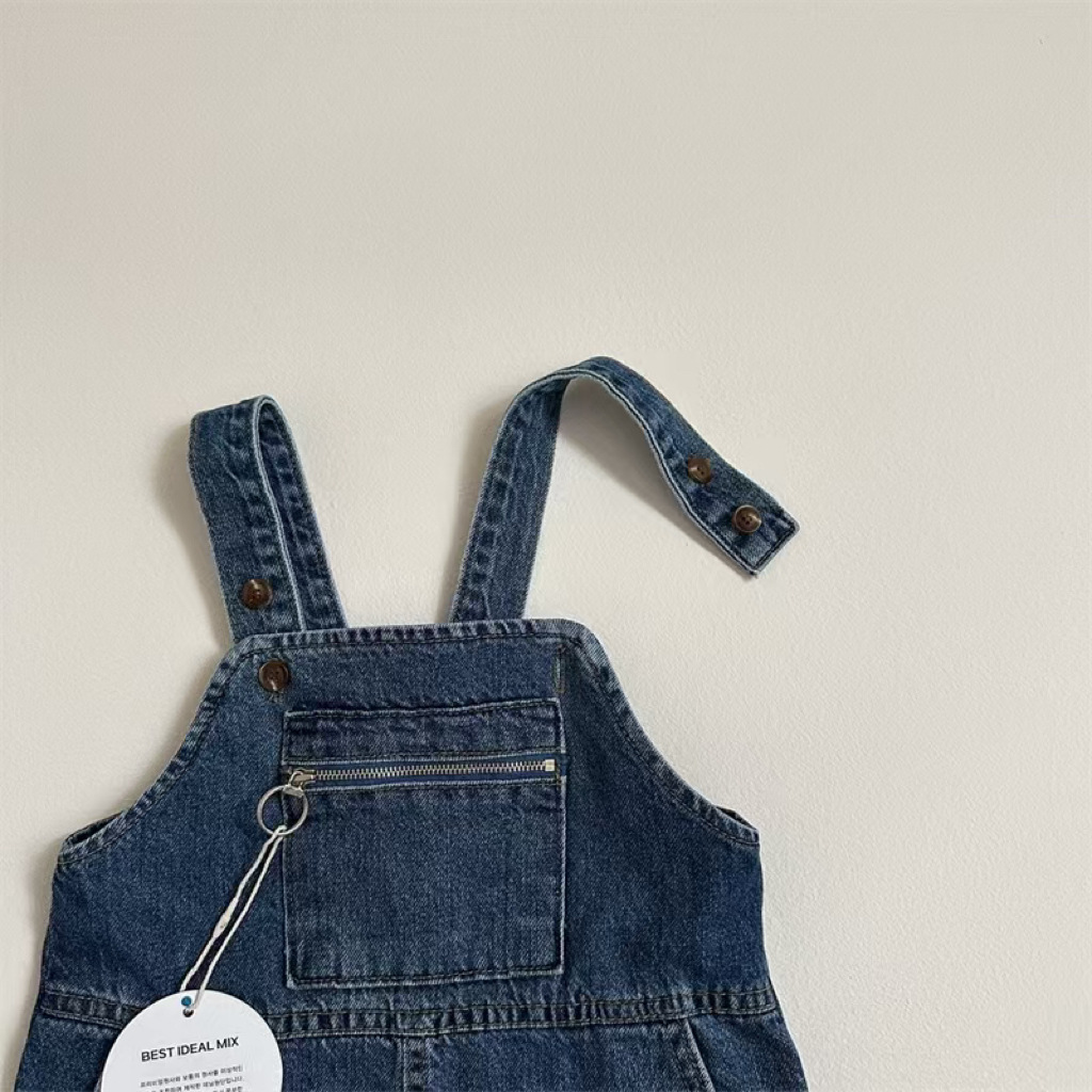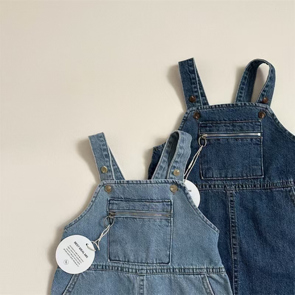 인스 한국 스타일 데님 멜빵 바지 가슴 지퍼 포켓 디자인 남녀 아기 의류 신상품 올 시즌용