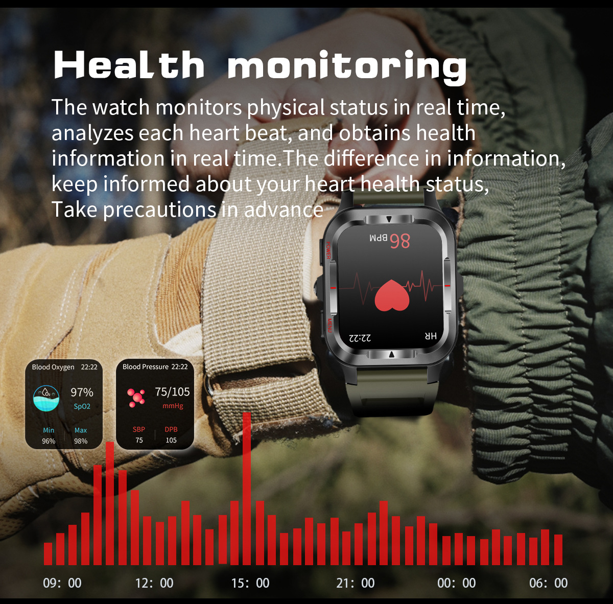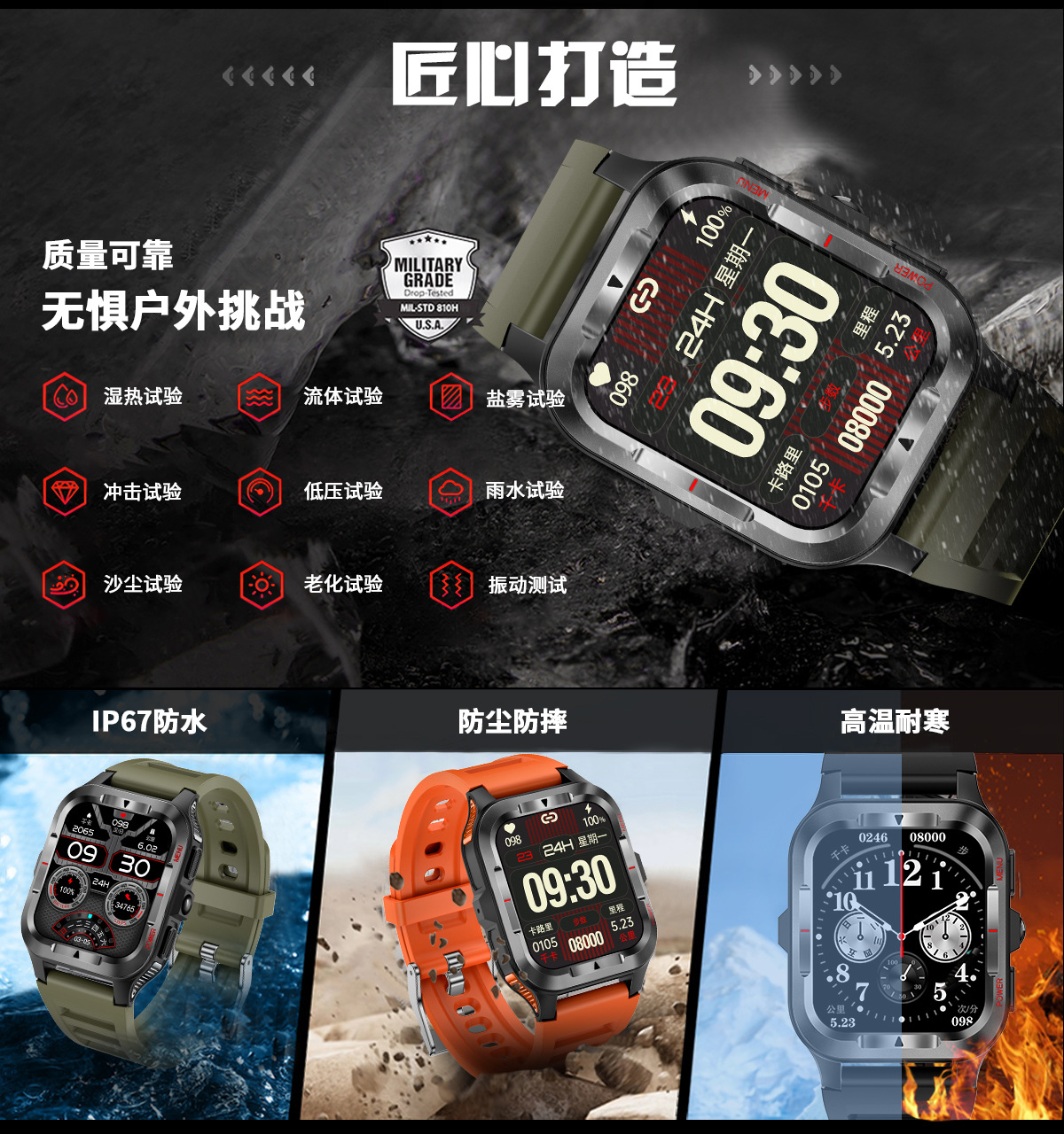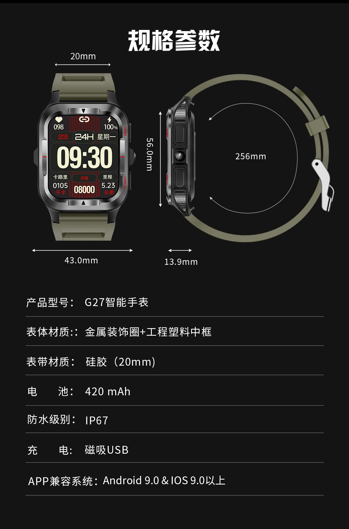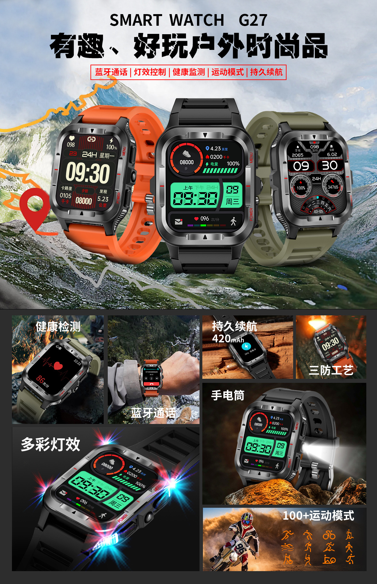 국경 간 새로운 G27 스마트 시계 블루투스 통화 심박수 혈압 모니터링 LED 조명 야외 3 개 방지 스포츠 시계
