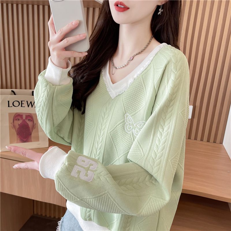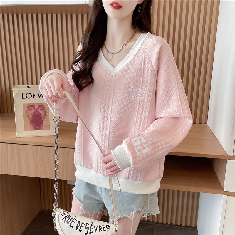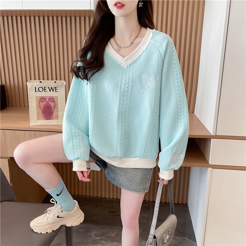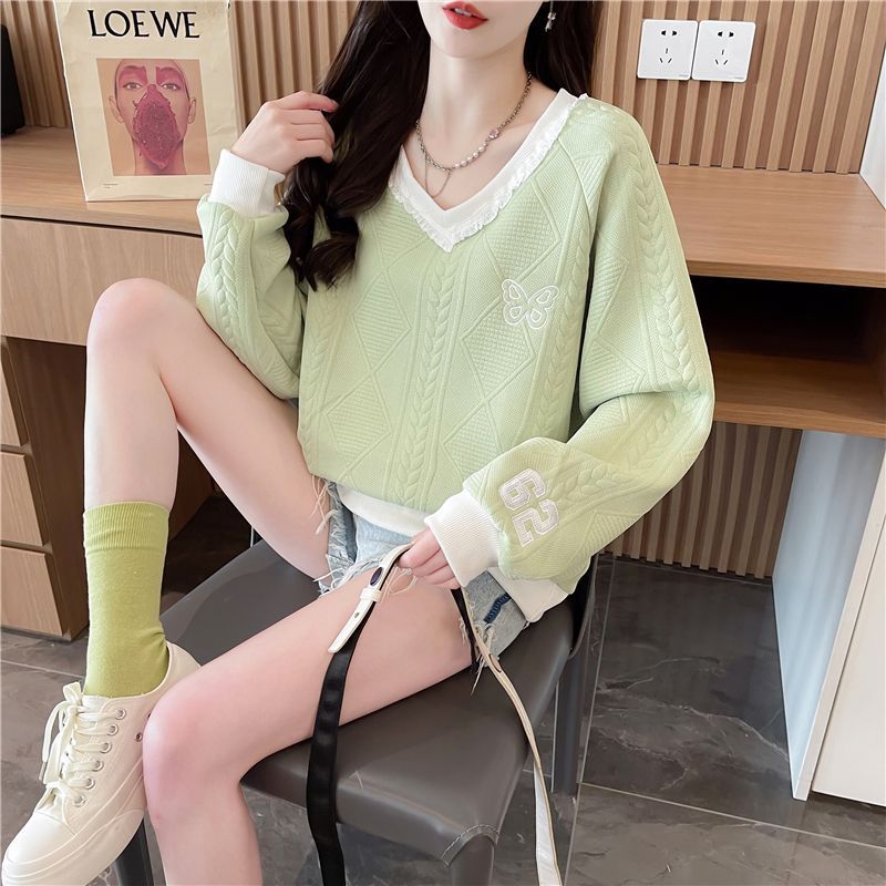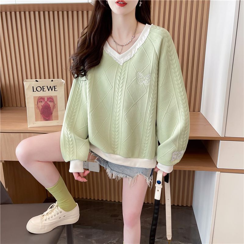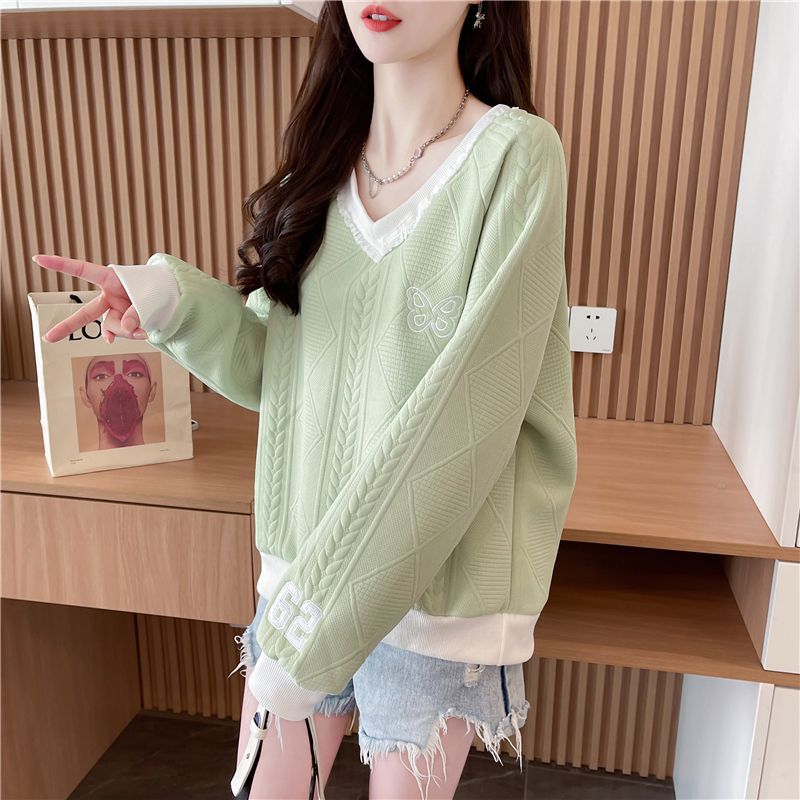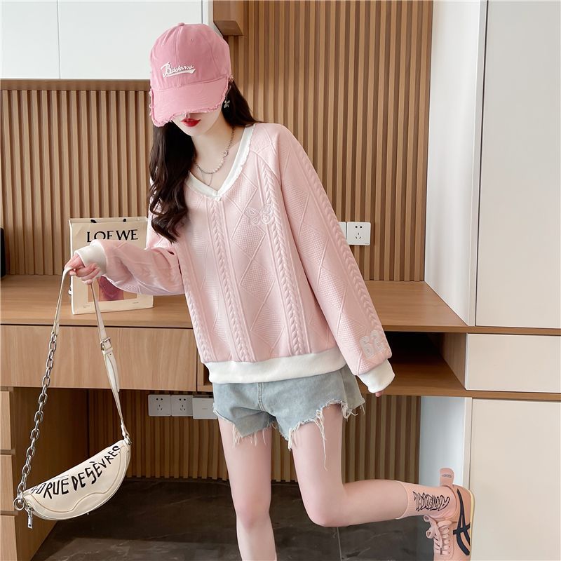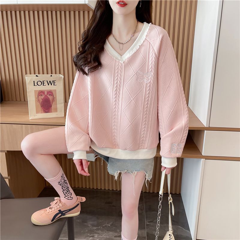 이른 봄 대비 V 넥 땀 여성의 봄과 가을 2025 새로운 느슨한 플러스 사이즈 작은 디자인 레이스 탑스토어 가기