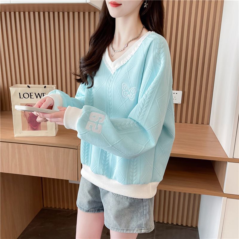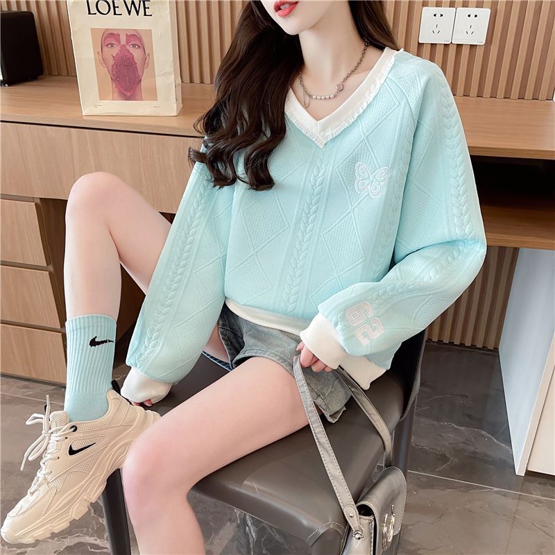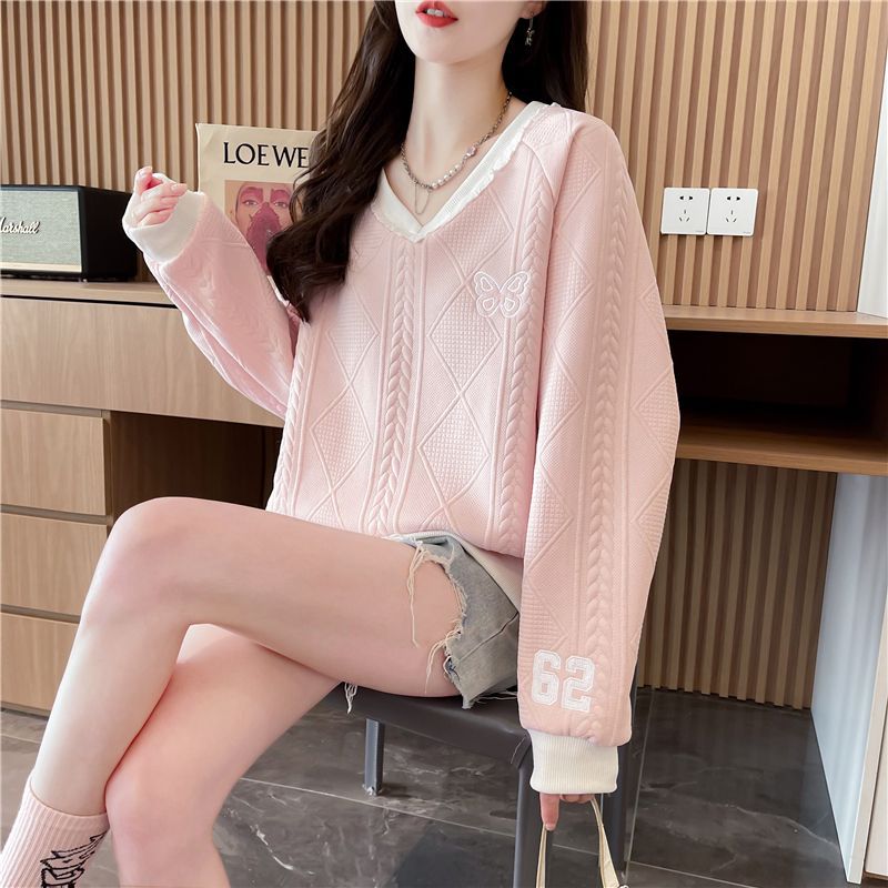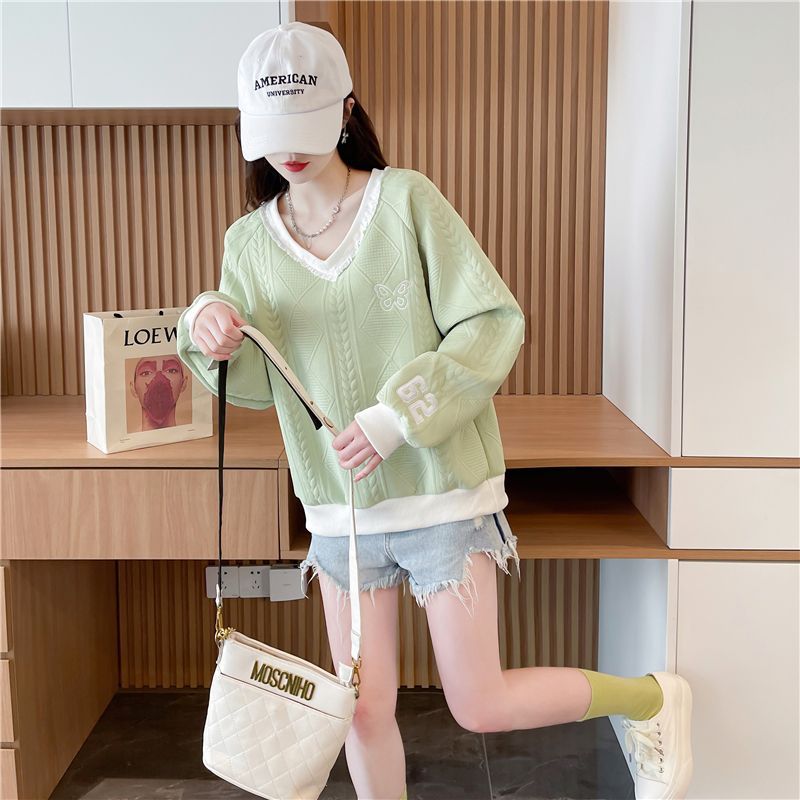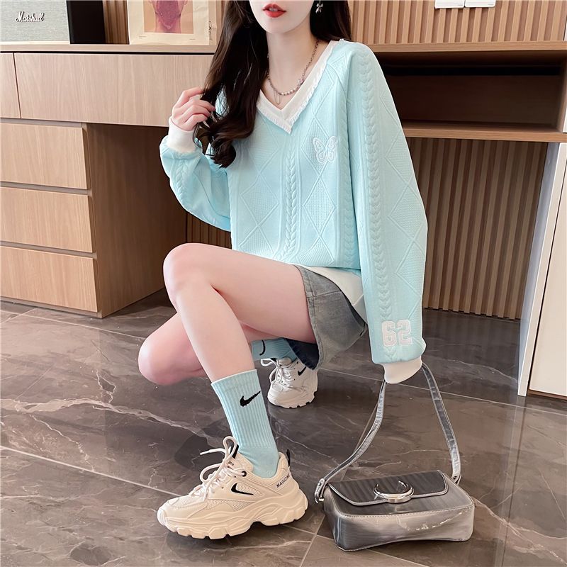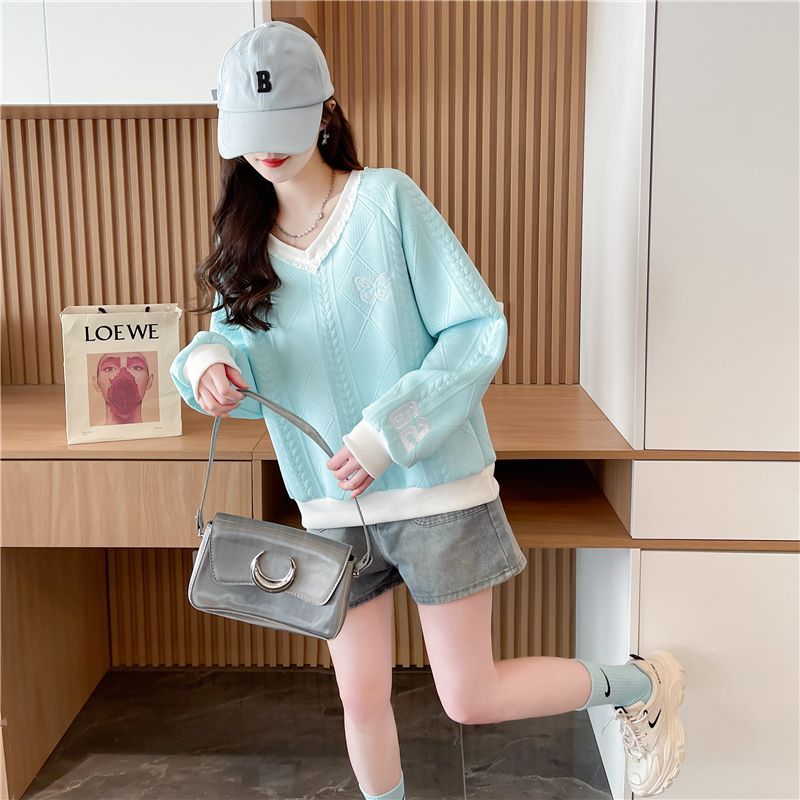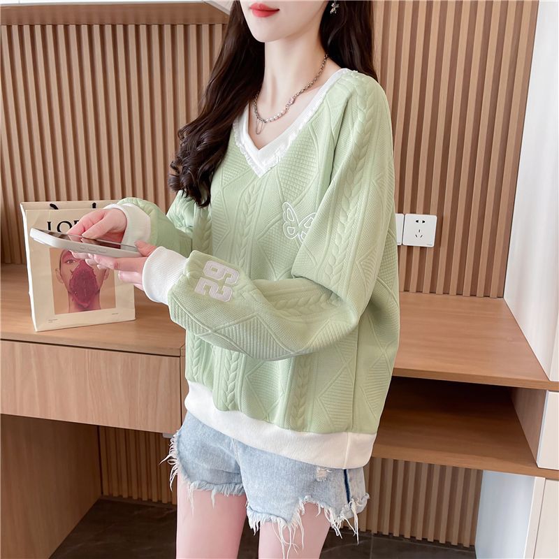 이른 봄 대비 V 넥 땀 여성의 봄과 가을 2025 새로운 느슨한 플러스 사이즈 작은 디자인 레이스 탑스토어 가기