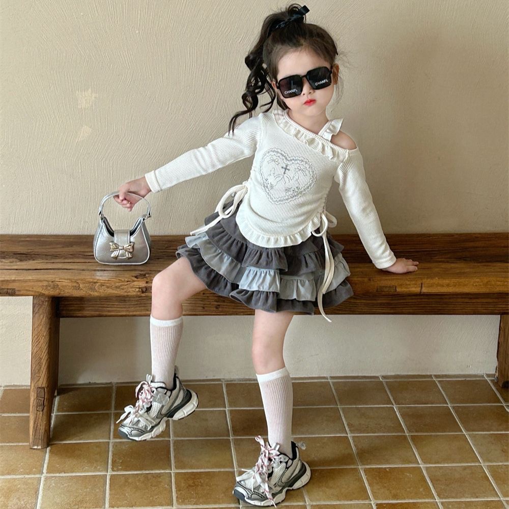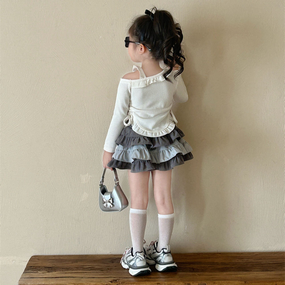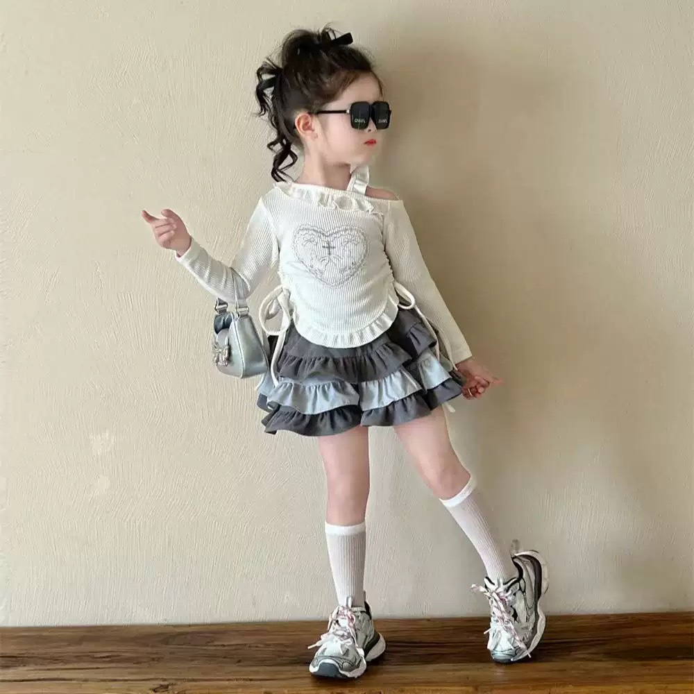 어린이 세련된 어깨베이스 셔츠 2025 봄 새 소녀 유행 치마 아기 투피스 케이크 스커트