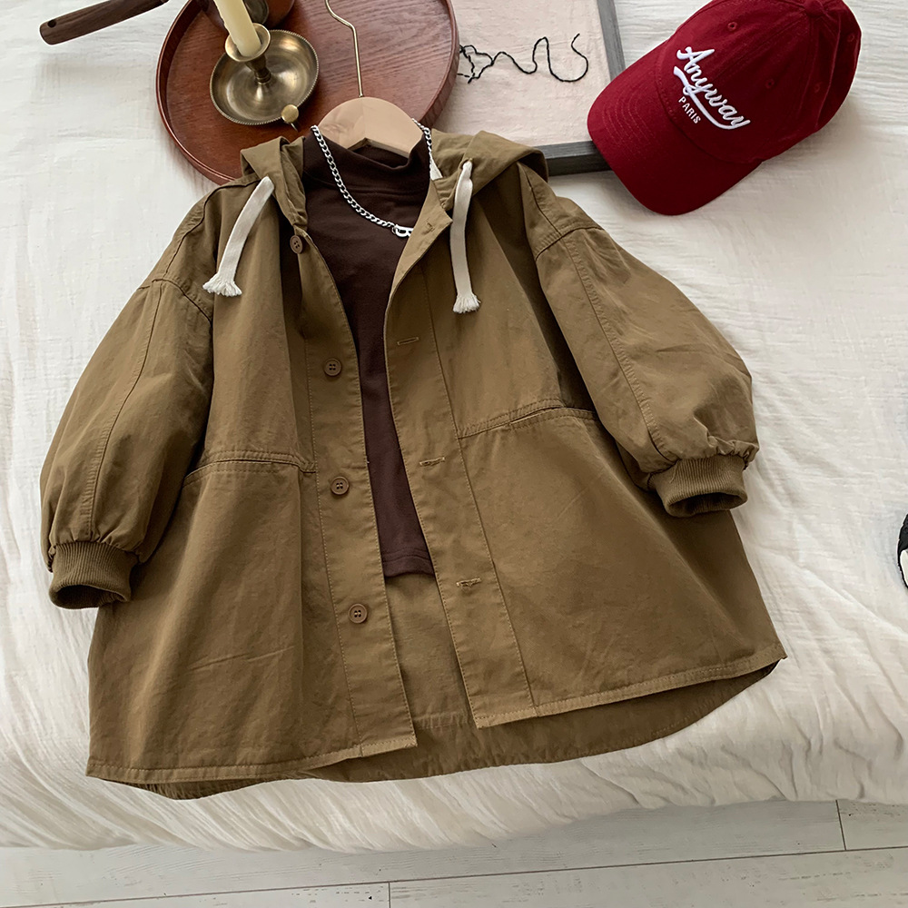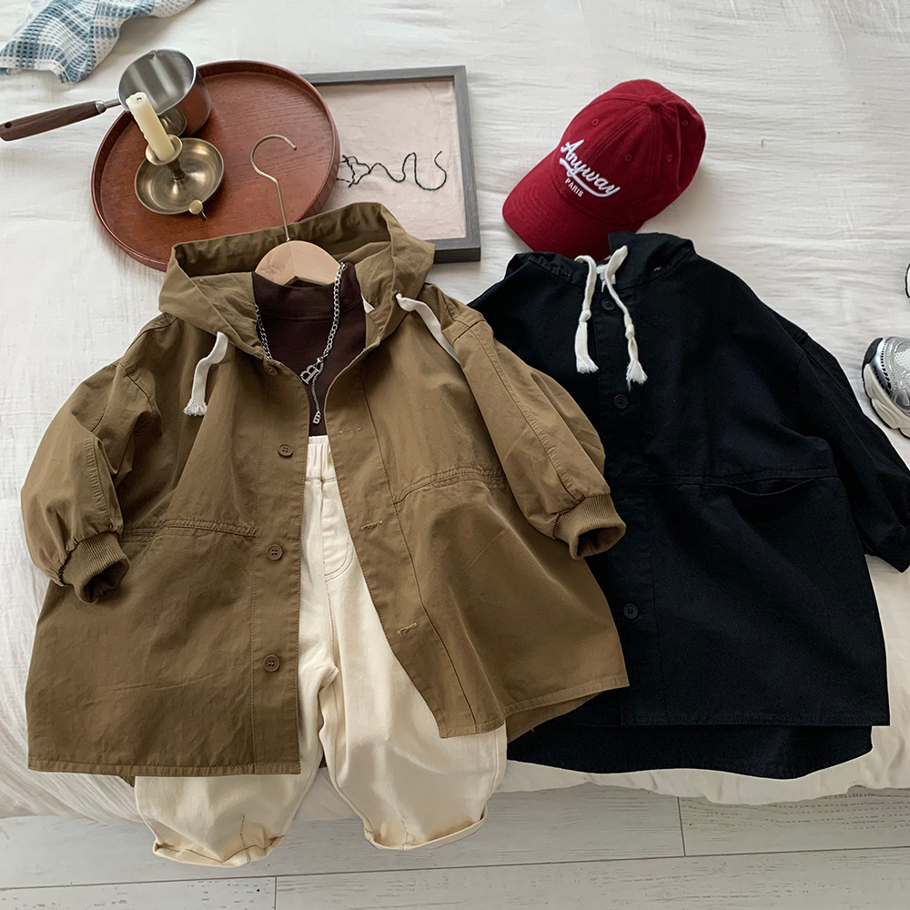 어린이 코트 봄 2025 새로운 한국 팬 파이 핸섬 느슨한 중간 길이의 후드 소년의 봄 옷스토어 가기
