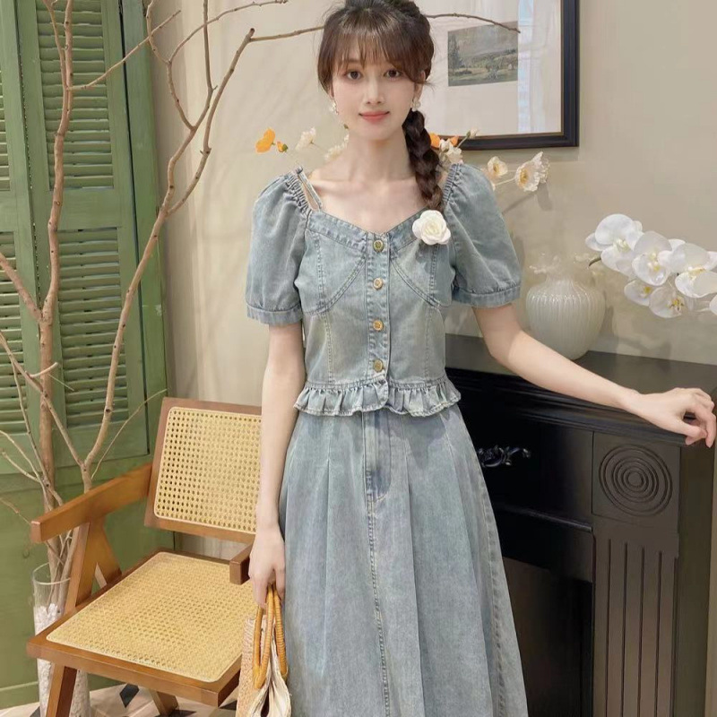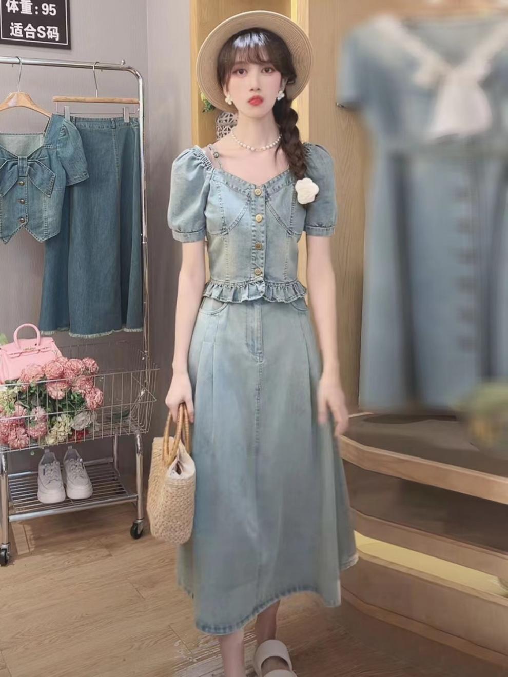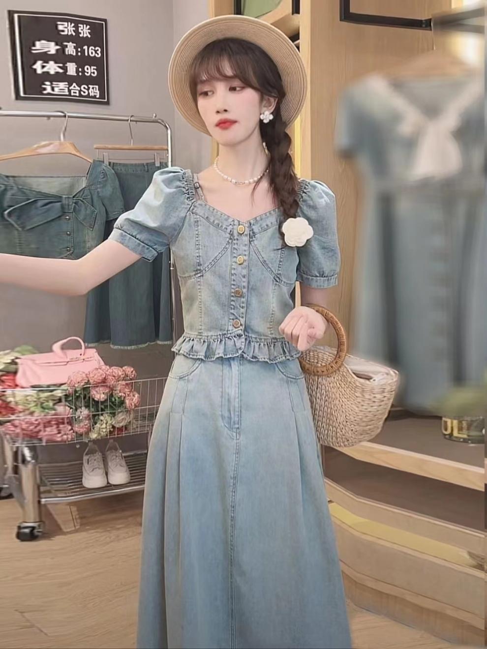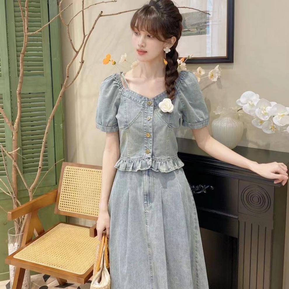 빈티지 우아한 데님 작은 셔츠 치마 세트 여성 여름 패션 슬리밍 반팔 최고 치마 투피스 유행 세트스토어 가기