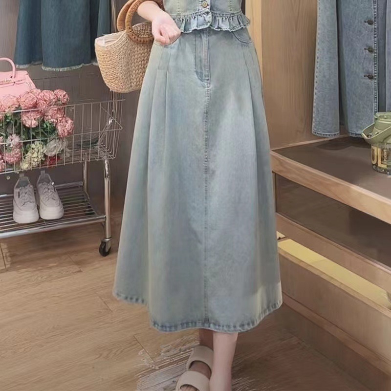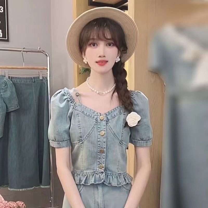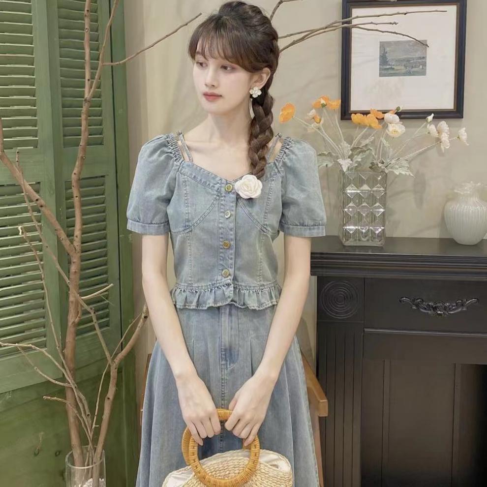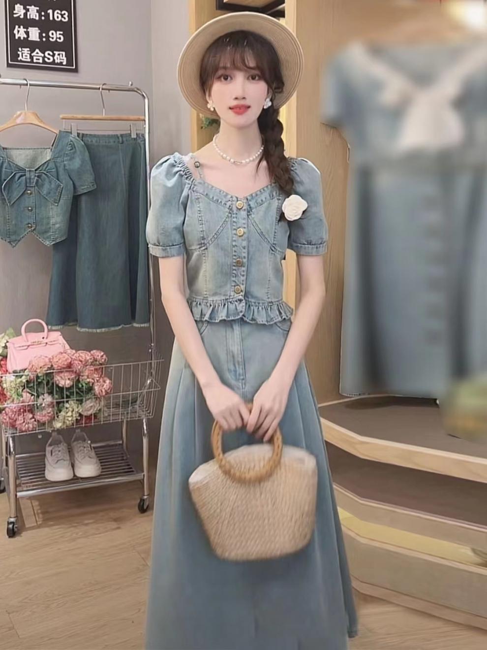 빈티지 우아한 데님 작은 셔츠 치마 세트 여성 여름 패션 슬리밍 반팔 최고 치마 투피스 유행 세트스토어 가기
