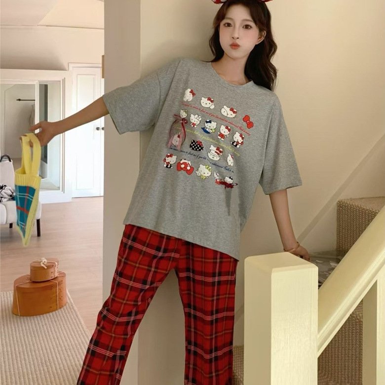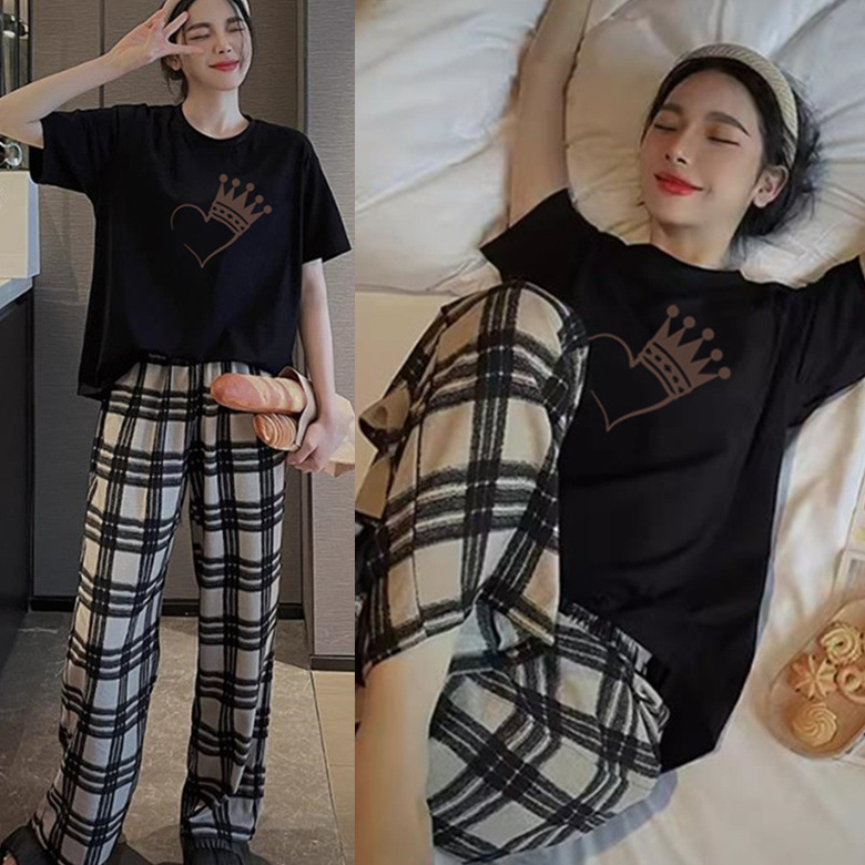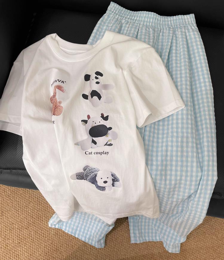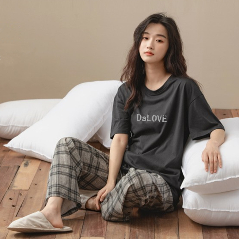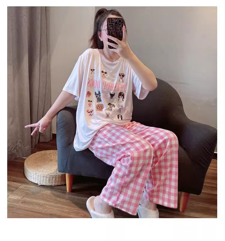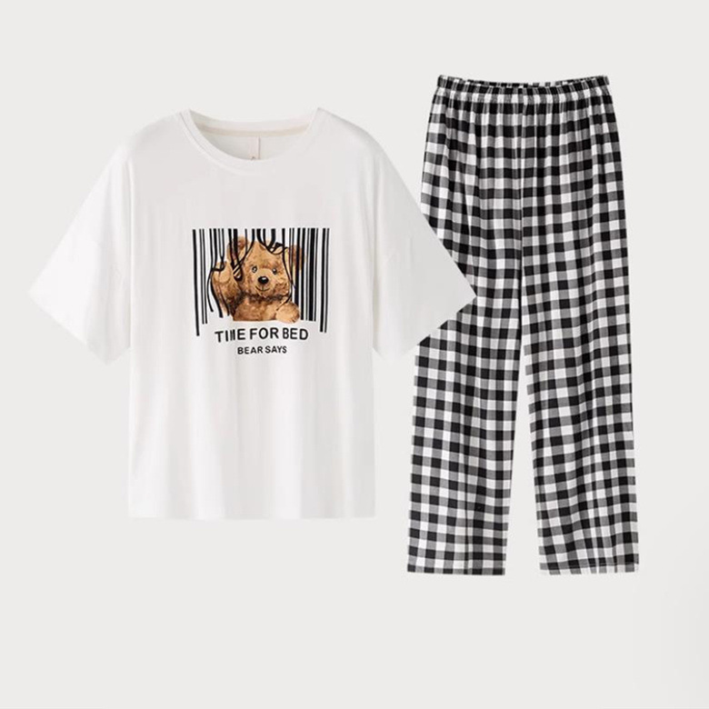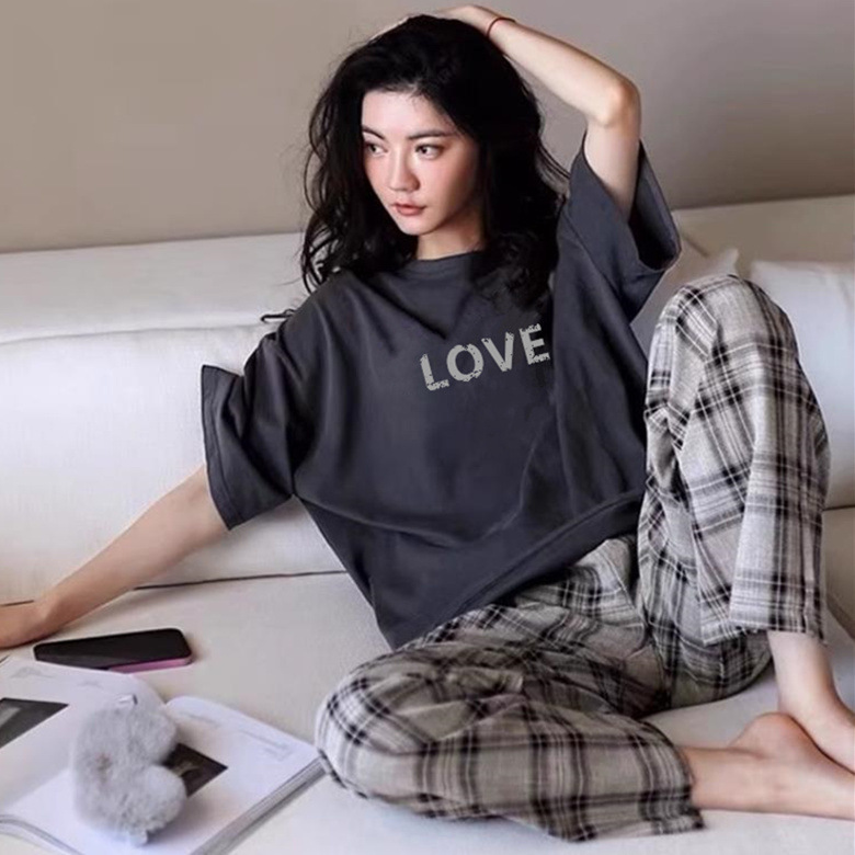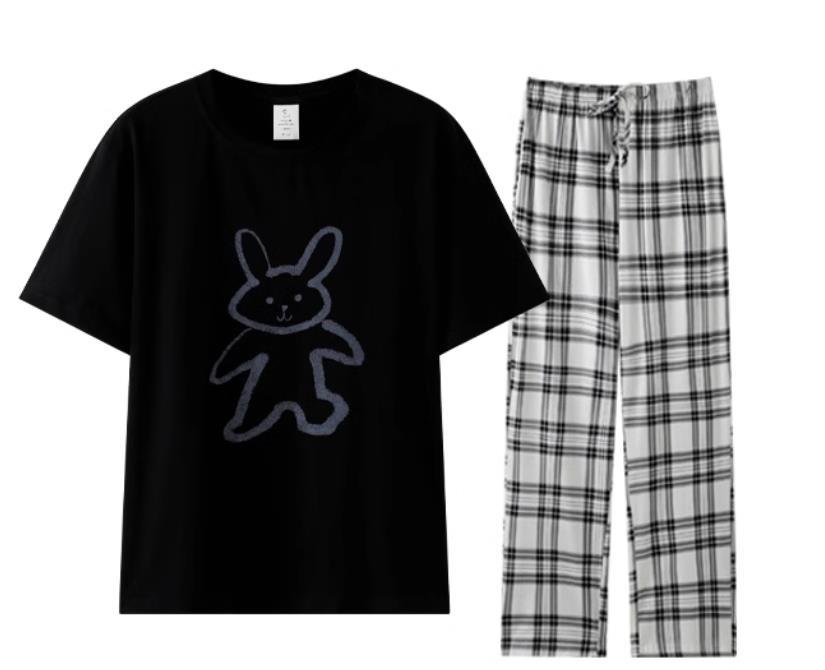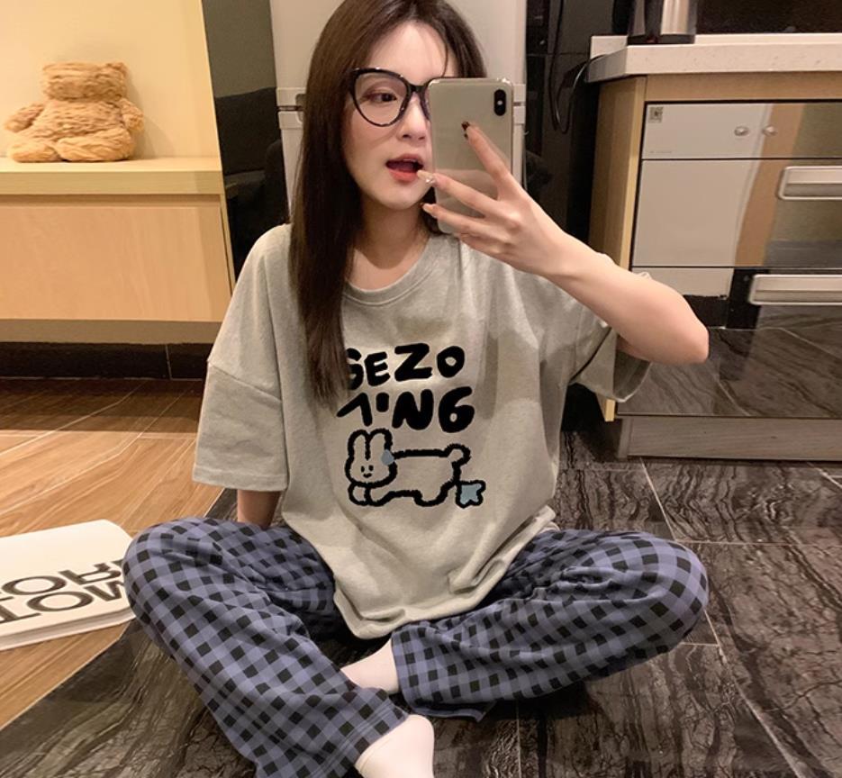 대외 무역 2025 새로운 스타일 잠옷 여성 반팔 바지 느슨한 만화 캐주얼 간단한 체크 무늬 세트 홈 옷스토어 가기