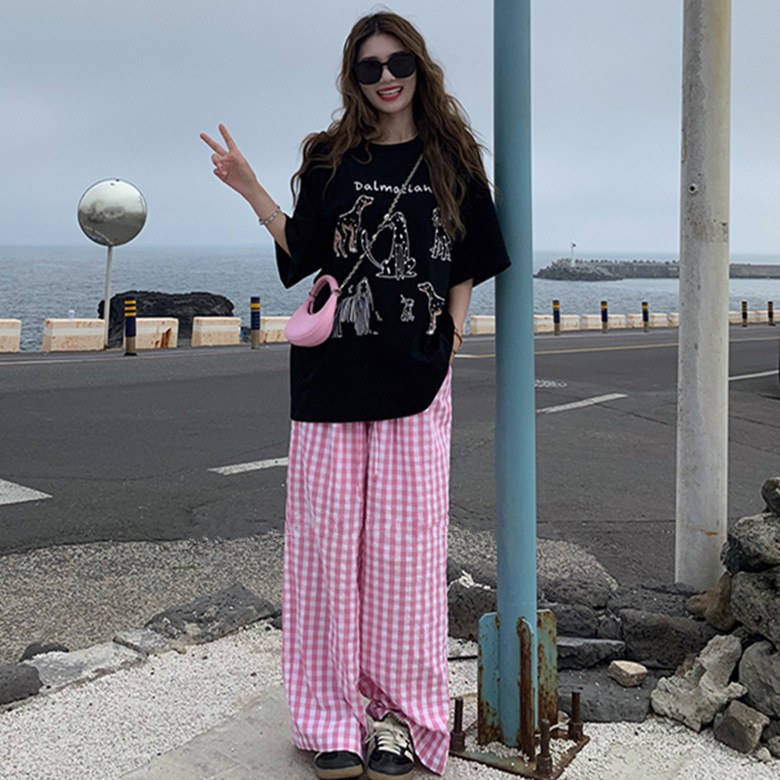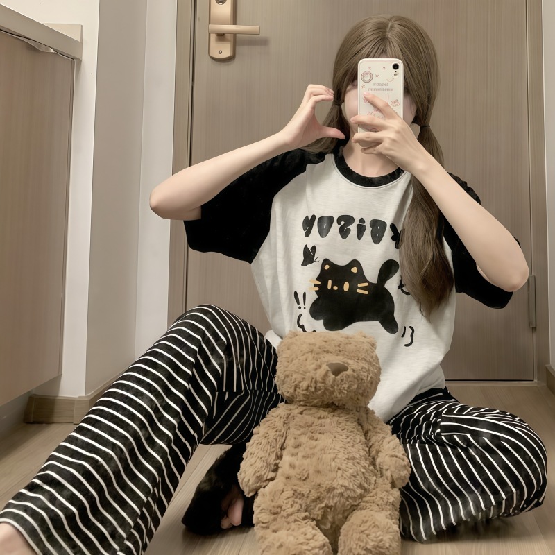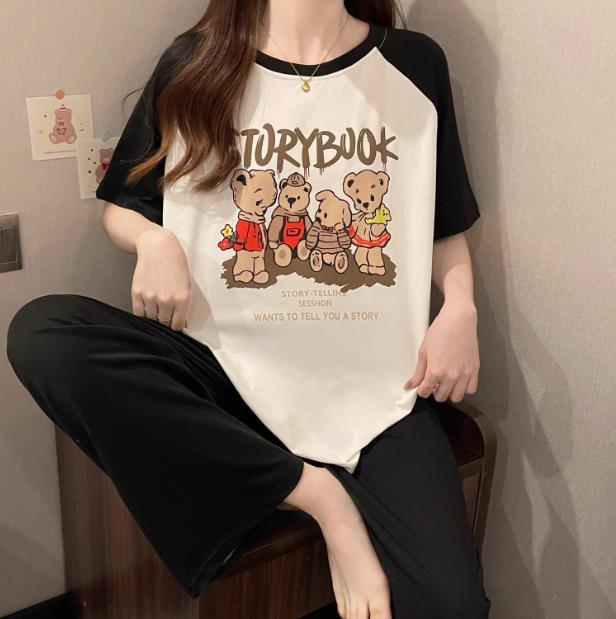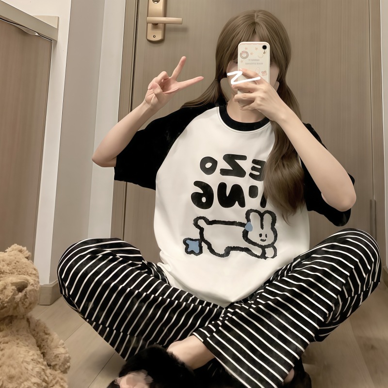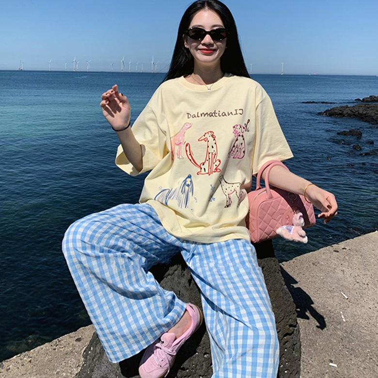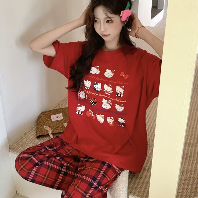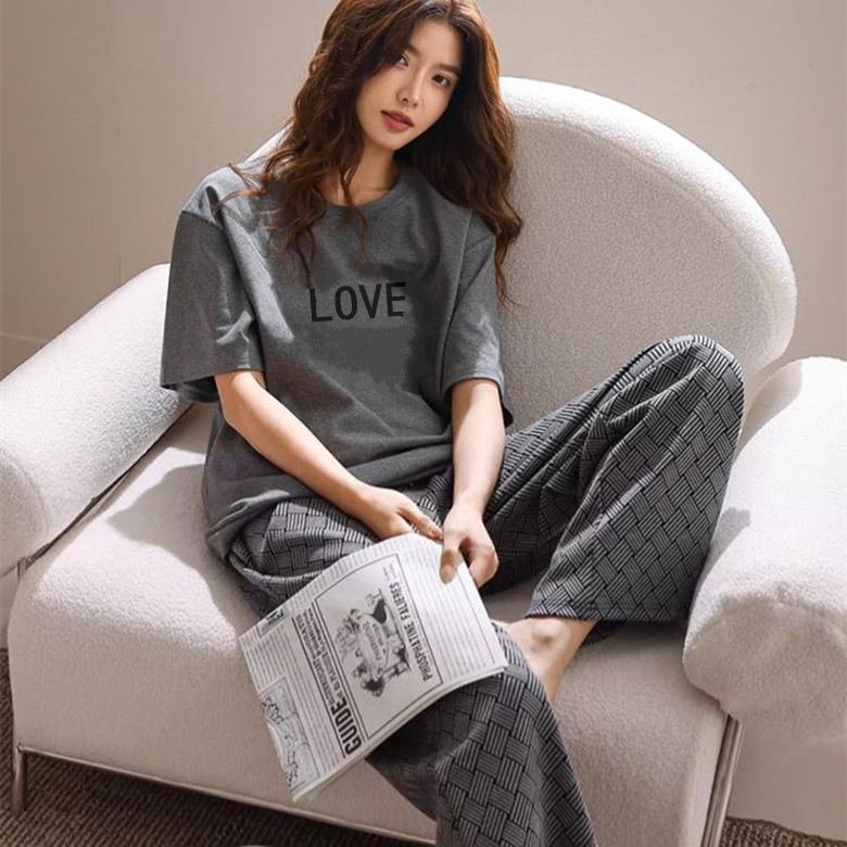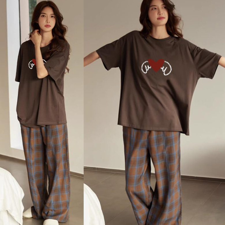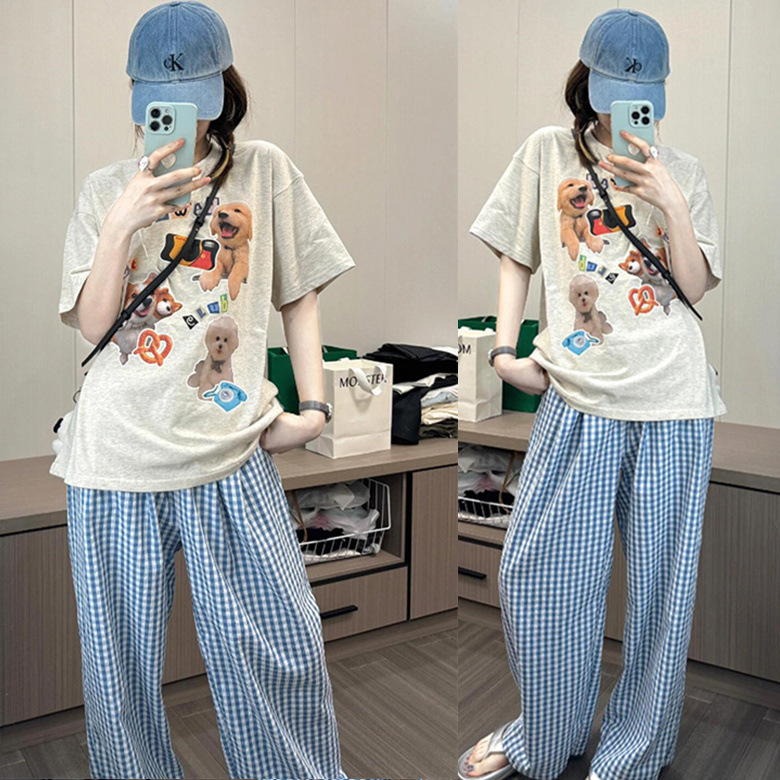 대외 무역 2025 새로운 스타일 잠옷 여성 반팔 바지 느슨한 만화 캐주얼 간단한 체크 무늬 세트 홈 옷스토어 가기