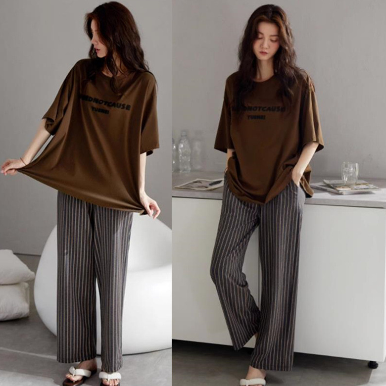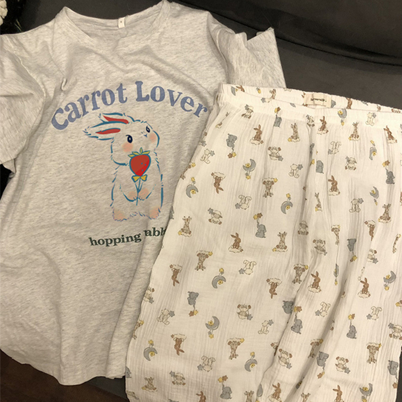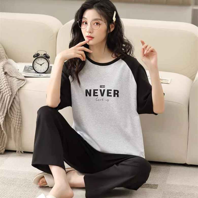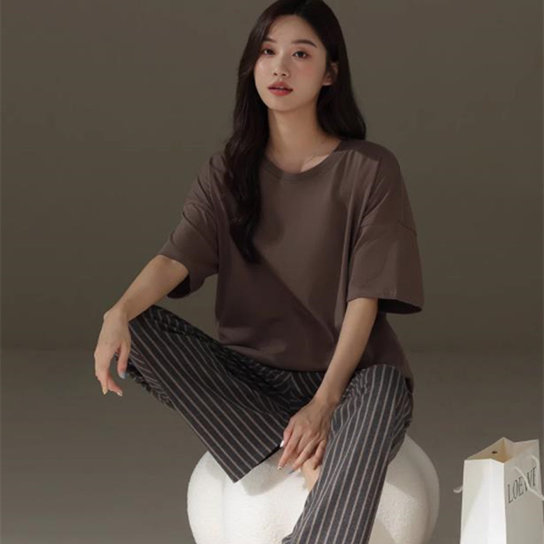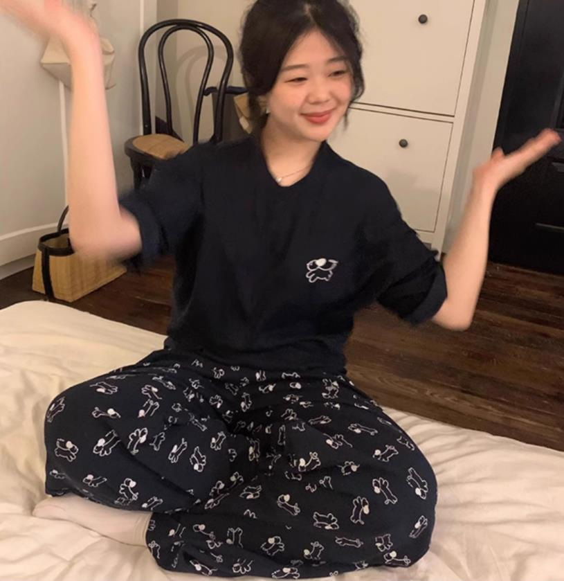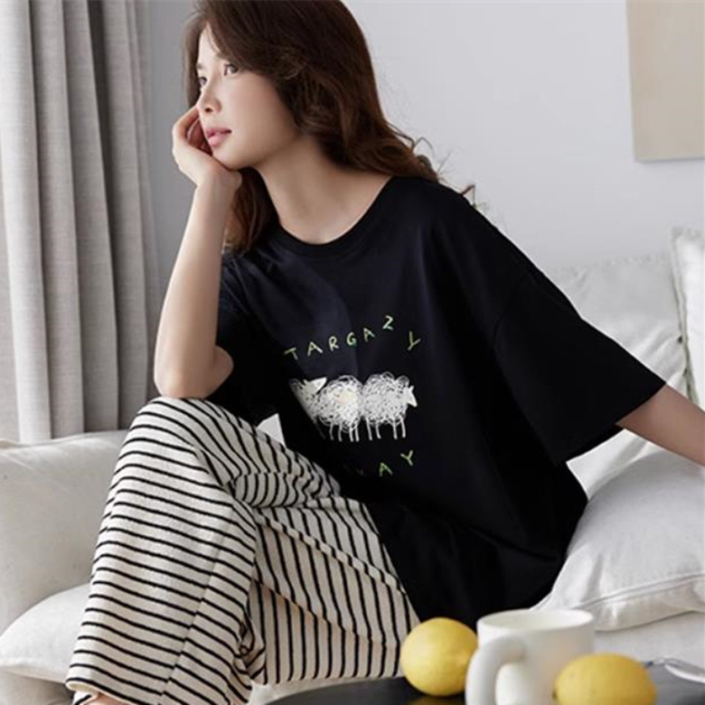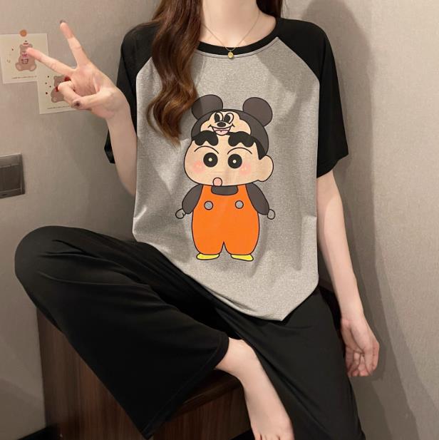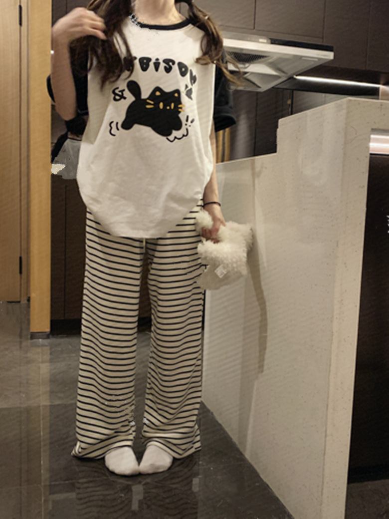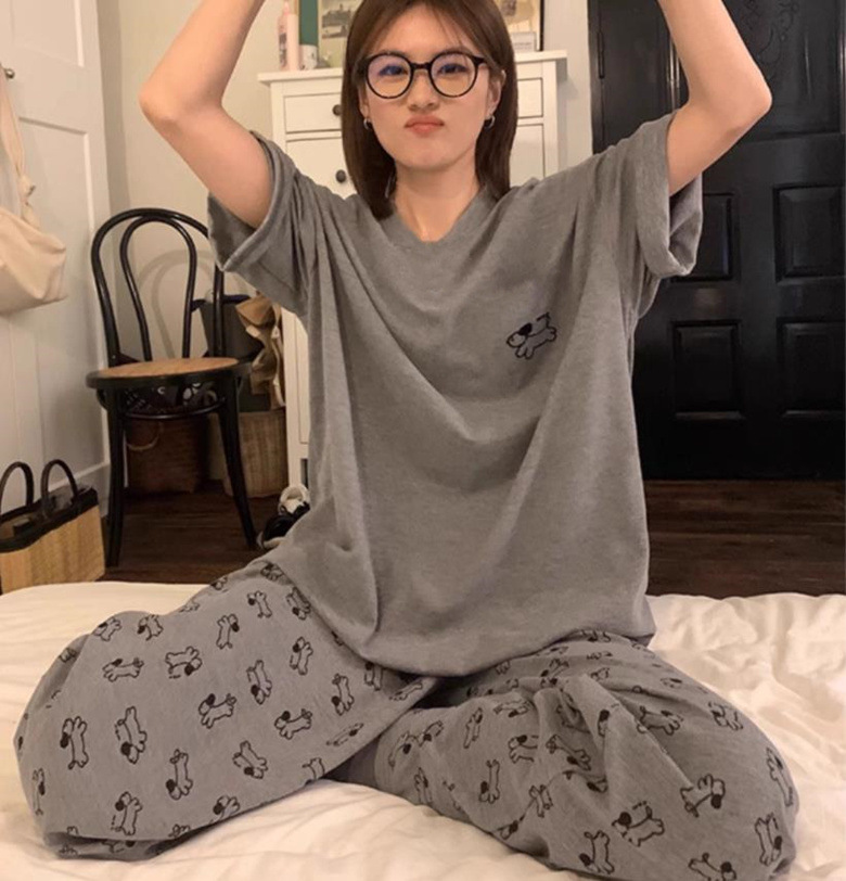 대외 무역 2025 새로운 스타일 잠옷 여성 반팔 바지 느슨한 만화 캐주얼 간단한 체크 무늬 세트 홈 옷스토어 가기