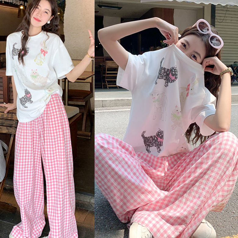 • 흰색 6 동물 핑크 체크 무늬 반바지와 긴 바지