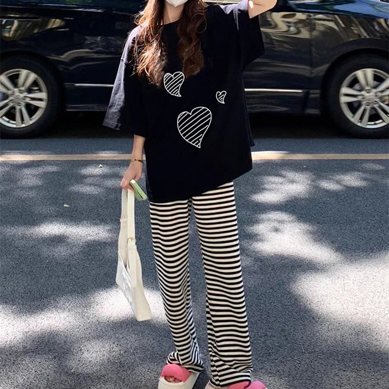 • 블랙 3 화이트 하트 화이트 스트라이프 팬츠 쇼트 롱