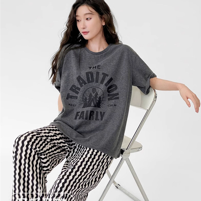 • 흑백 문자 회색 스트레이트 팬츠 짧고 긴