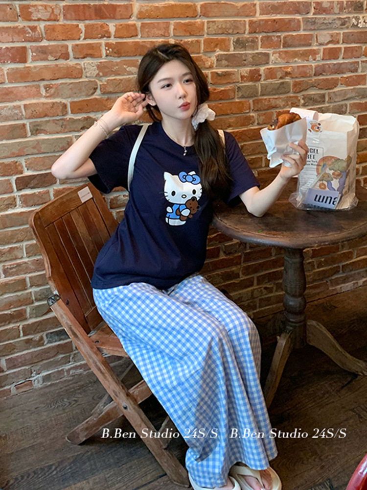 • 남색 KT 고양이 파란색 체크무늬 반바지와 긴바지