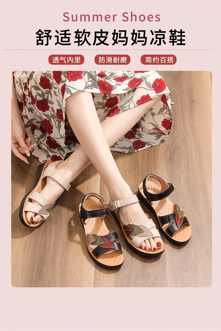 2025 새로운 여름 어머니 샌들 부드러운 가죽 부드러운 밑바닥 편안한 샌들 평면 미끄럼 방지 오픈 발가락 여성 신발 중년 및 노인