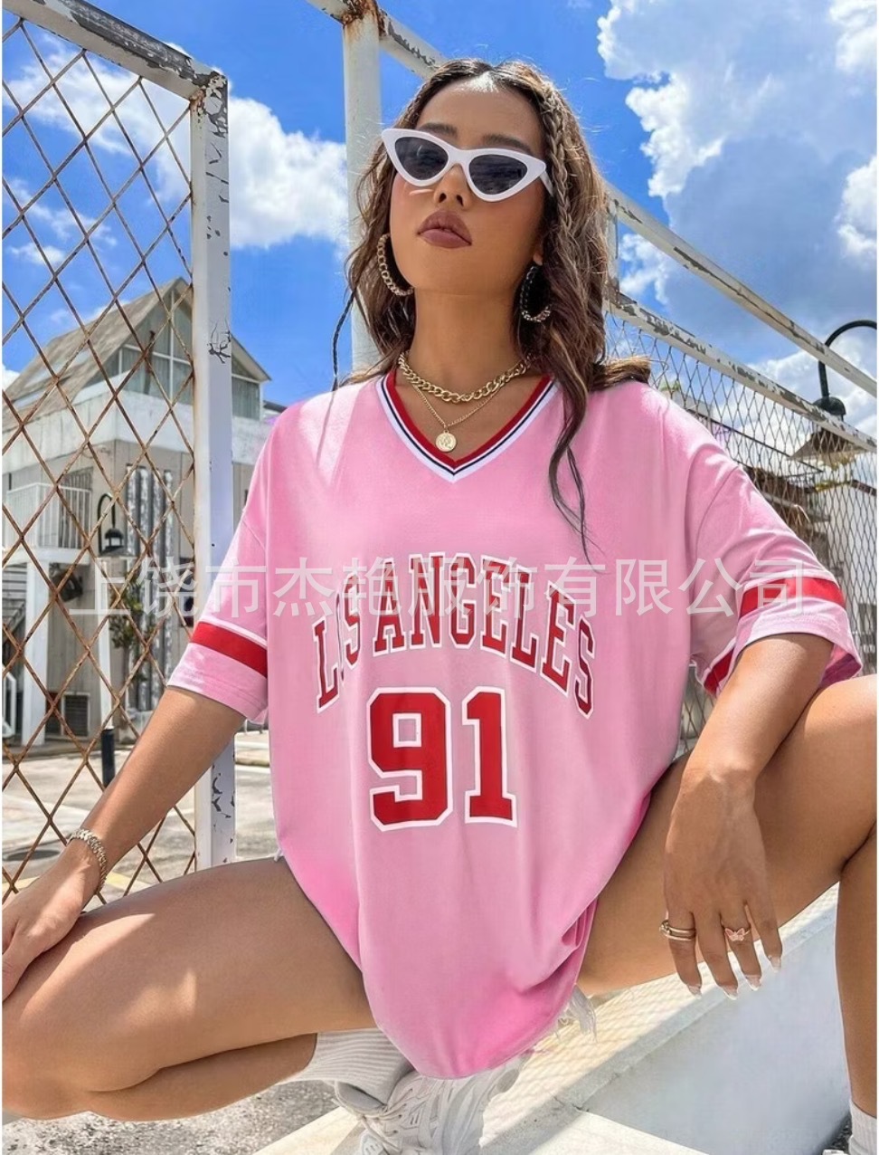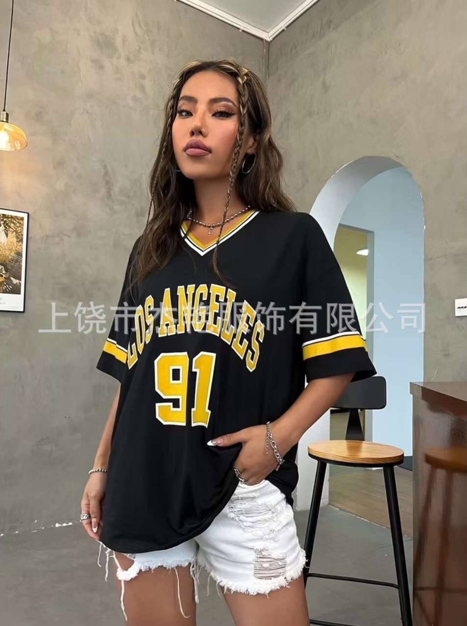 줄무늬 트림 V-Neck 느슨한 티셔츠 여성 유럽과 미국의 스포츠 로스 앵글 인쇄 탑