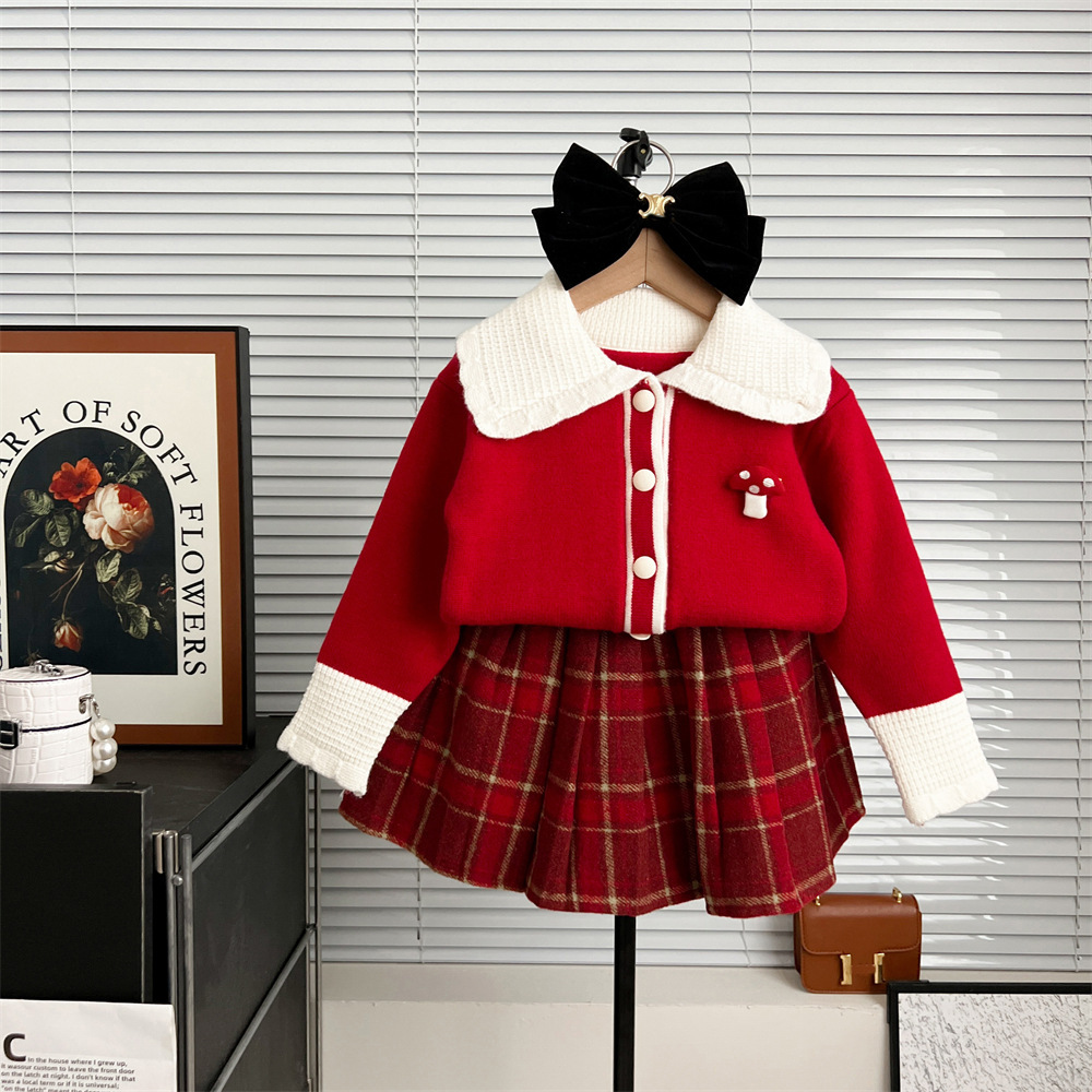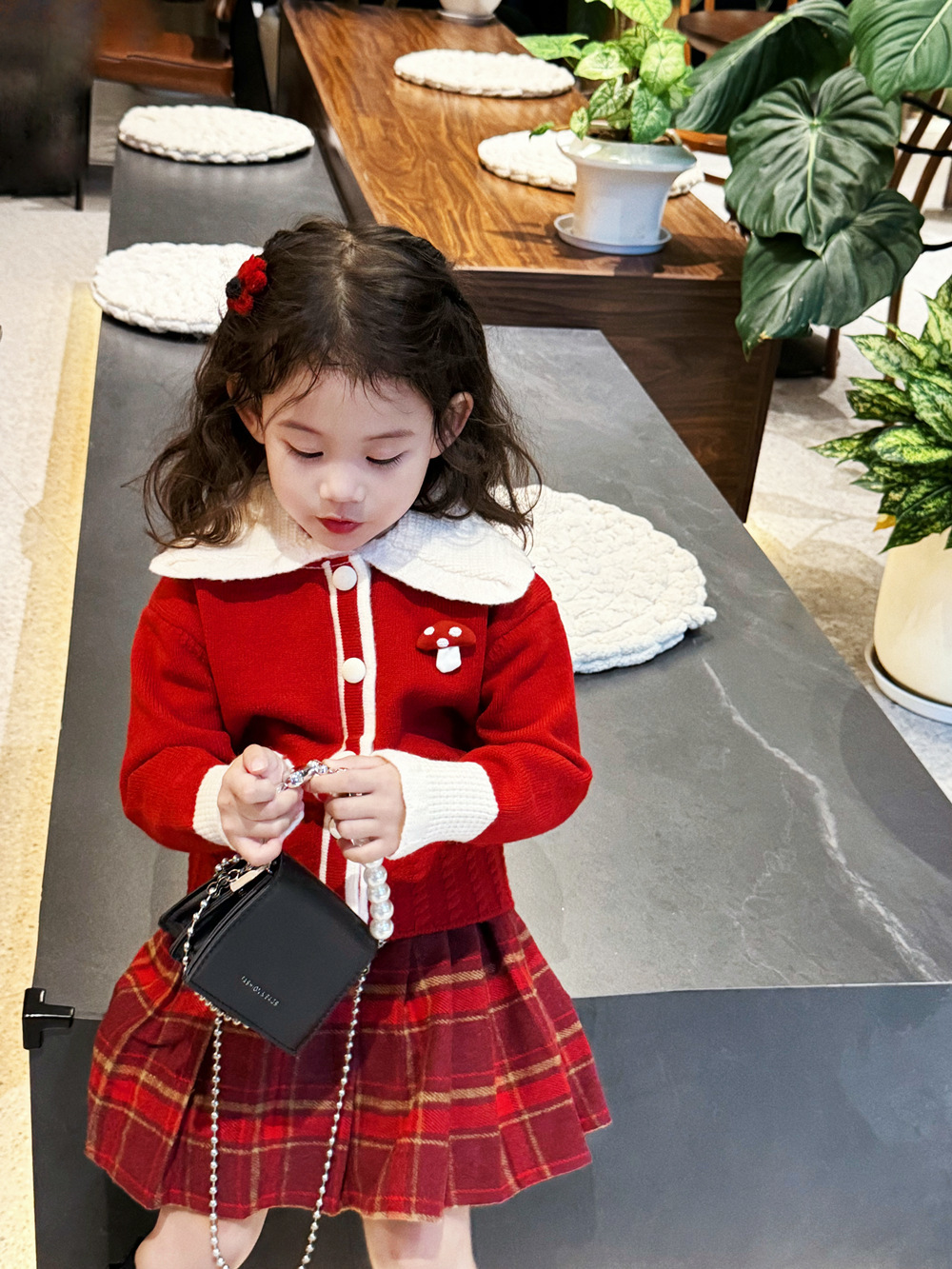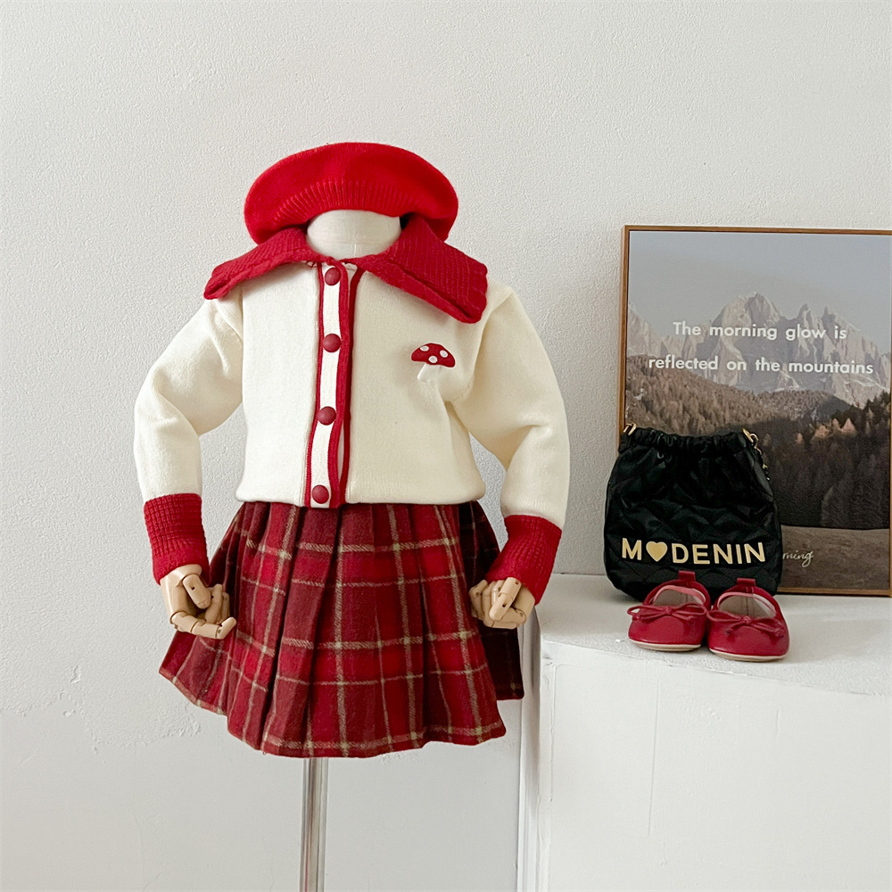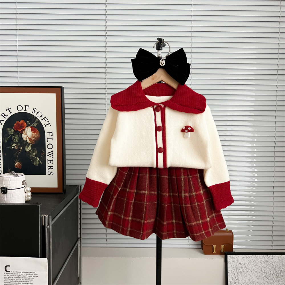 2025 가을과 겨울 새로운 소녀 한국어 버전의 학술 스타일 스웨터 세트 여성 보물 스웨터 카디건 플리츠 스커트 투피스 세트