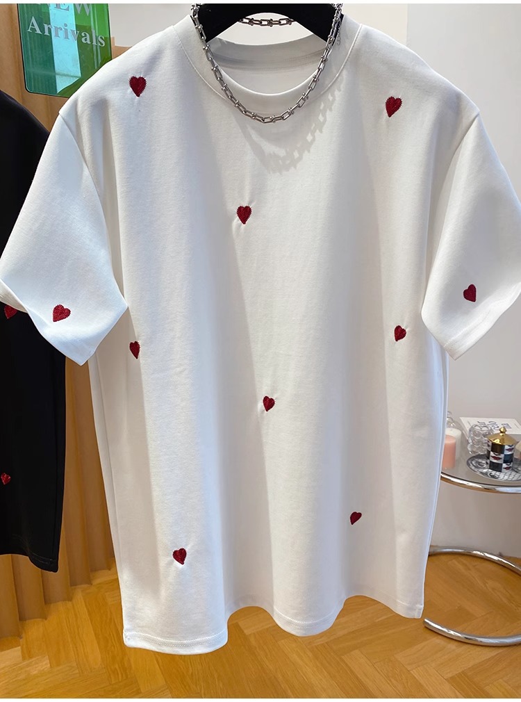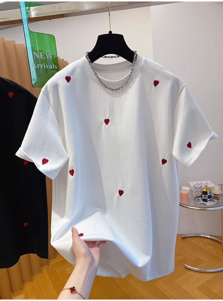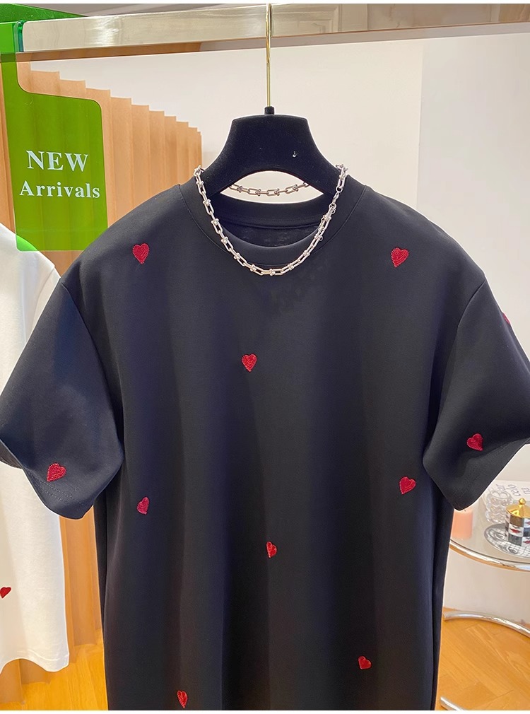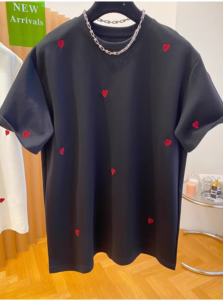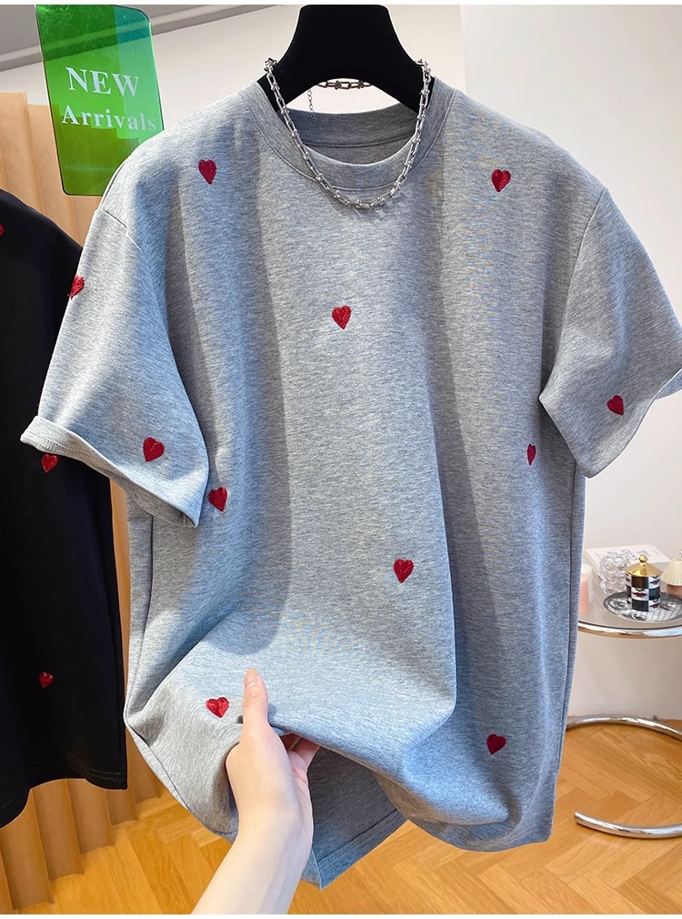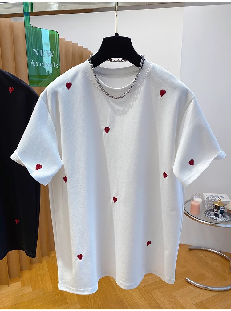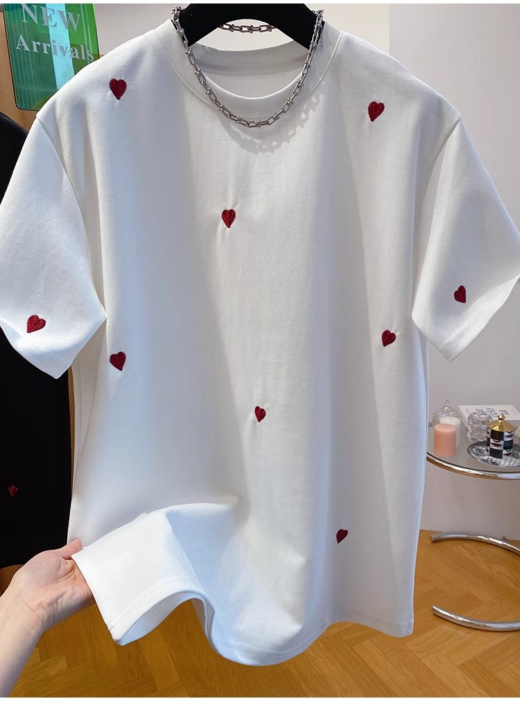 유럽 고급 사랑 자수 티셔츠 여성용 반팔 2025 새로운 느슨한 내부 순수 면베이스 셔츠 탑 봄스토어 가기