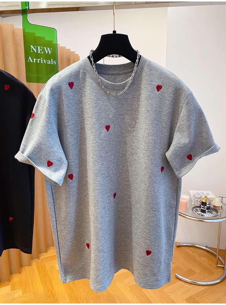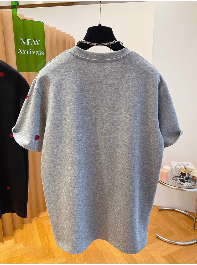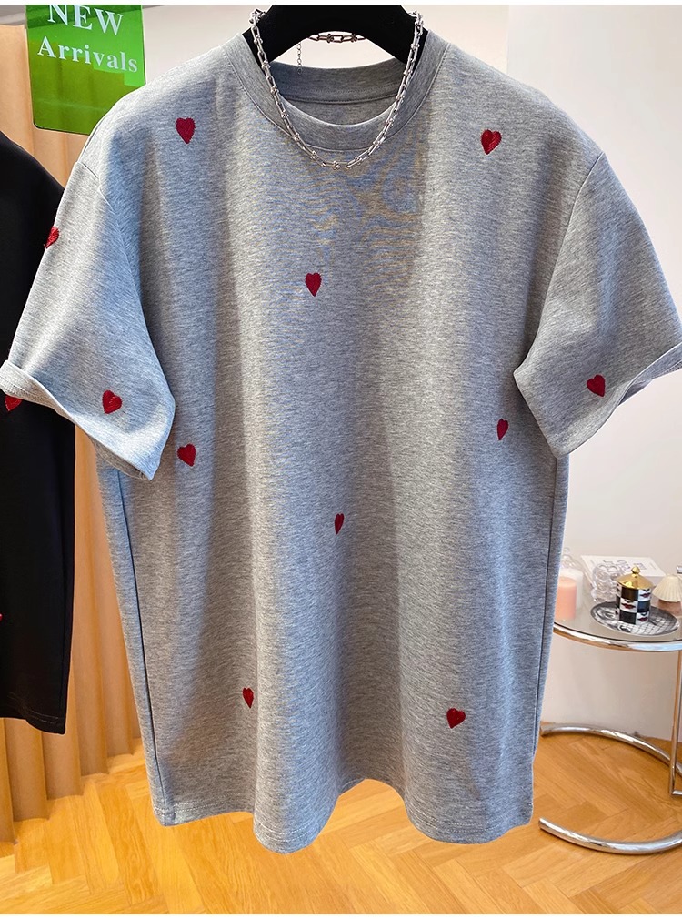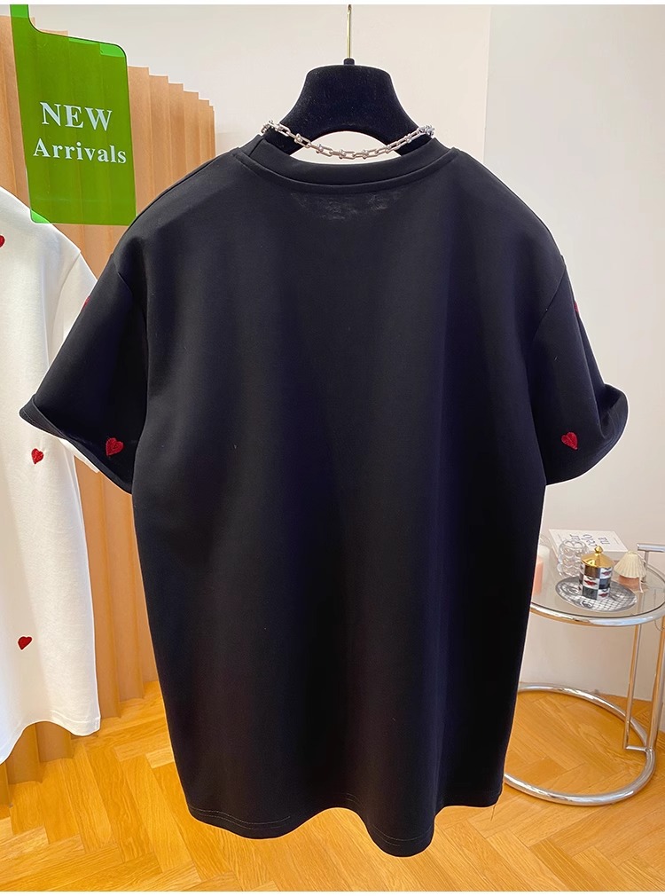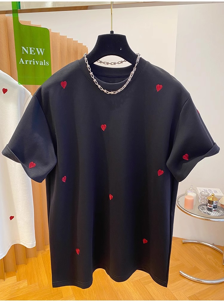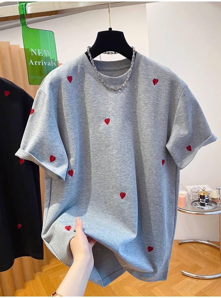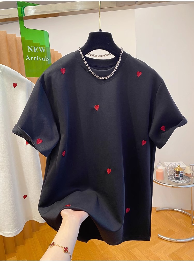 유럽 고급 사랑 자수 티셔츠 여성용 반팔 2025 새로운 느슨한 내부 순수 면베이스 셔츠 탑 봄스토어 가기