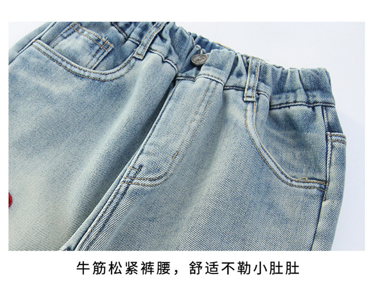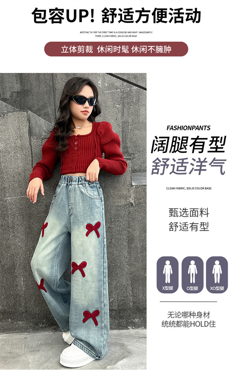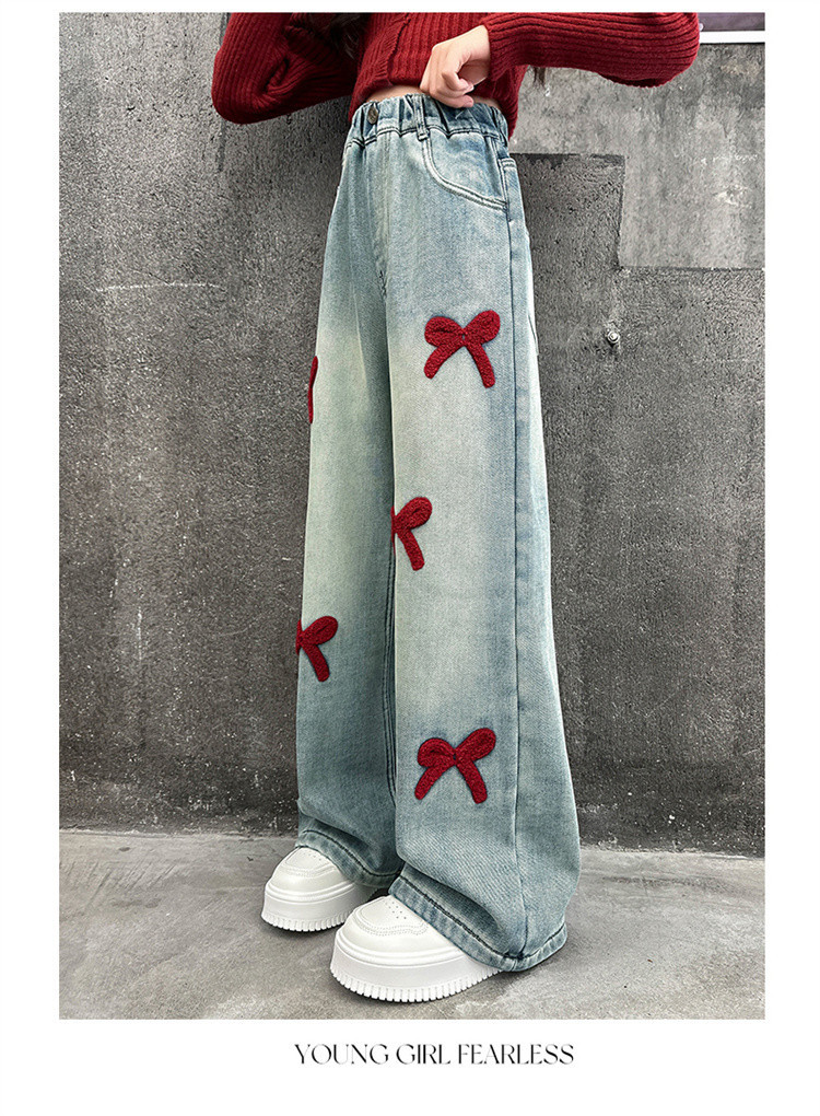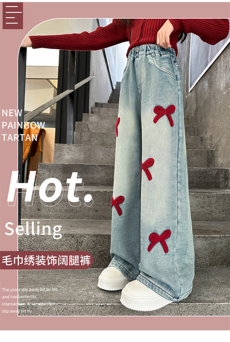 수건 자수 소녀 청바지 2025 년 봄과 가을 새로운 어린이 바지 여성 큰 어린이 직선 다리 바지 소녀 넓은 다리 바지