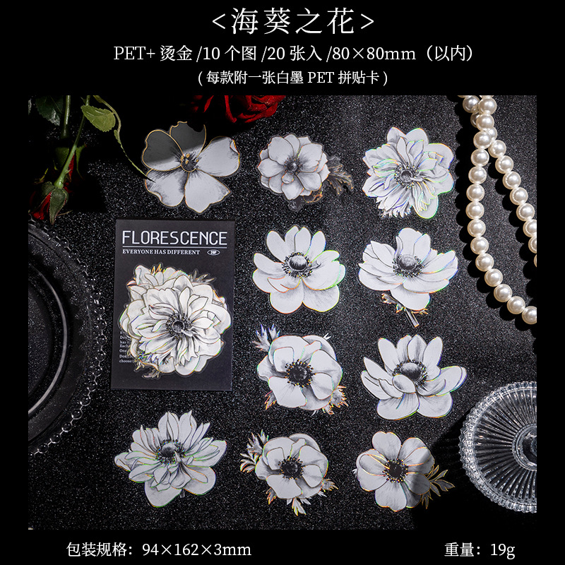 美好的一天PET贴纸黑夜繁花系列轻复古镭射烫金花卉diy拼贴卡装饰