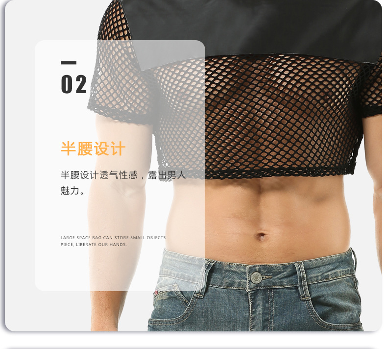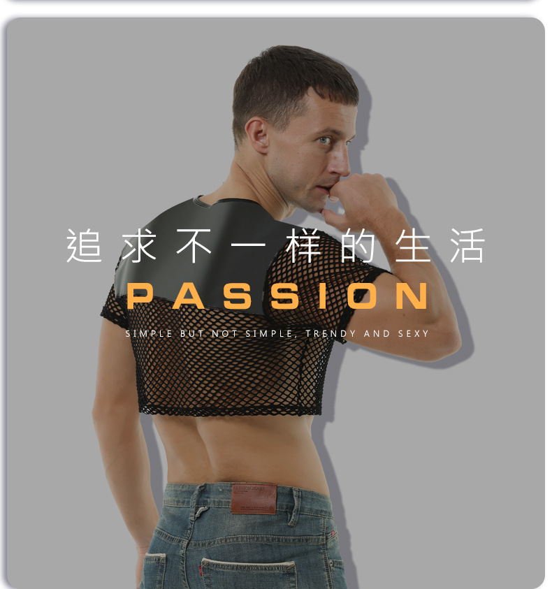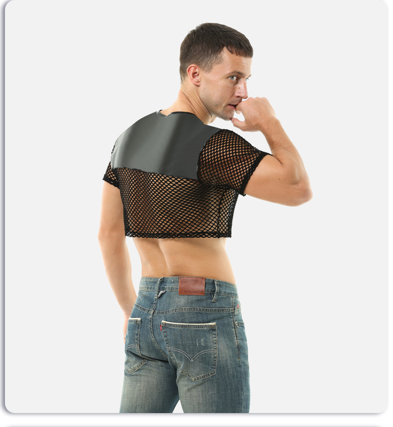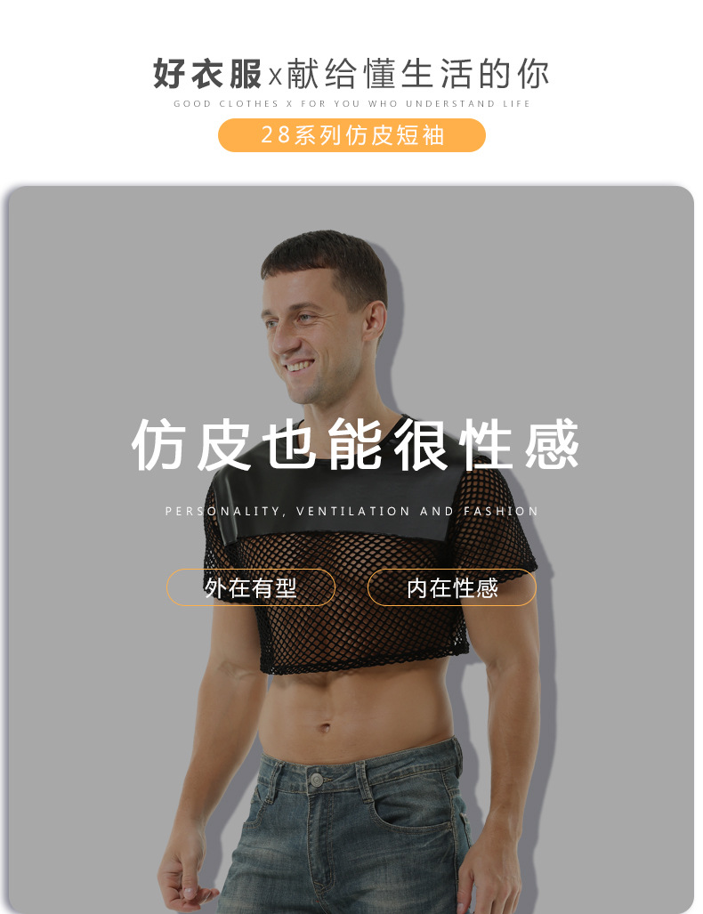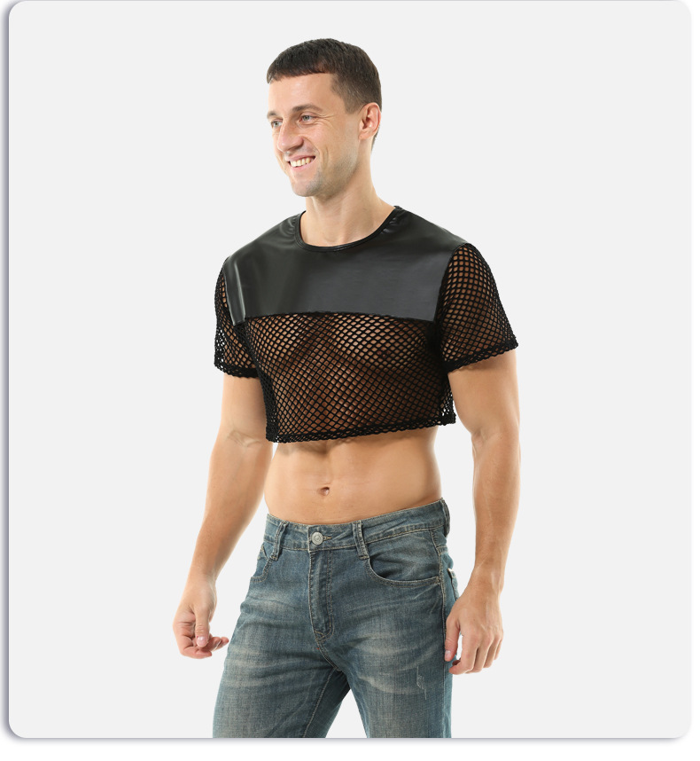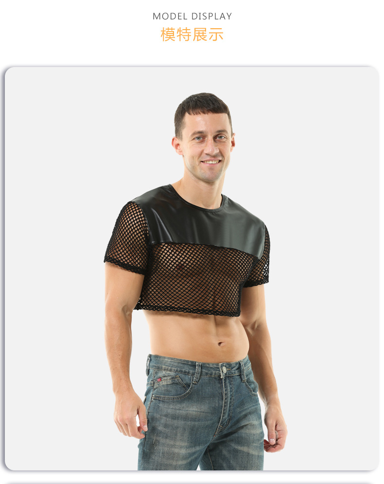 공장 도매 남성 티셔츠 섹시한 coquettish 모조 가죽 투명 승무원 목 낚시 그물 플러스 사이즈 탑 바지 없음스토어 가기
