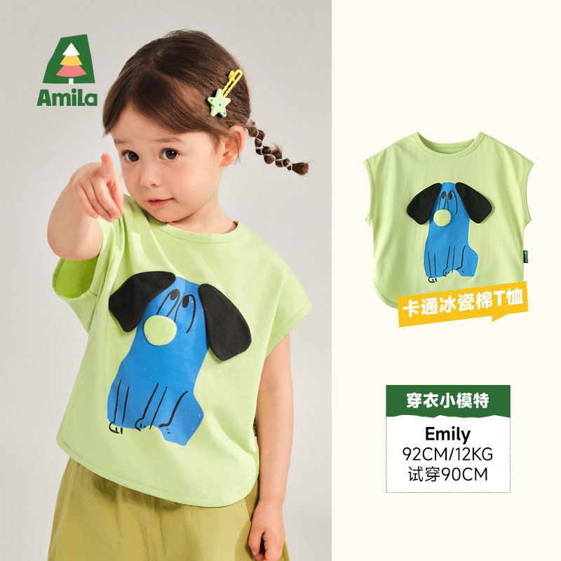 [아이스 도자기 면] Tongbei 아동복 2025 여름 신작 아동 티셔츠 소년과 소녀를위한 귀여운 만화 라운드 넥 탑