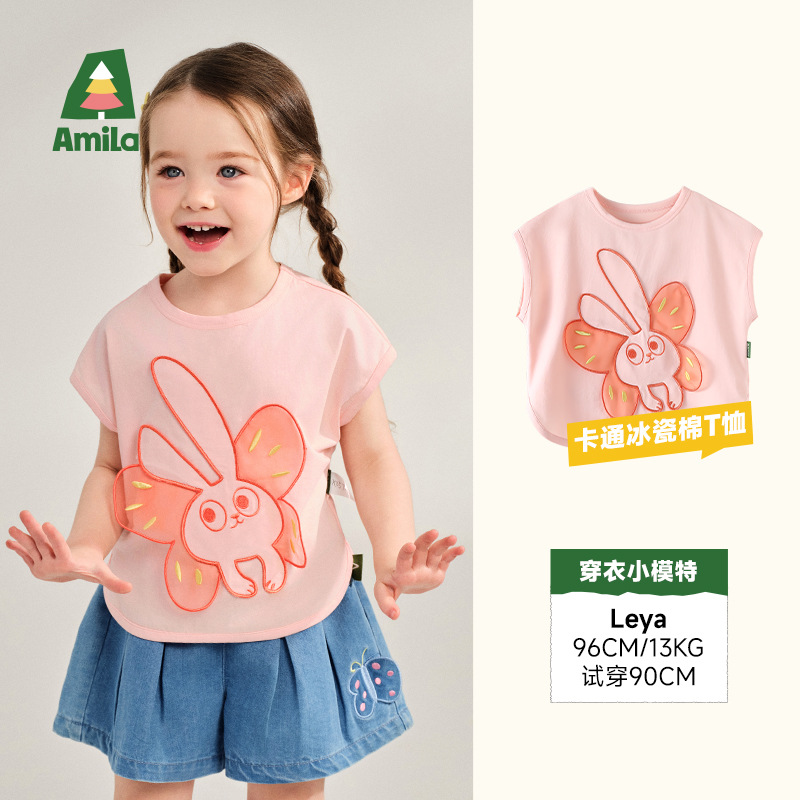 [아이스 도자기 면] Tongbei 아동복 2025 여름 신작 아동 티셔츠 소년과 소녀를위한 귀여운 만화 라운드 넥 탑스토어 가기